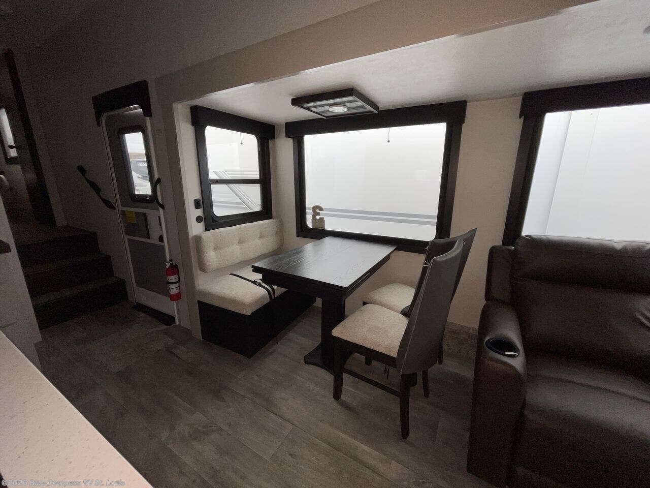 This Sundance Fifth Wheel offers a luxurious living experience on the road! The rear living area is the heart of the RV, featuring a tri-fold sofa that's perfect for relaxation and entertainment. The theater seating provides ample seating for family and friends, while the entertainment center offers endless entertainment options. The kitchen is equipped with a pantry, a kitchen island that offers additional counter space and storage, a refrigerator, a sink that's conveniently located for food preparation and cleanup, and a microwave. Plus, a table with chairs and a bench seat offers a comfortable dining space. The full bathroom is designed for comfort and convenience, providing a private space for personal care. The serene front bedroom features an Olympic bed that provides a comfortable sleeping space
