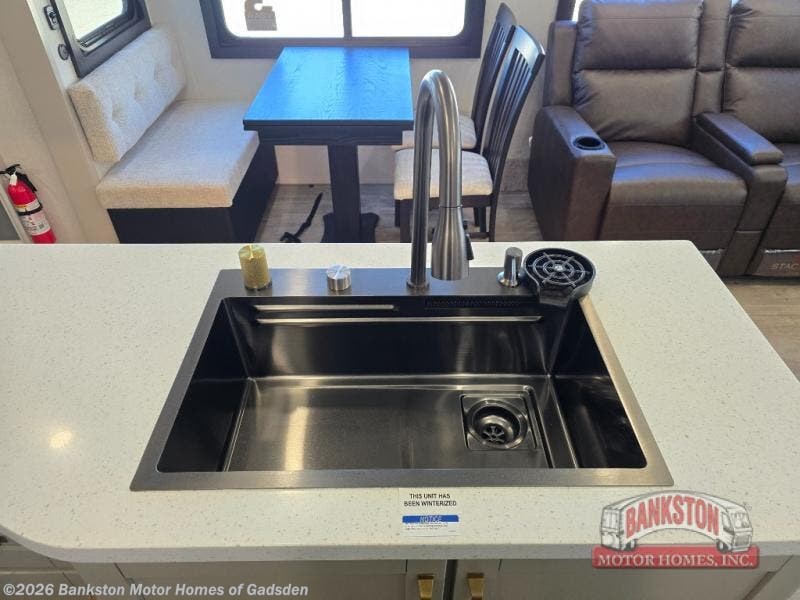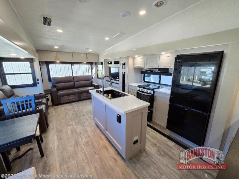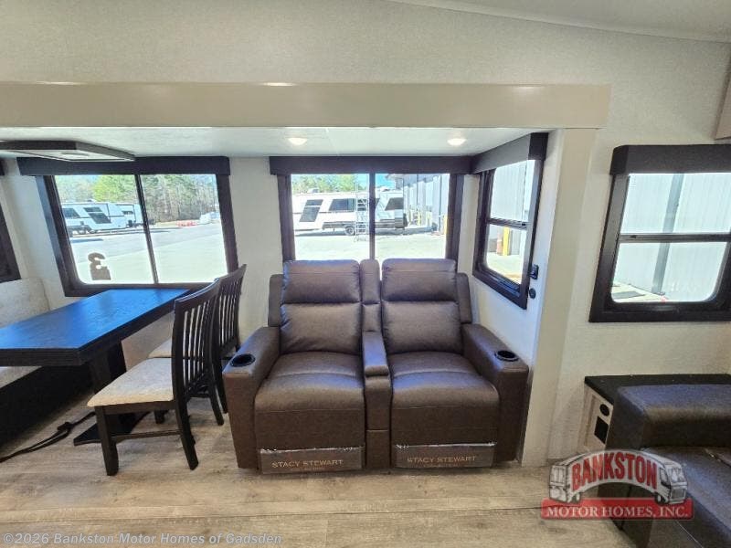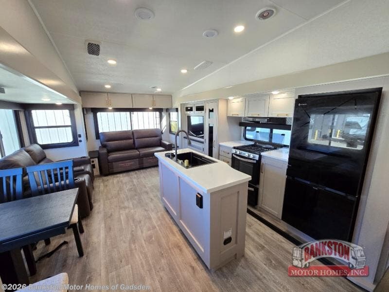 This Sundance Fifth Wheel offers a luxurious living experience on the road! The rear living area is the heart of the RV, featuring a tri-fold sofa that's perfect for relaxation and entertainment. The theater seating provides ample seating for family and friends, while the entertainment center offers endless entertainment options. The kitchen is equipped with a pantry, a kitchen island that offers additional counter space and storage, a refrigerator, a sink that's conveniently located for food preparation and cleanup, and a microwave. Plus, a table with chairs and a bench seat offers a comfortable dining space. The full bathroom is designed for comfort and convenience, providing a private space for personal care. The serene front bedroom features an Olympic bed that provides a comfortable sleeping space