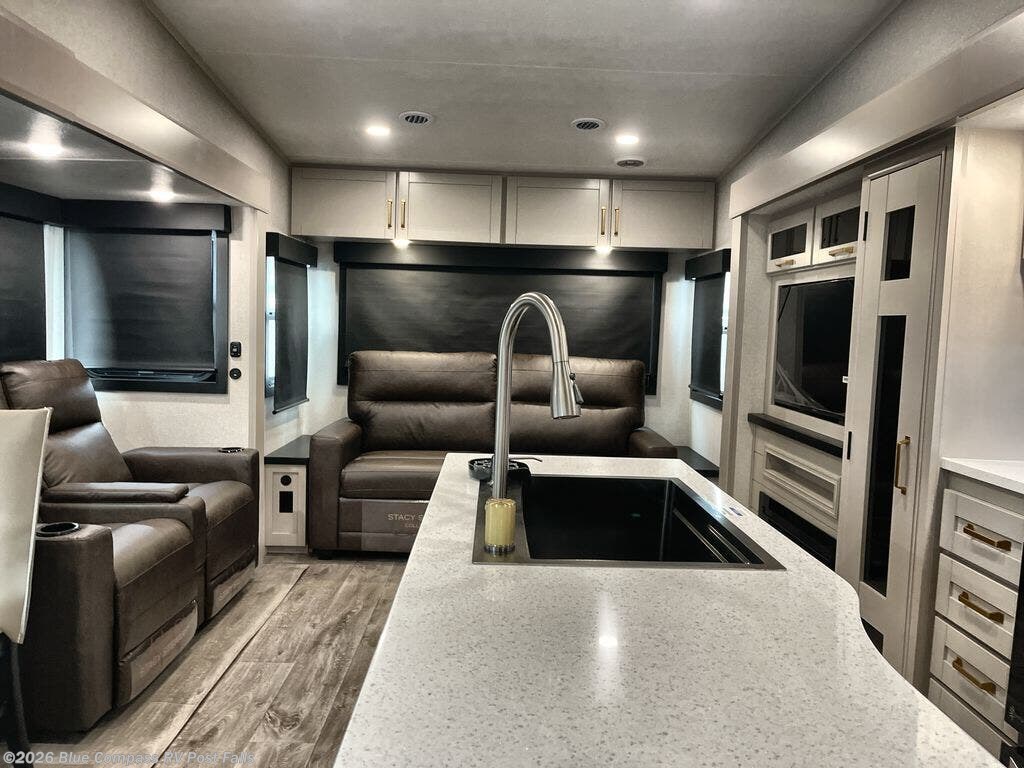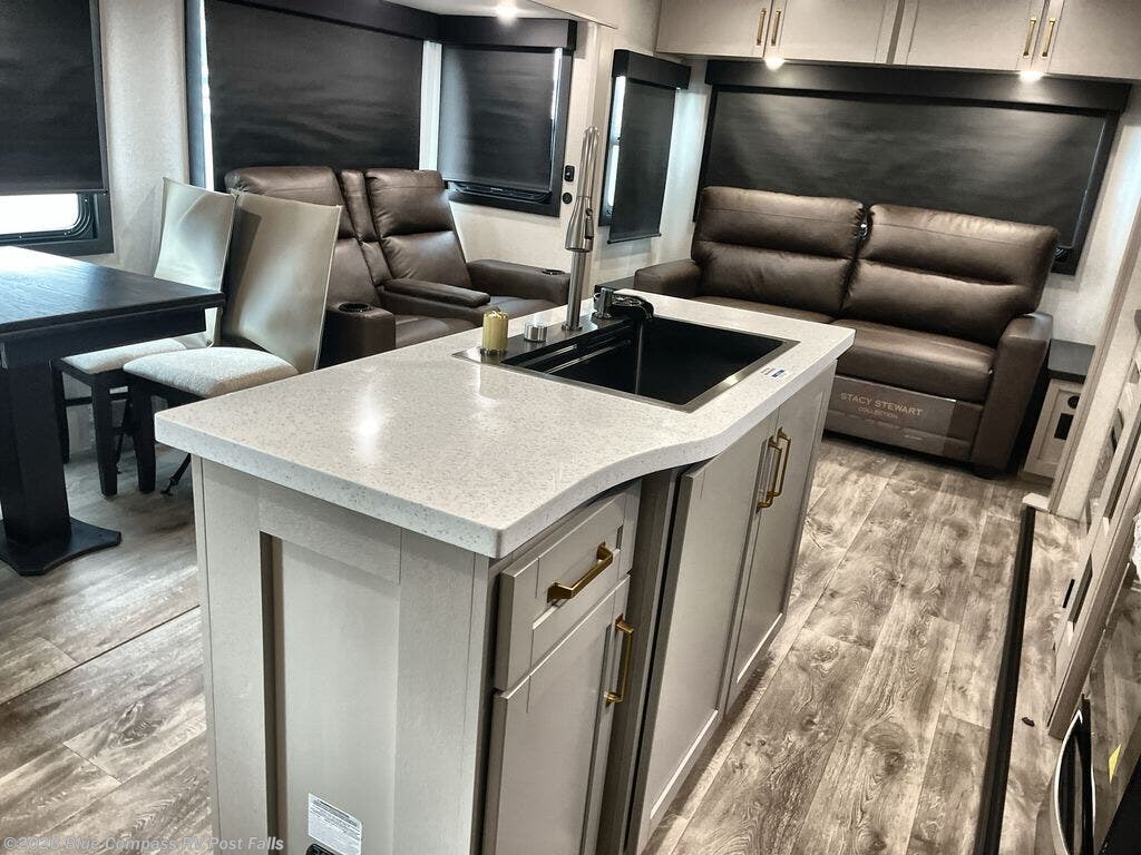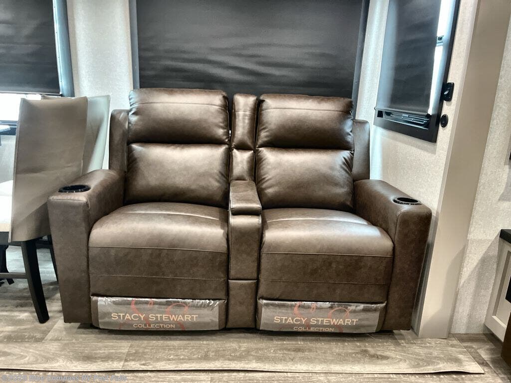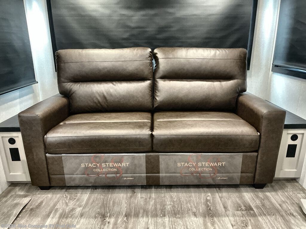 This Sundance Fifth Wheel offers a luxurious living experience on the road! The rear living area is the heart of the RV, featuring a tri-fold sofa that's perfect for relaxation and entertainment. The theater seating provides ample seating for family and friends, while the entertainment center offers endless entertainment options. The kitchen is equipped with a pantry, a kitchen island that offers additional counter space and storage, a refrigerator, a sink that's conveniently located for food preparation and cleanup, and a microwave. Plus, a table with chairs and a bench seat offers a comfortable dining space. The full bathroom is designed for comfort and convenience, providing a private space for personal care. The serene front bedroom features an Olympic bed that provides a comfortable sleeping space