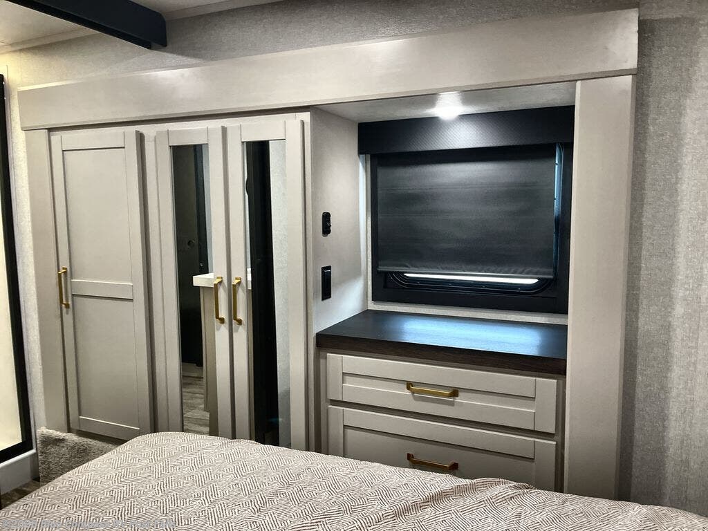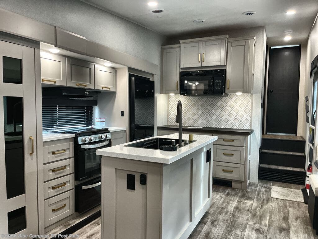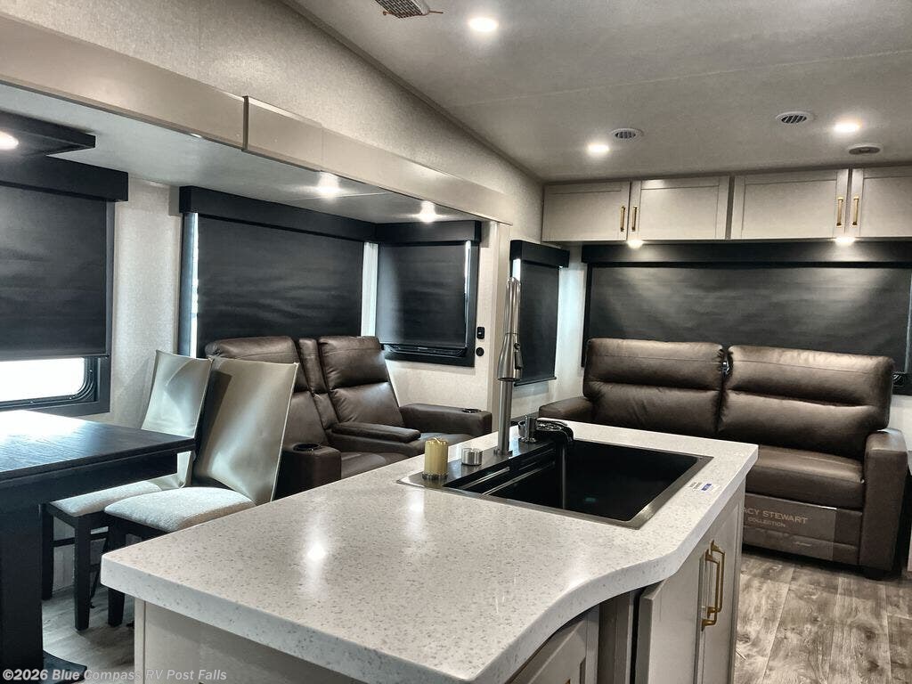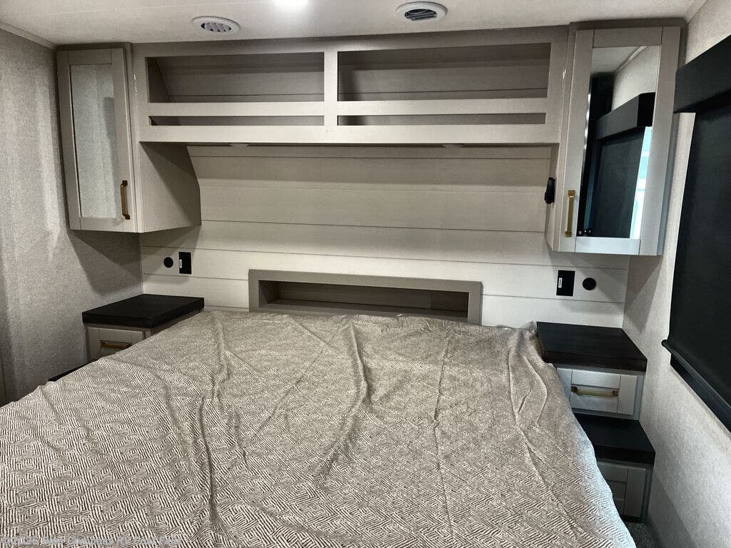 This Sundance Fifth Wheel offers a luxurious living experience on the road! The rear living area is the heart of the RV, featuring a tri-fold sofa that's perfect for relaxation and entertainment. The theater seating provides ample seating for family and friends, while the entertainment center offers endless entertainment options. The kitchen is equipped with a pantry, a kitchen island that offers additional counter space and storage, a refrigerator, a sink that's conveniently located for food preparation and cleanup, and a microwave. Plus, a table with chairs and a bench seat offers a comfortable dining space. The full bathroom is designed for comfort and convenience, providing a private space for personal care. The serene front bedroom features an Olympic bed that provides a comfortable sleeping space