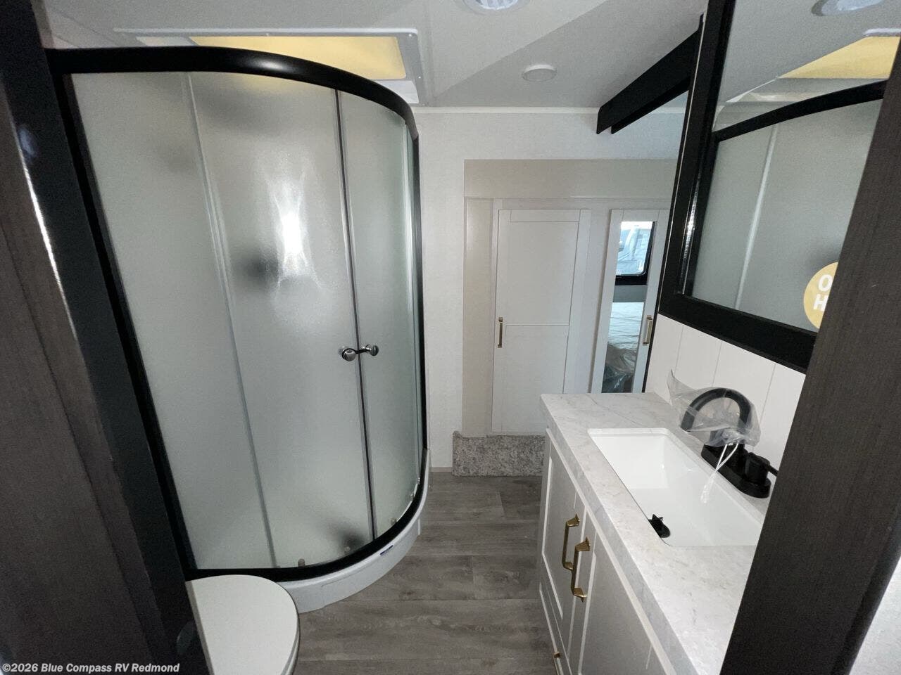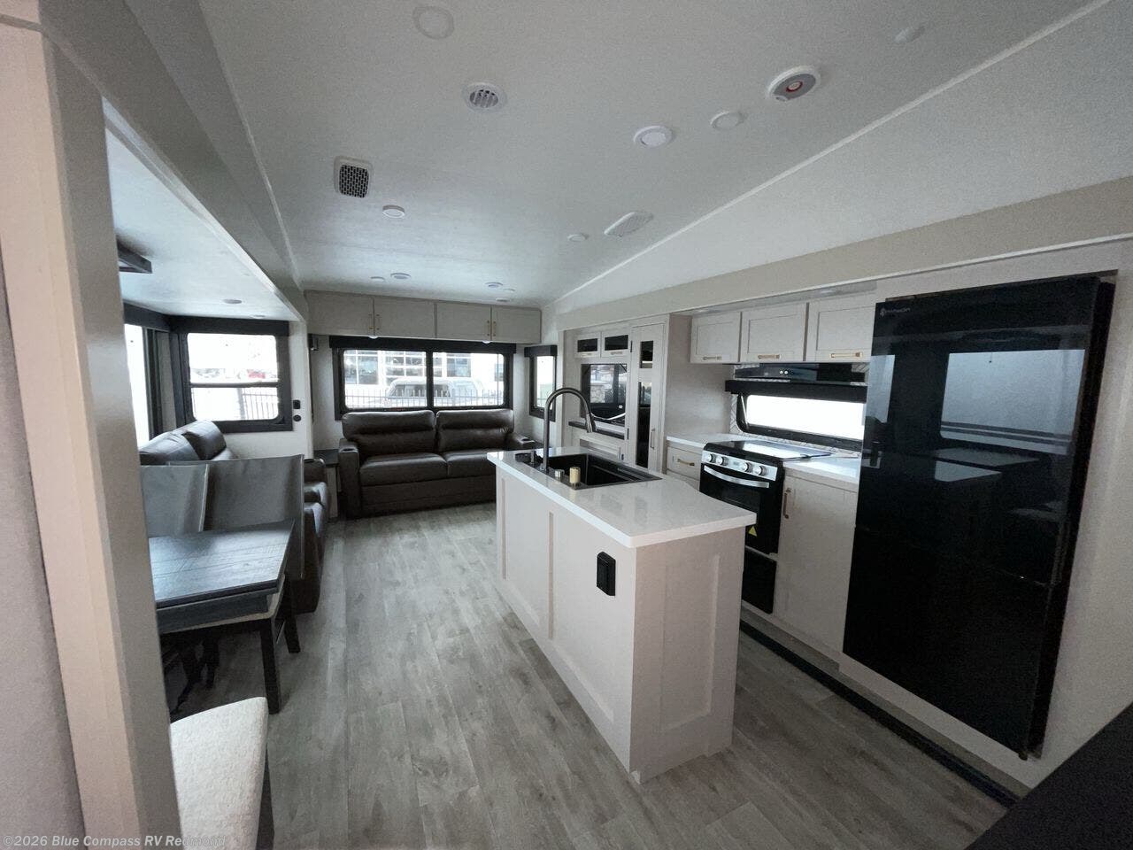 This Sundance Fifth Wheel offers a luxurious living experience on the road! The rear living area is the heart of the RV, featuring a tri-fold sofa that's perfect for relaxation and entertainment. The theater seating provides ample seating for family and friends, while the entertainment center offers endless entertainment options. The kitchen is equipped with a pantry, a kitchen island that offers additional counter space and storage, a refrigerator, a sink that's conveniently located for food preparation and cleanup, and a microwave. Plus, a table with chairs and a bench seat offers a comfortable dining space. The full bathroom is designed for comfort and convenience, providing a private space for personal care. The serene front bedroom features an Olympic bed that provides a comfortable sleeping space