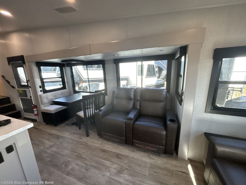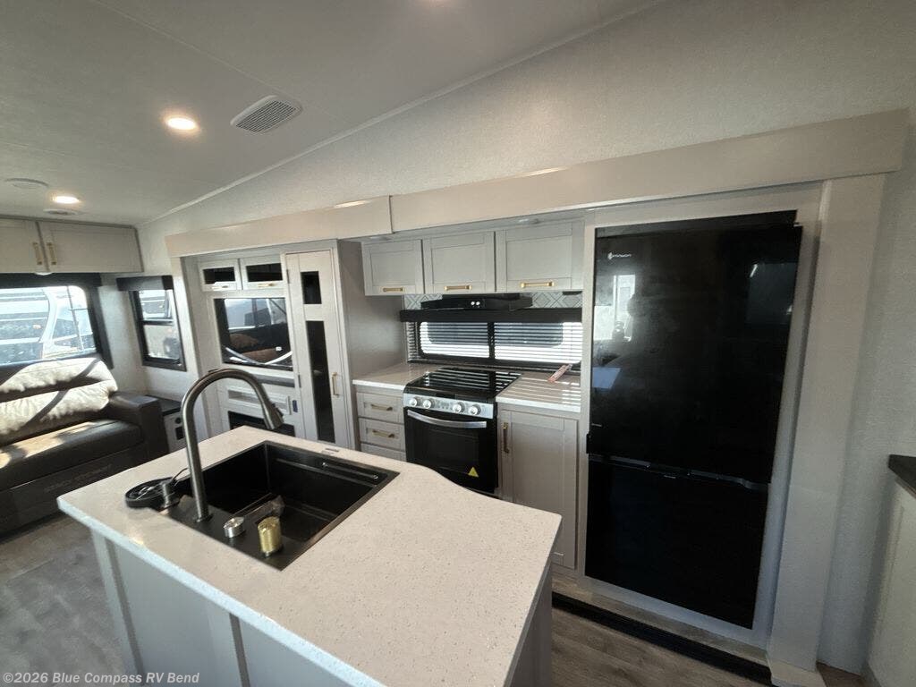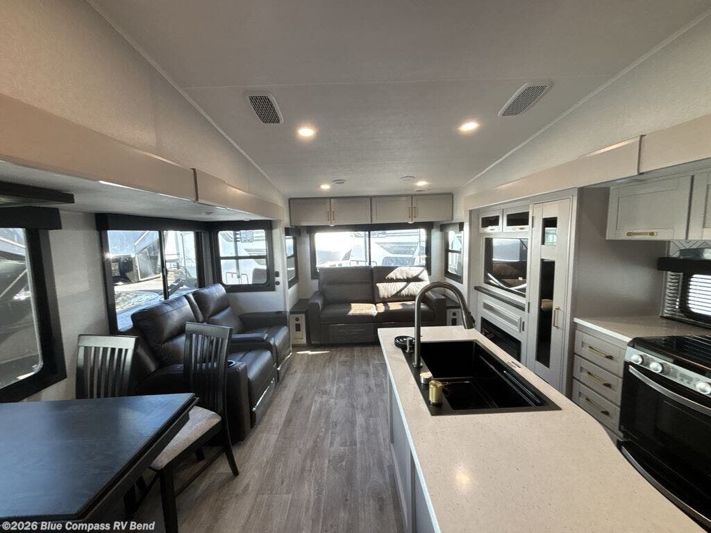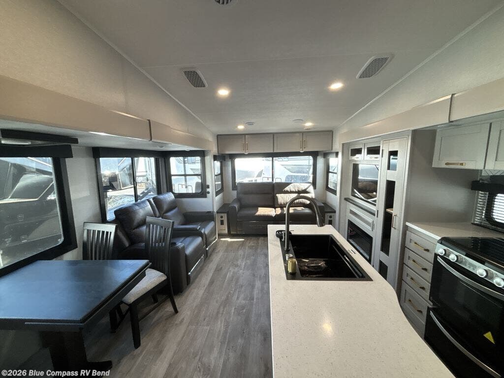 This Sundance Fifth Wheel offers a luxurious living experience on the road! The rear living area is the heart of the RV, featuring a tri-fold sofa that's perfect for relaxation and entertainment. The theater seating provides ample seating for family and friends, while the entertainment center offers endless entertainment options. The kitchen is equipped with a pantry, a kitchen island that offers additional counter space and storage, a refrigerator, a sink that's conveniently located for food preparation and cleanup, and a microwave. Plus, a table with chairs and a bench seat offers a comfortable dining space. The full bathroom is designed for comfort and convenience, providing a private space for personal care. The serene front bedroom features an Olympic bed that provides a comfortable sleeping space