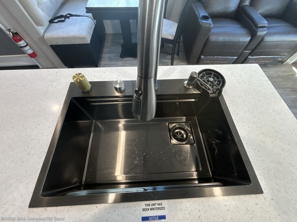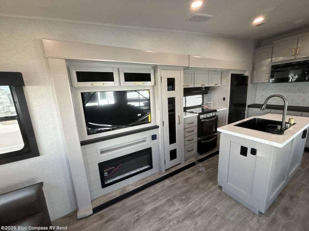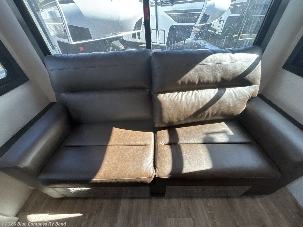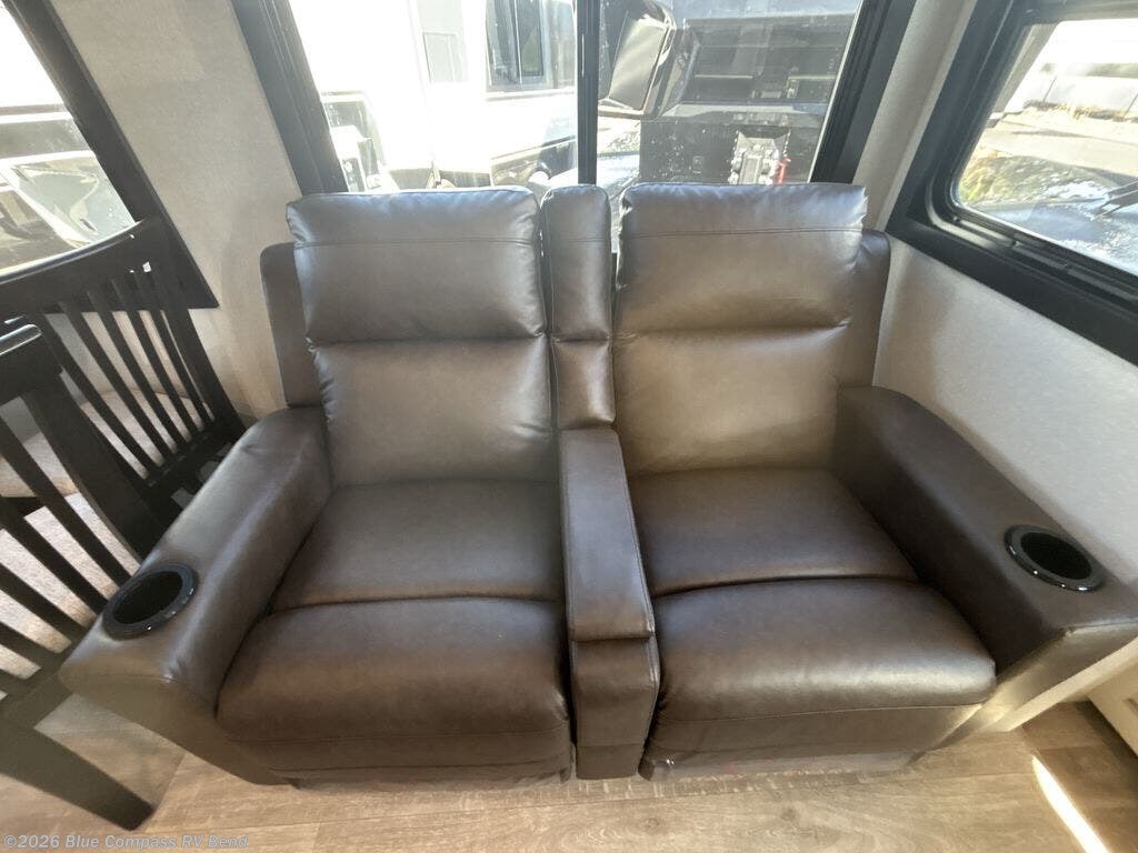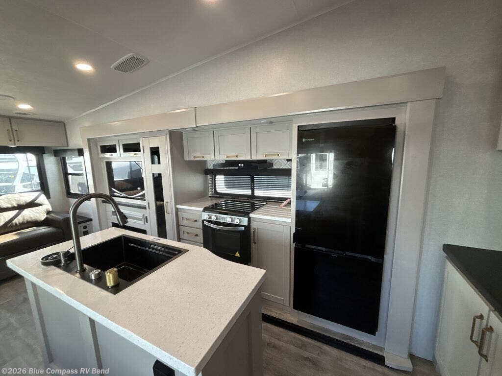 This Sundance Fifth Wheel offers a luxurious living experience on the road! The rear living area is the heart of the RV, featuring a tri-fold sofa that's perfect for relaxation and entertainment. The theater seating provides ample seating for family and friends, while the entertainment center offers endless entertainment options. The kitchen is equipped with a pantry, a kitchen island that offers additional counter space and storage, a refrigerator, a sink that's conveniently located for food preparation and cleanup, and a microwave. Plus, a table with chairs and a bench seat offers a comfortable dining space. The full bathroom is designed for comfort and convenience, providing a private space for personal care. The serene front bedroom features an Olympic bed that provides a comfortable sleeping space