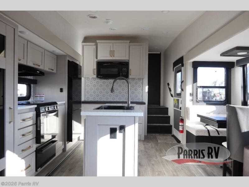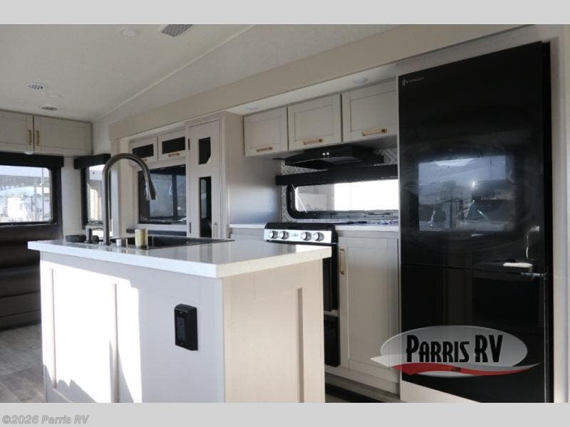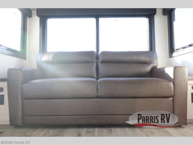 This Sundance Fifth Wheel offers a luxurious living experience on the road! The rear living area is the heart of the RV, featuring a tri-fold sofa that's perfect for relaxation and entertainment. The theater seating provides ample seating for family and friends, while the entertainment center offers endless entertainment options. The kitchen is equipped with a pantry, a kitchen island that offers additional counter space and storage, a refrigerator, a sink that's conveniently located for food preparation and cleanup, and a microwave. Plus, a table with chairs and a bench seat offers a comfortable dining space. The full bathroom is designed for comfort and convenience, providing a private space for personal care. The serene front bedroom features an Olympic bed that provides a comfortable sleeping space
