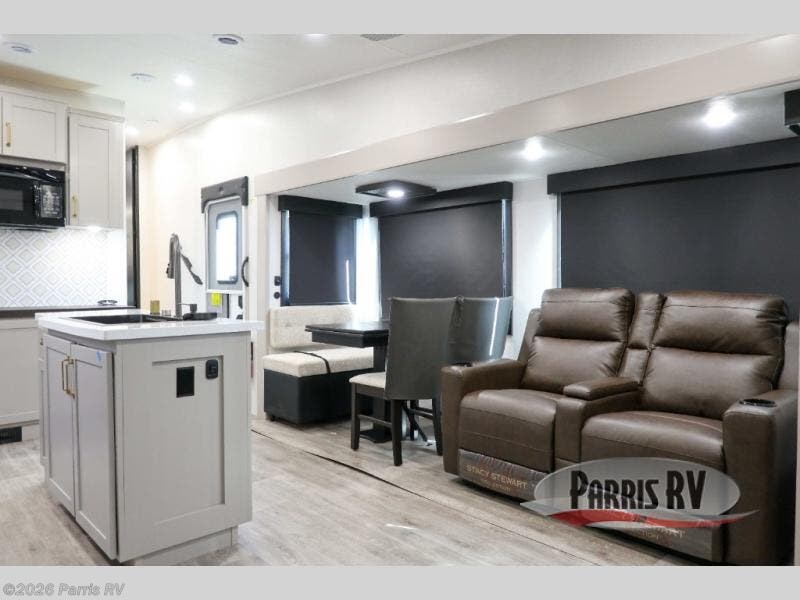 This Sundance Fifth Wheel offers a luxurious living experience on the road! The rear living area is the heart of the RV, featuring a tri-fold sofa that's perfect for relaxation and entertainment. The theater seating provides ample seating for family and friends, while the entertainment center offers endless entertainment options. The kitchen is equipped with a pantry, a kitchen island that offers additional counter space and storage, a refrigerator, a sink that's conveniently located for food preparation and cleanup, and a microwave. Plus, a table with chairs and a bench seat offers a comfortable dining space. The full bathroom is designed for comfort and convenience, providing a private space for personal care. The serene front bedroom features an Olympic bed that provides a comfortable sleeping space