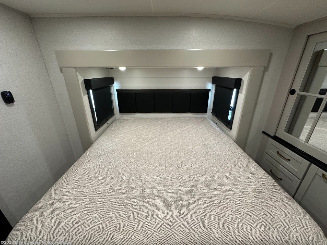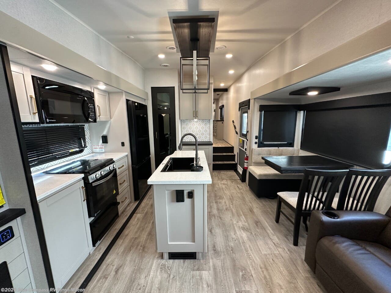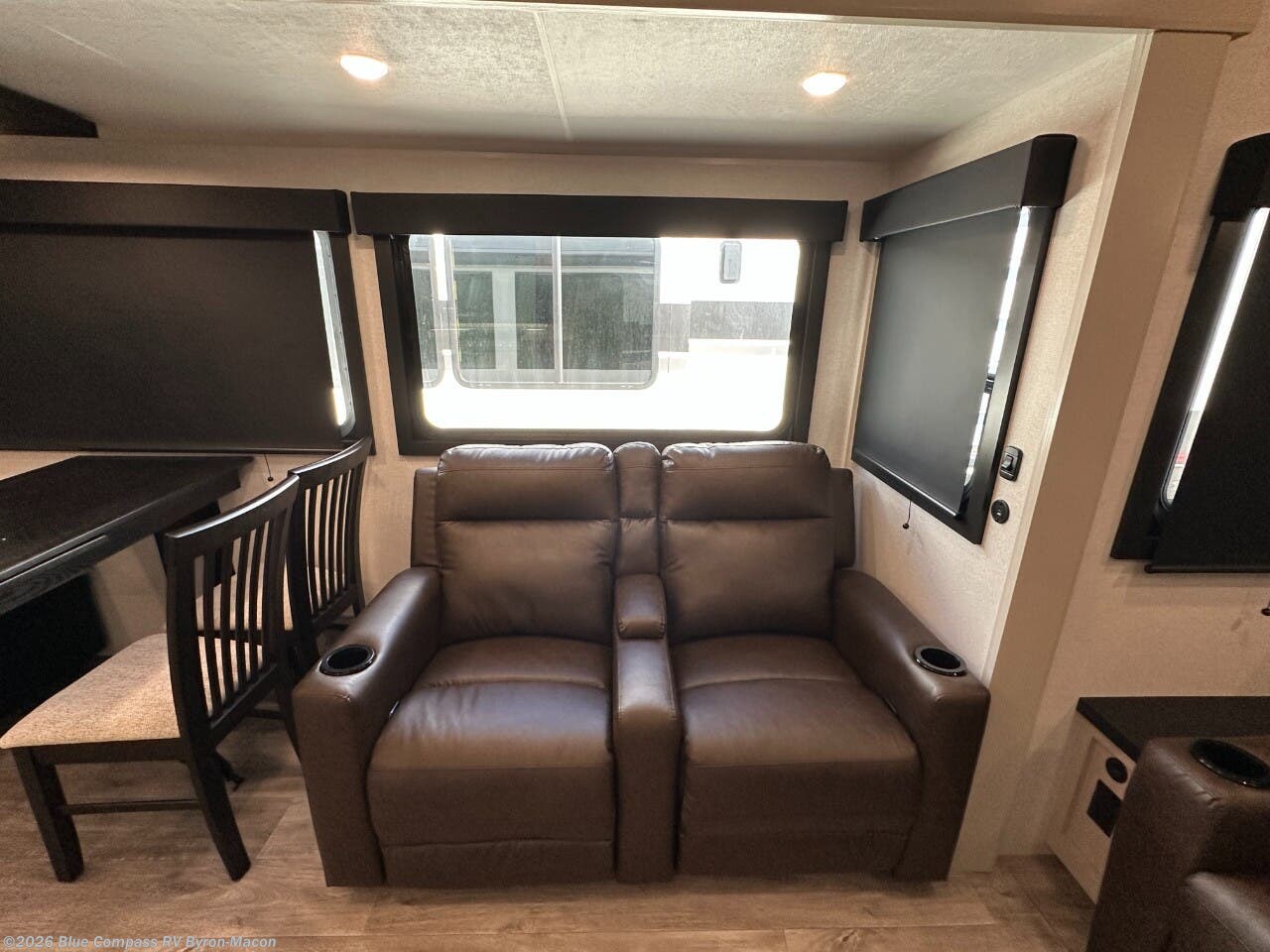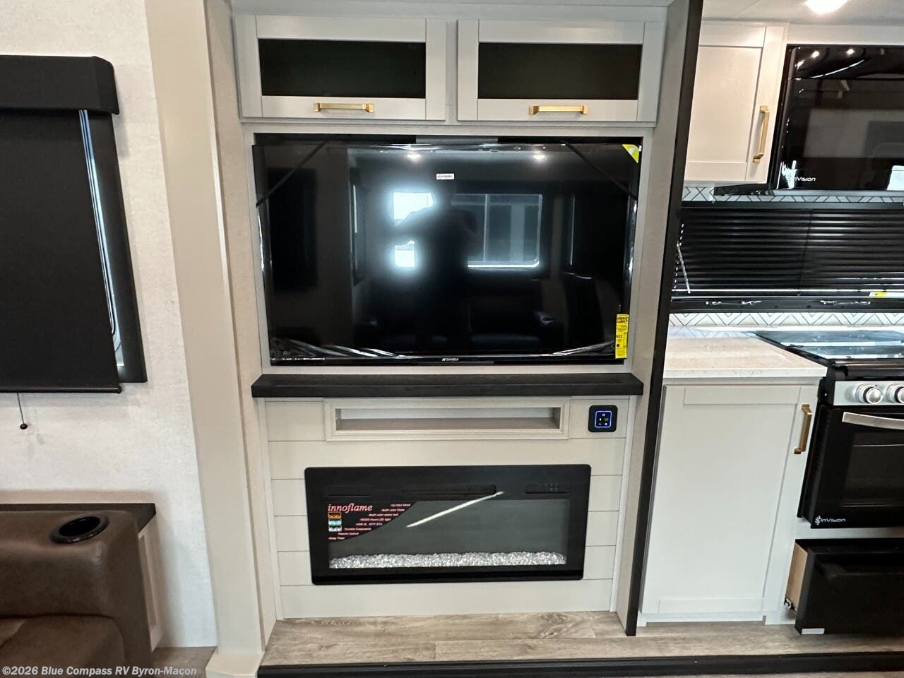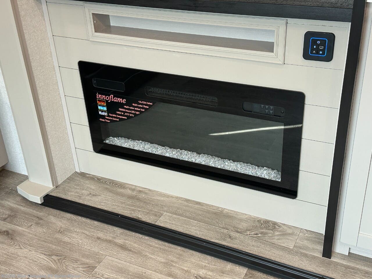 This RV offers a luxurious living experience on the road. The rear living area boasts a tri-fold sofa, a theater sofa that provides ample seating for relaxation and entertainment, and the entertainment center with a fireplace is the perfect spot to unwind on chilly evenings, while the ceiling fan keeps the air circulating on warm days. The kitchen is equipped with a kitchen island that provides additional counter space and storage, a microwave, a 12V refrigerator, a table with chairs and a bench seat that offers a comfortable dining space. Plus, the hutch and pantry provide ample storage for dishes, cookware, and food. The full bathroom is designed for comfort and convenience. The front bedroom is a serene retreat, featuring a king bed and a dresser that provide a comfortable sleeping space for sleeping tight all night long.