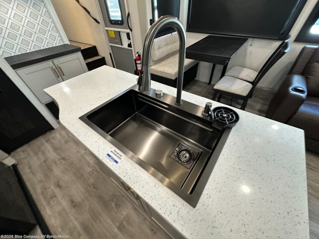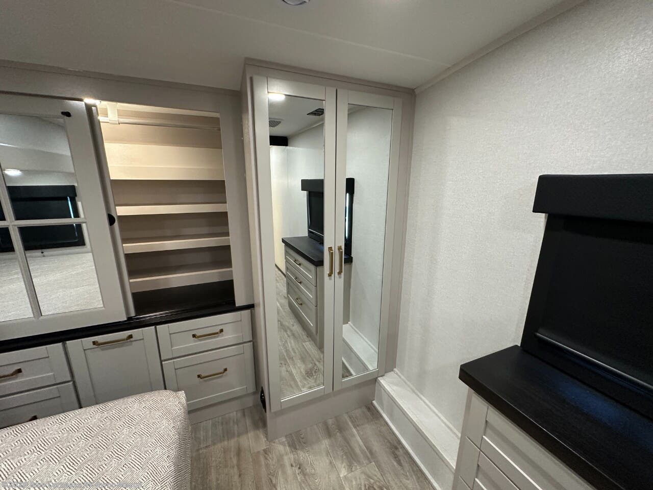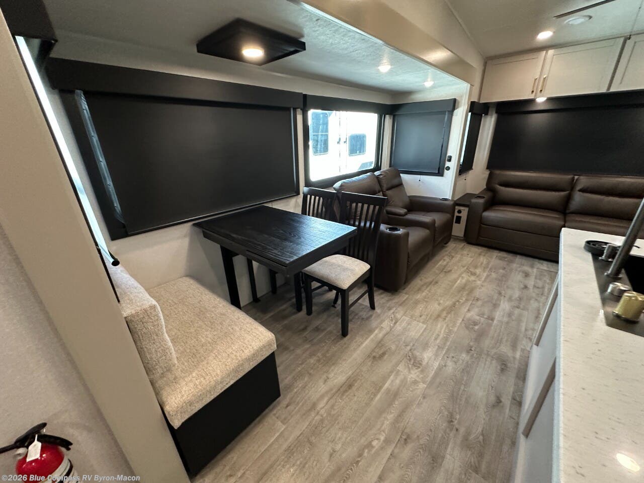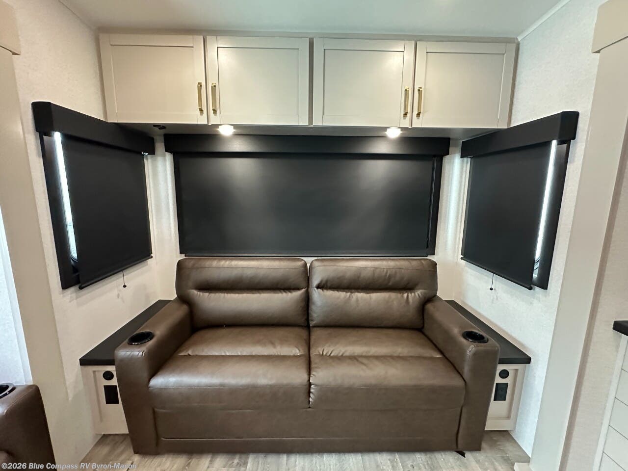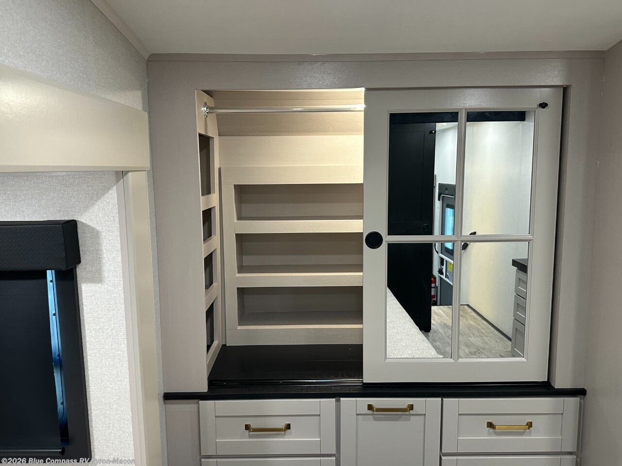 This RV offers a luxurious living experience on the road. The rear living area boasts a tri-fold sofa, a theater sofa that provides ample seating for relaxation and entertainment, and the entertainment center with a fireplace is the perfect spot to unwind on chilly evenings, while the ceiling fan keeps the air circulating on warm days. The kitchen is equipped with a kitchen island that provides additional counter space and storage, a microwave, a 12V refrigerator, a table with chairs and a bench seat that offers a comfortable dining space. Plus, the hutch and pantry provide ample storage for dishes, cookware, and food. The full bathroom is designed for comfort and convenience. The front bedroom is a serene retreat, featuring a king bed and a dresser that provide a comfortable sleeping space for sleeping tight all night long.