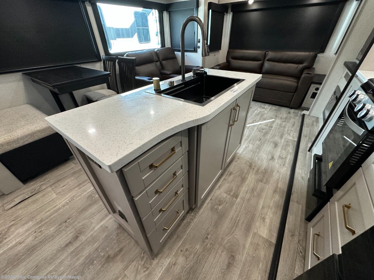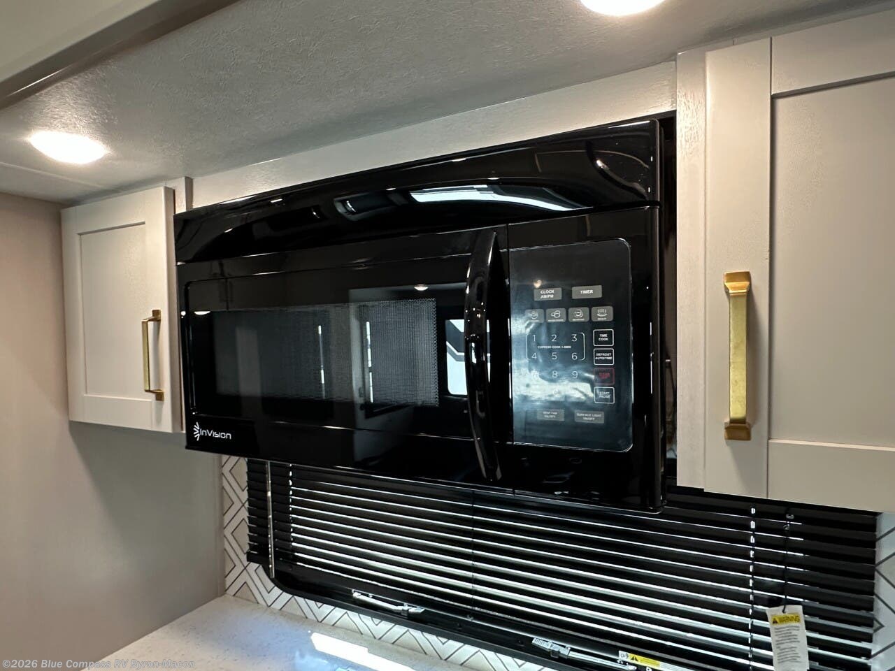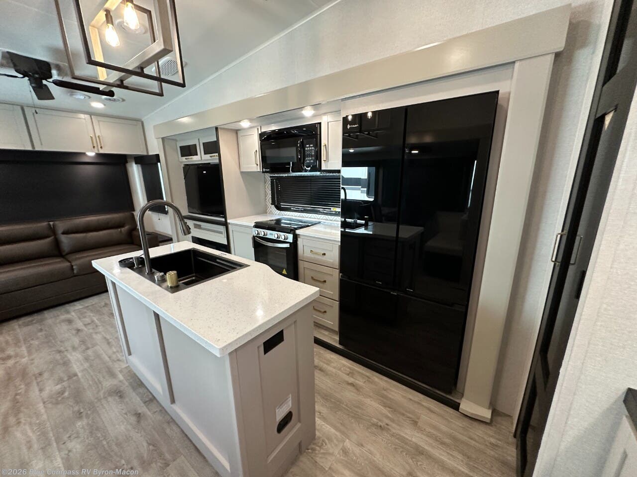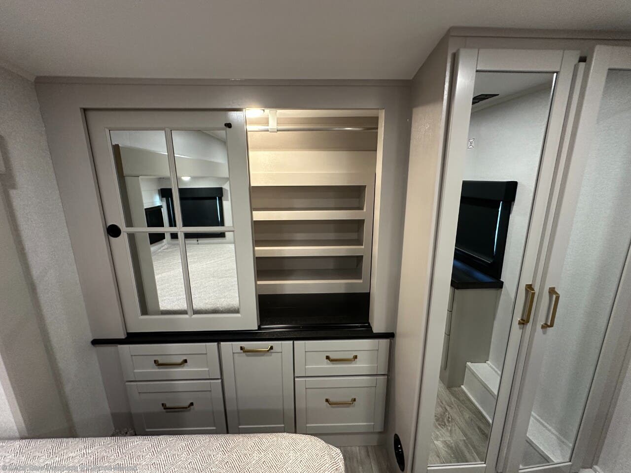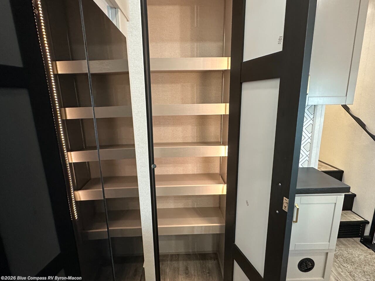This RV offers a luxurious living experience on the road. The rear living area boasts a tri-fold sofa, a theater sofa that provides ample seating for relaxation and entertainment, and the entertainment center with a fireplace is the perfect spot to unwind on chilly evenings, while the ceiling fan keeps the air circulating on warm days. The kitchen is equipped with a kitchen island that provides additional counter space and storage, a microwave, a 12V refrigerator, a table with chairs and a bench seat that offers a comfortable dining space. Plus, the hutch and pantry provide ample storage for dishes, cookware, and food. The full bathroom is designed for comfort and convenience. The front bedroom is a serene retreat, featuring a king bed and a dresser that provide a comfortable sleeping space for sleeping tight all night long.