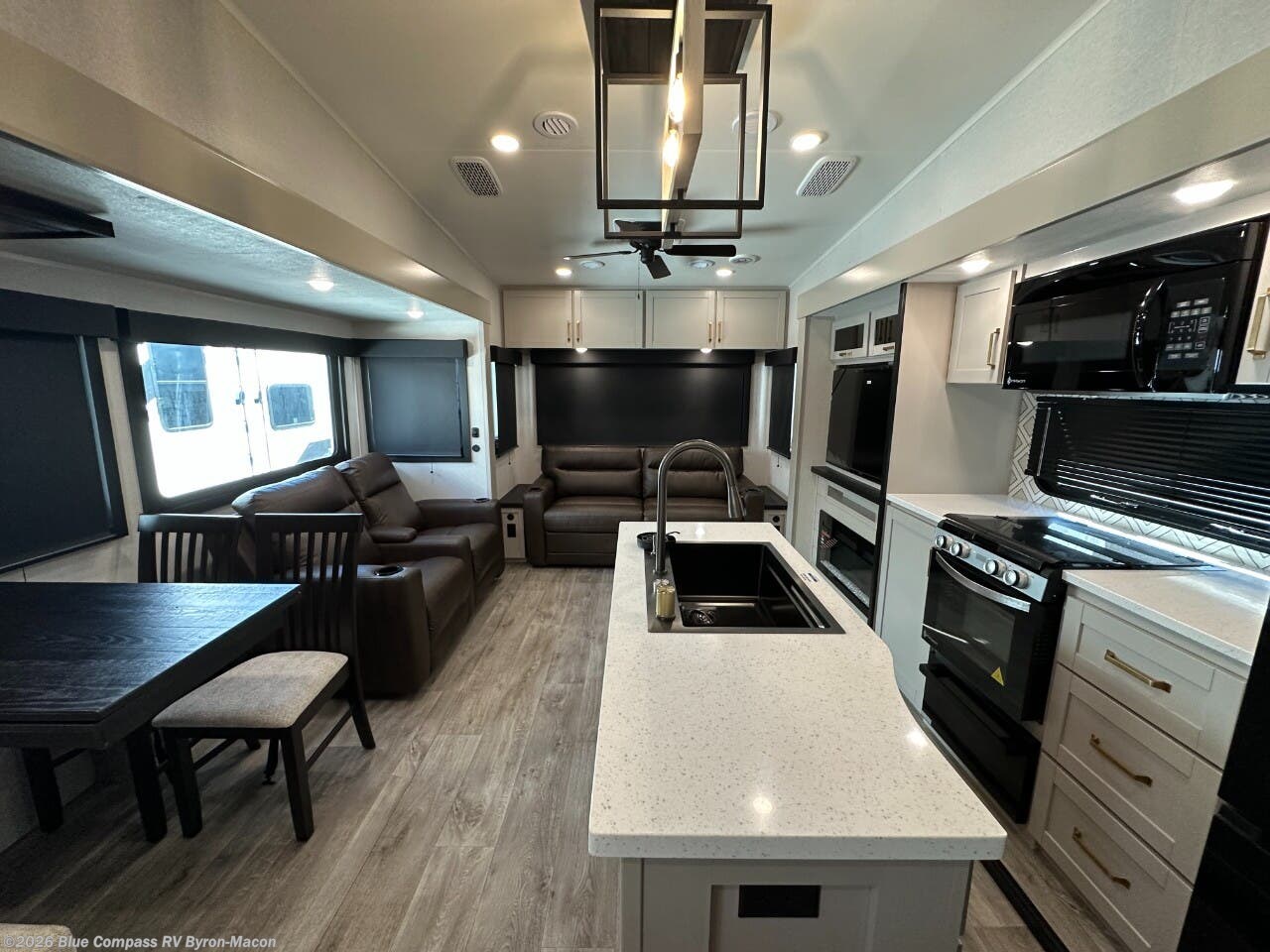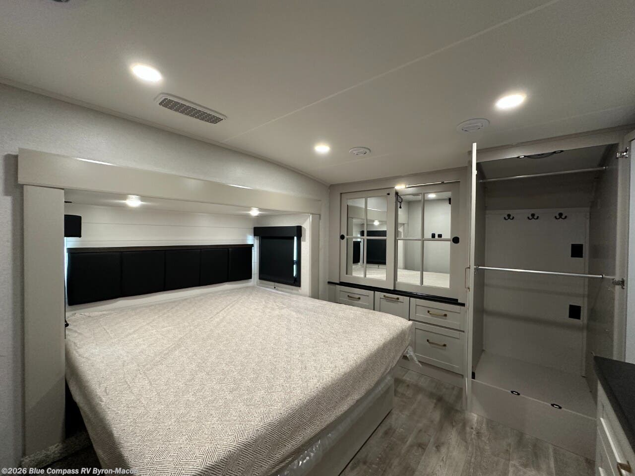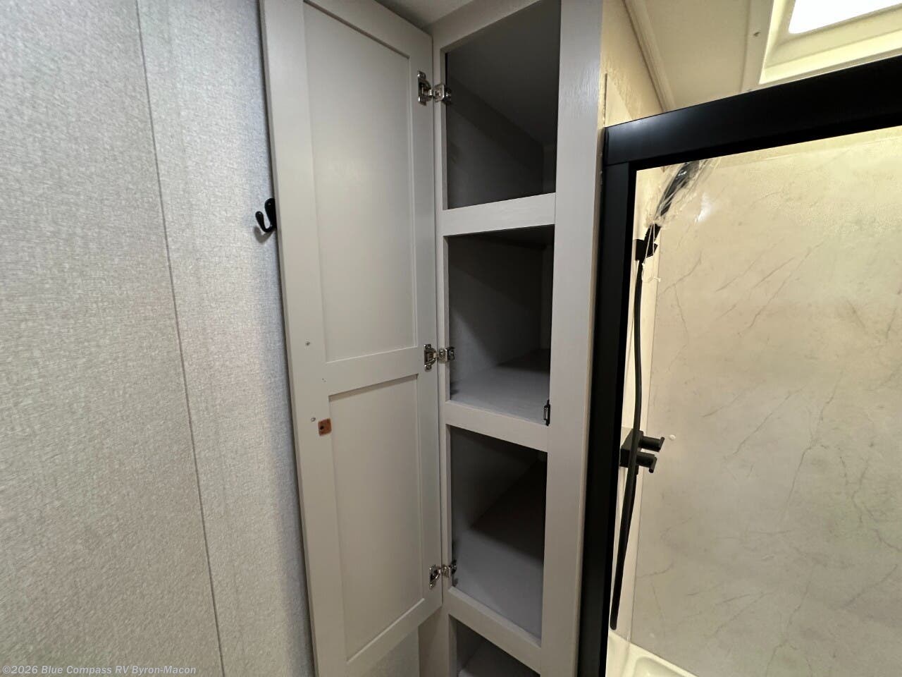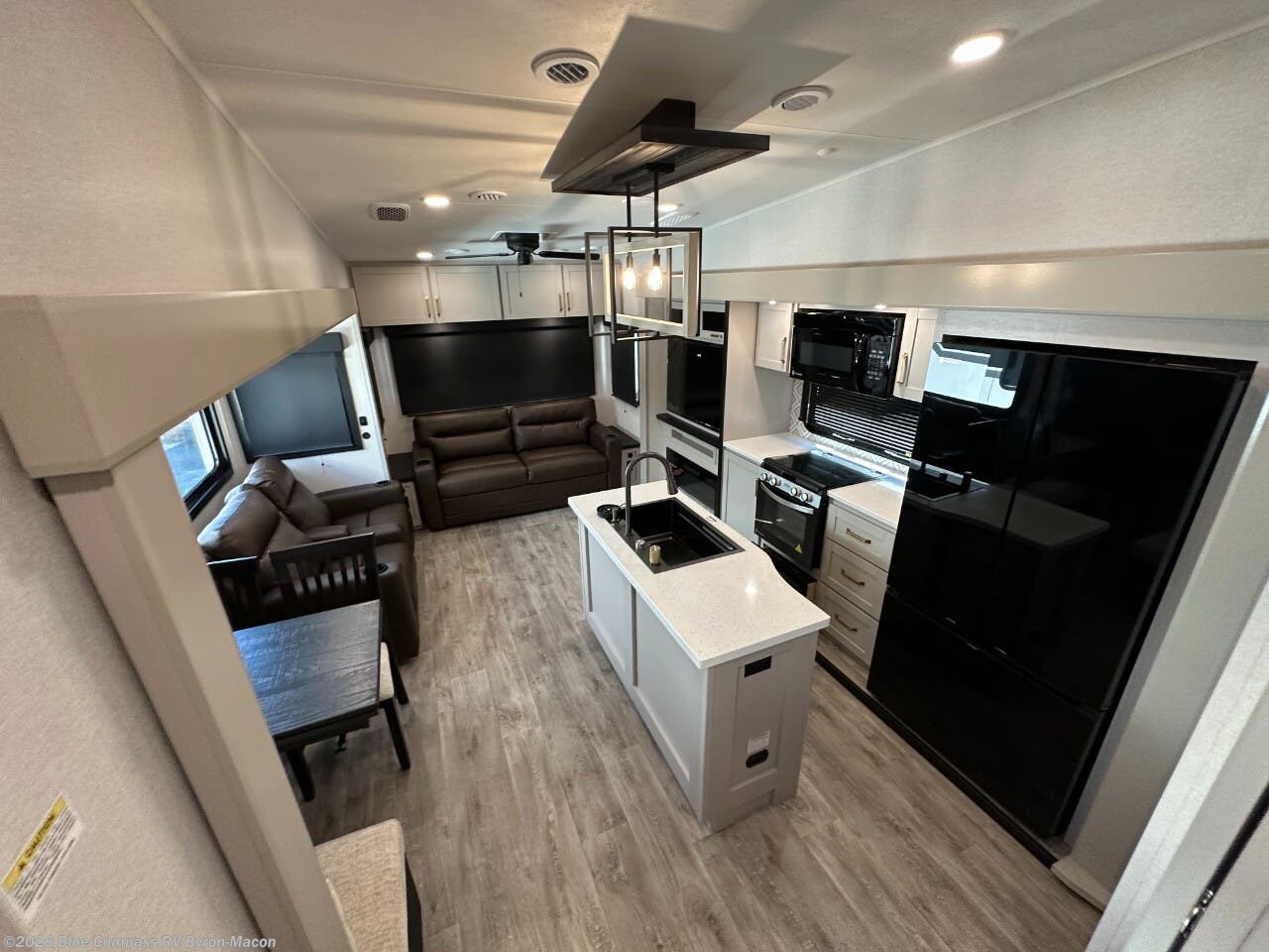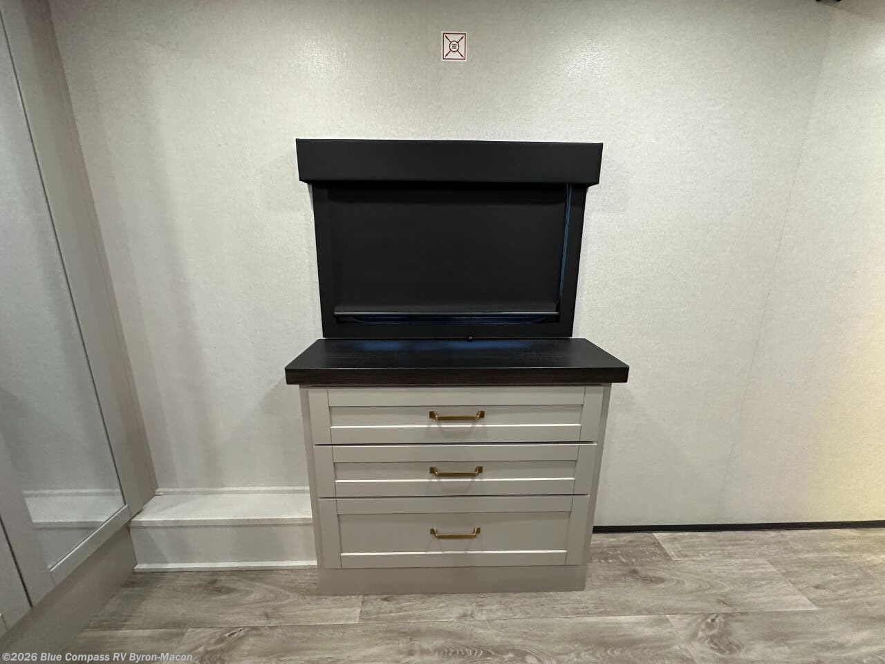 This RV offers a luxurious living experience on the road. The rear living area boasts a tri-fold sofa, a theater sofa that provides ample seating for relaxation and entertainment, and the entertainment center with a fireplace is the perfect spot to unwind on chilly evenings, while the ceiling fan keeps the air circulating on warm days. The kitchen is equipped with a kitchen island that provides additional counter space and storage, a microwave, a 12V refrigerator, a table with chairs and a bench seat that offers a comfortable dining space. Plus, the hutch and pantry provide ample storage for dishes, cookware, and food. The full bathroom is designed for comfort and convenience. The front bedroom is a serene retreat, featuring a king bed and a dresser that provide a comfortable sleeping space for sleeping tight all night long.