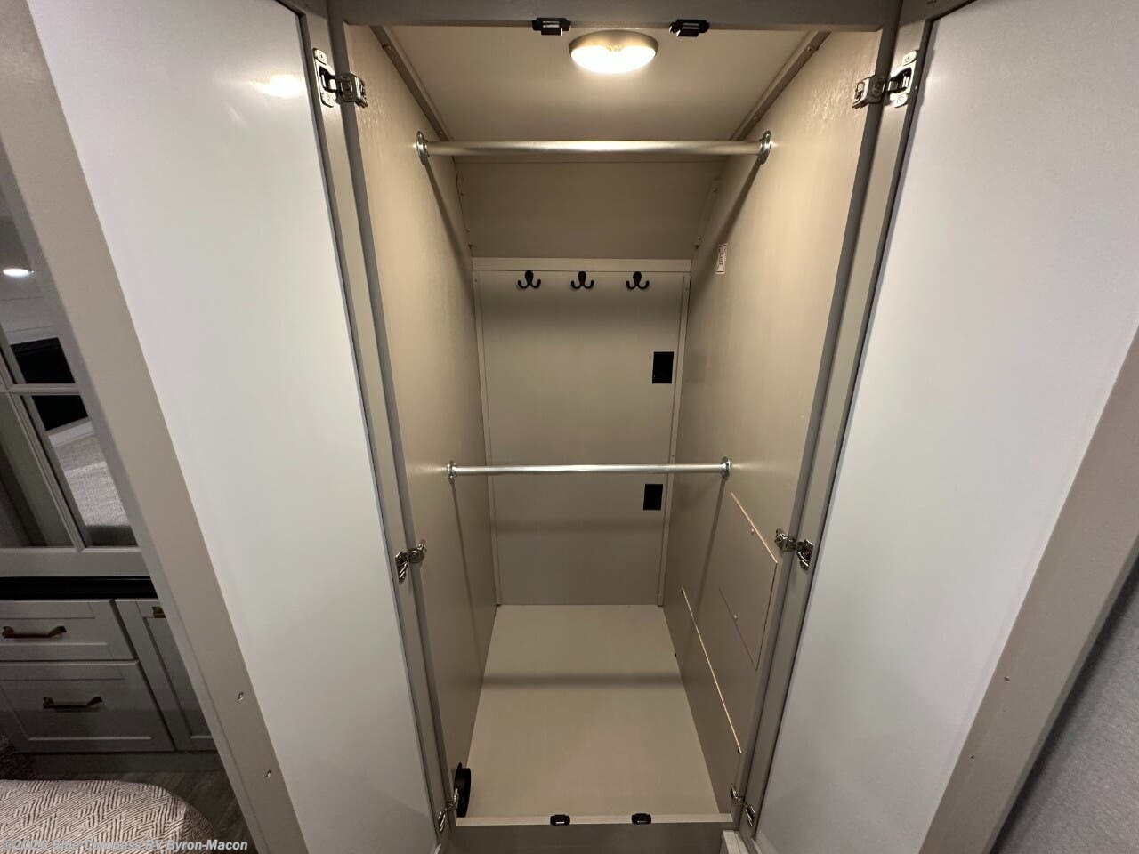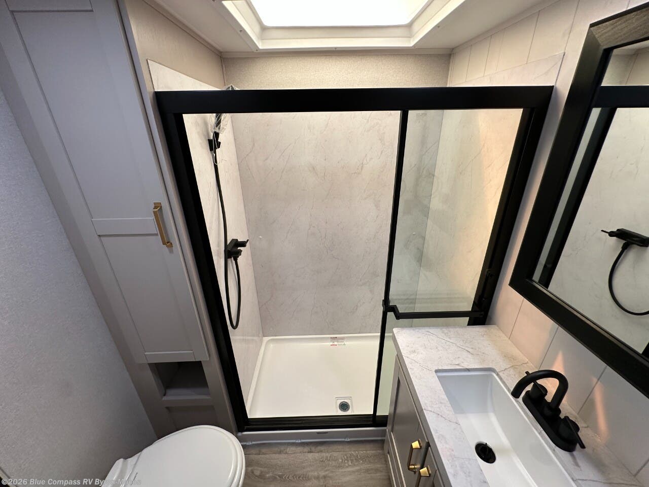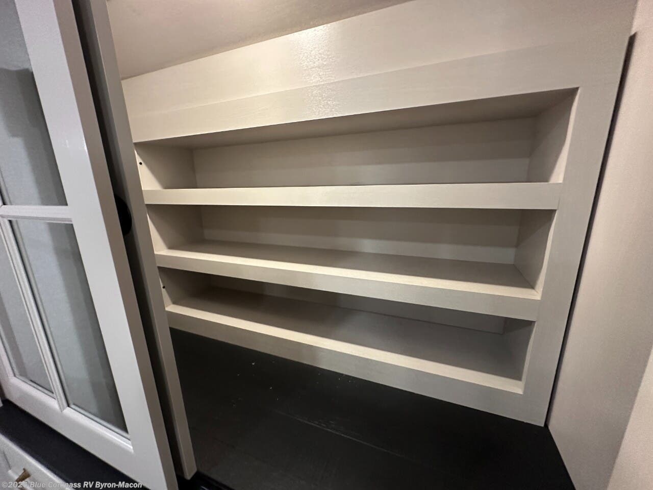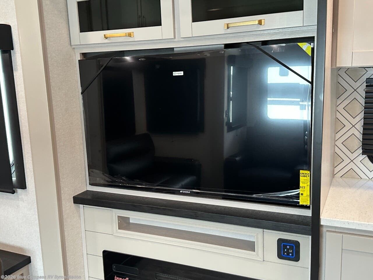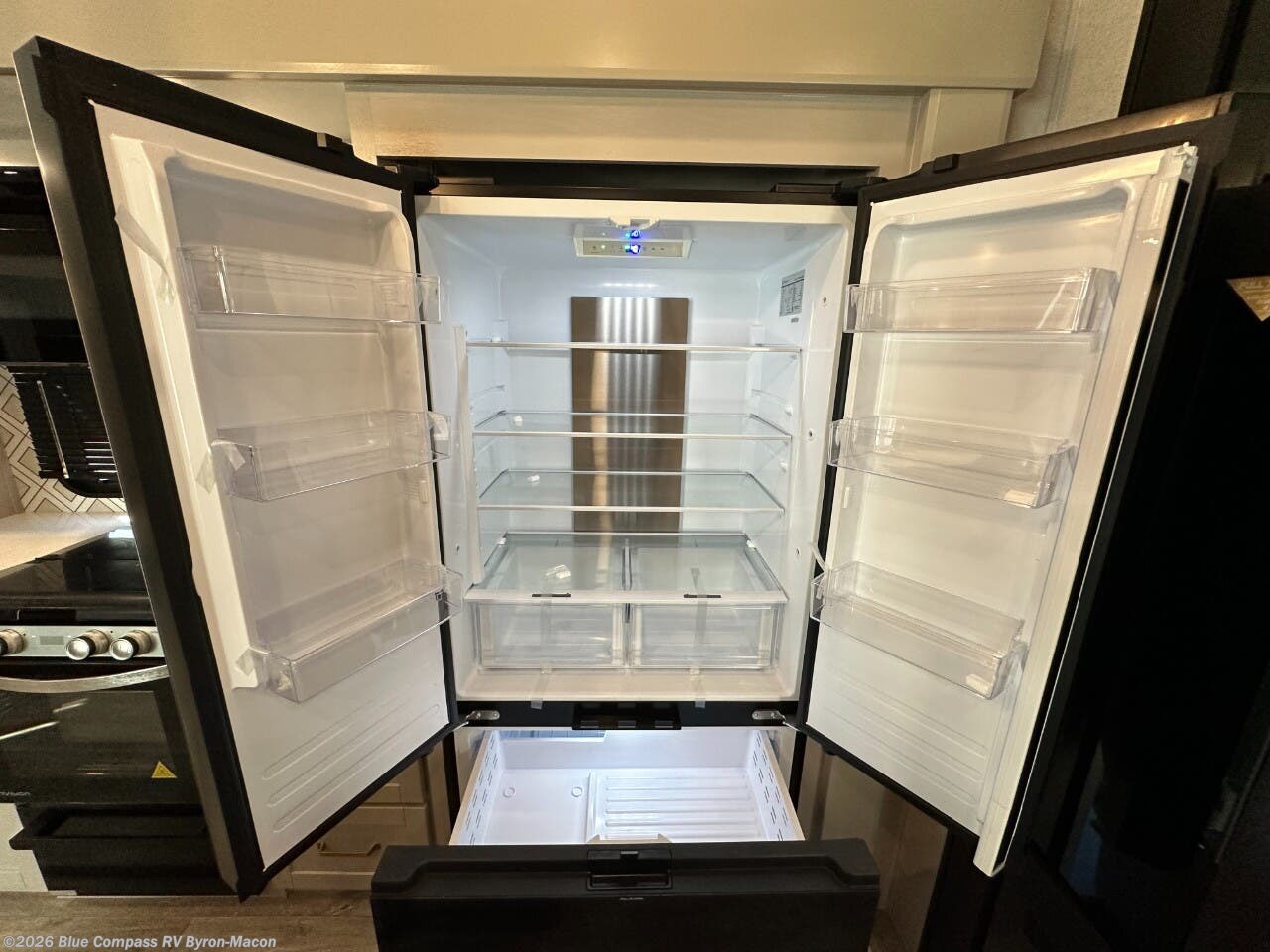 This RV offers a luxurious living experience on the road. The rear living area boasts a tri-fold sofa, a theater sofa that provides ample seating for relaxation and entertainment, and the entertainment center with a fireplace is the perfect spot to unwind on chilly evenings, while the ceiling fan keeps the air circulating on warm days. The kitchen is equipped with a kitchen island that provides additional counter space and storage, a microwave, a 12V refrigerator, a table with chairs and a bench seat that offers a comfortable dining space. Plus, the hutch and pantry provide ample storage for dishes, cookware, and food. The full bathroom is designed for comfort and convenience. The front bedroom is a serene retreat, featuring a king bed and a dresser that provide a comfortable sleeping space for sleeping tight all night long.