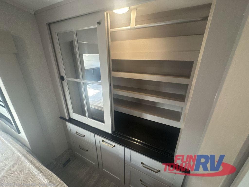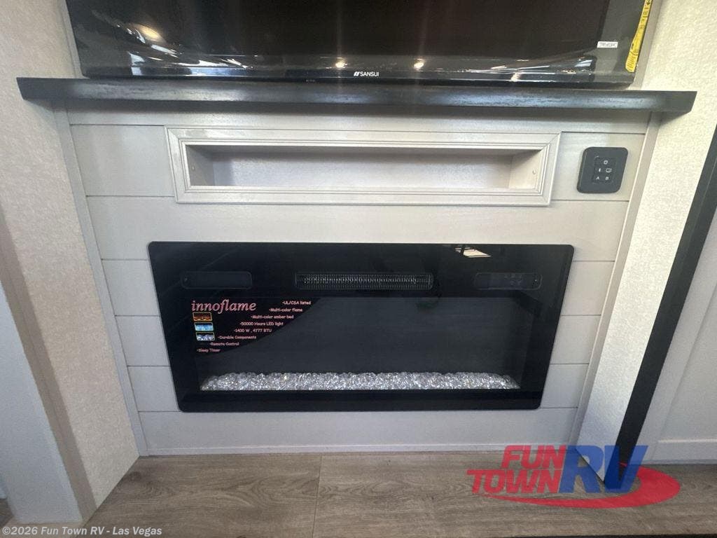 This RV offers a luxurious living experience on the road. The rear living area boasts a tri-fold sofa, a theater sofa that provides ample seating for relaxation and entertainment, and the entertainment center with a fireplace is the perfect spot to unwind on chilly evenings, while the ceiling fan keeps the air circulating on warm days. The kitchen is equipped with a kitchen island that provides additional counter space and storage, a microwave, a 12V refrigerator, a table with chairs and a bench seat that offers a comfortable dining space. Plus, the hutch and pantry provide ample storage for dishes, cookware, and food. The full bathroom is designed for comfort and convenience. The front bedroom is a serene retreat, featuring a king bed and a dresser that provide a comfortable sleeping space for sleeping tight all night long.
