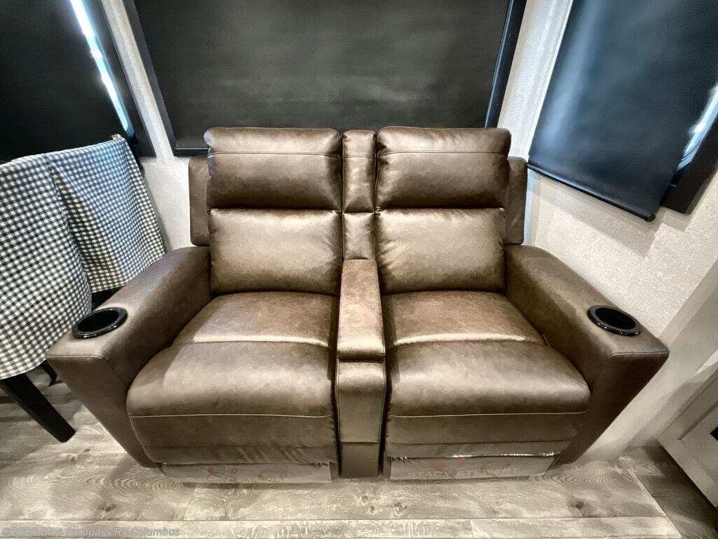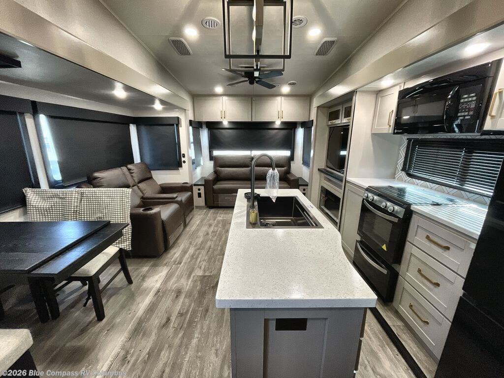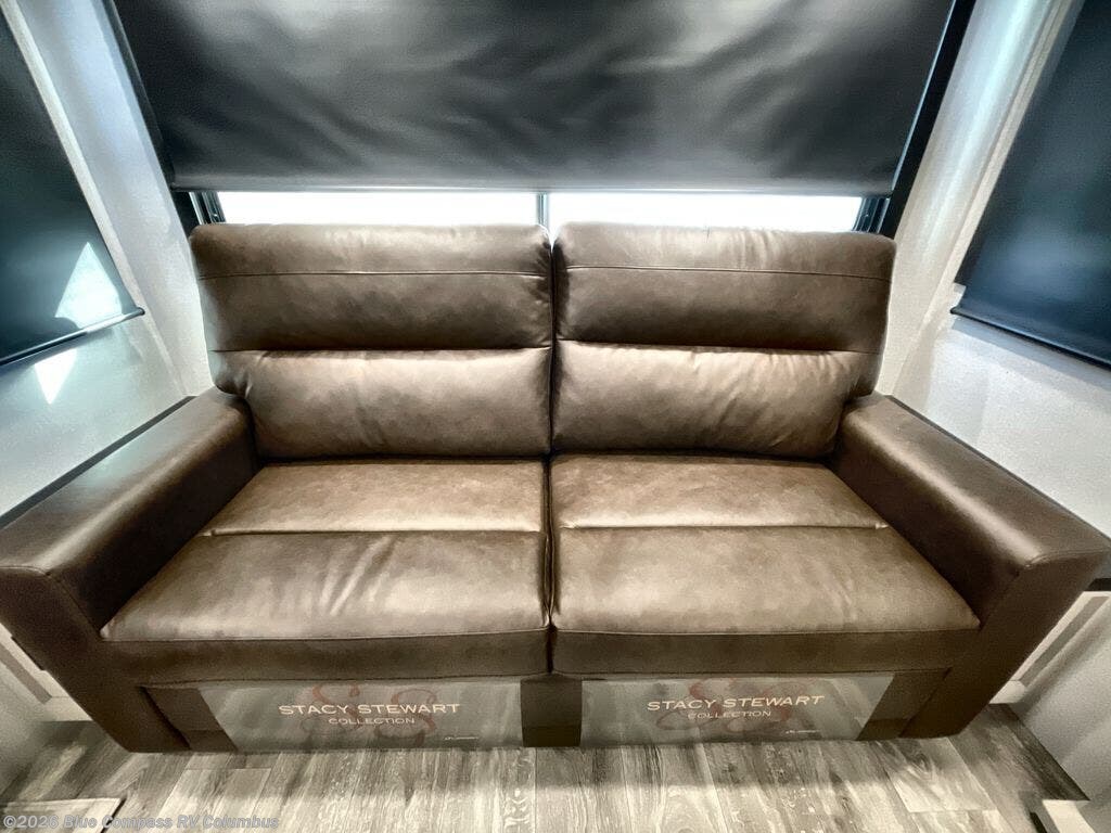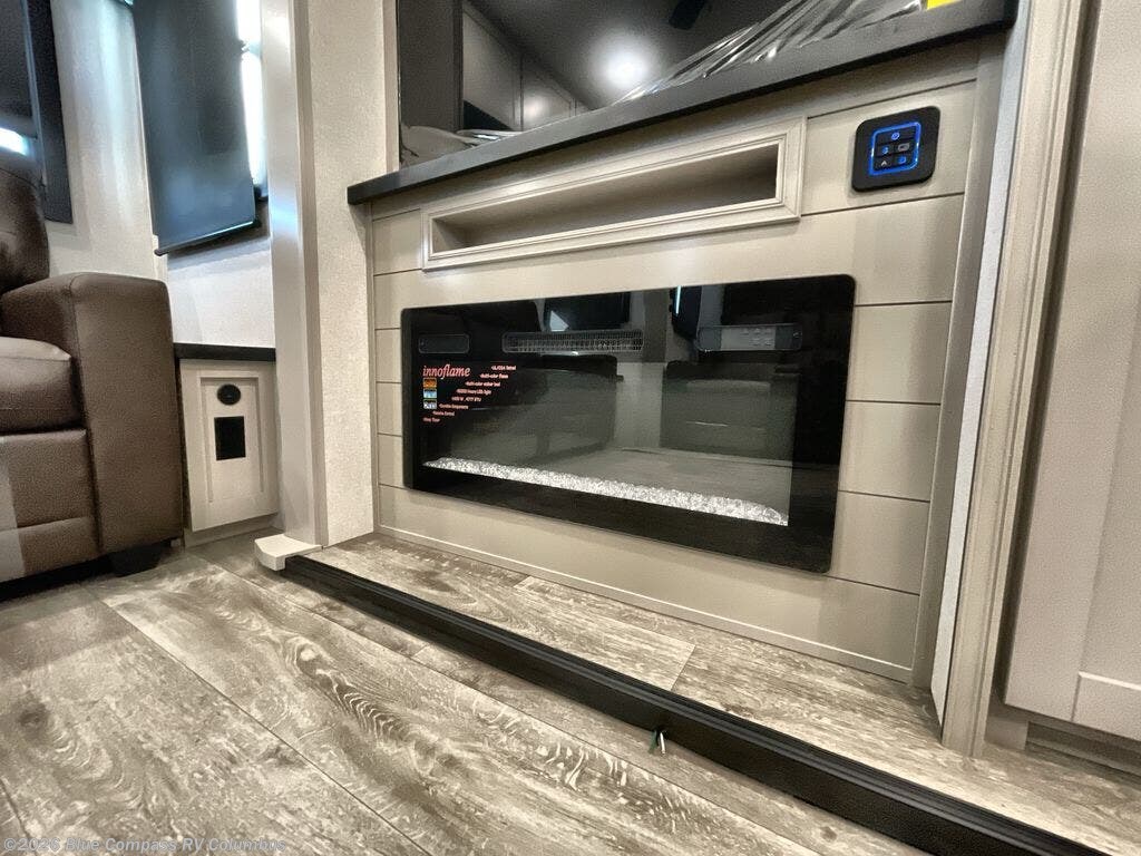 This RV offers a luxurious living experience on the road. The rear living area boasts a tri-fold sofa, a theater sofa that provides ample seating for relaxation and entertainment, and the entertainment center with a fireplace is the perfect spot to unwind on chilly evenings, while the ceiling fan keeps the air circulating on warm days. The kitchen is equipped with a kitchen island that provides additional counter space and storage, a microwave, a 12V refrigerator, a table with chairs and a bench seat that offers a comfortable dining space. Plus, the hutch and pantry provide ample storage for dishes, cookware, and food. The full bathroom is designed for comfort and convenience. The front bedroom is a serene retreat, featuring a king bed and a dresser that provide a comfortable sleeping space for sleeping tight all night long.