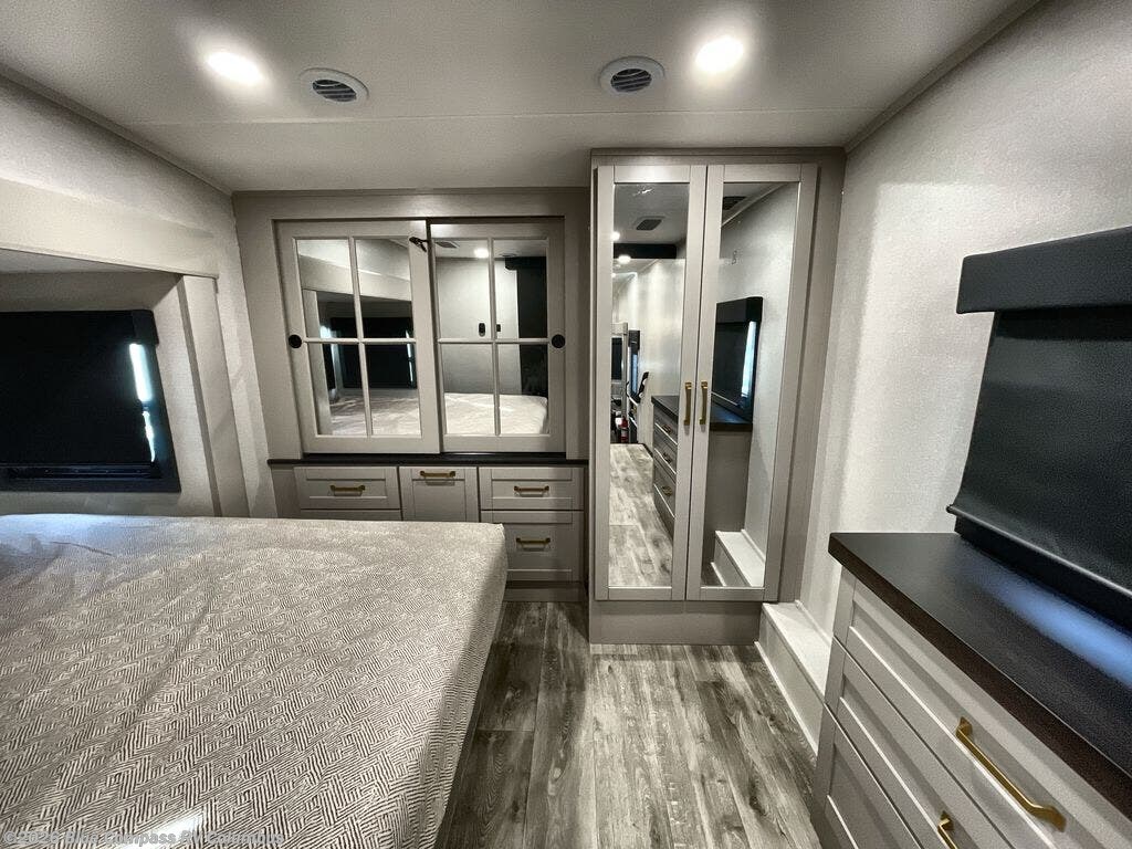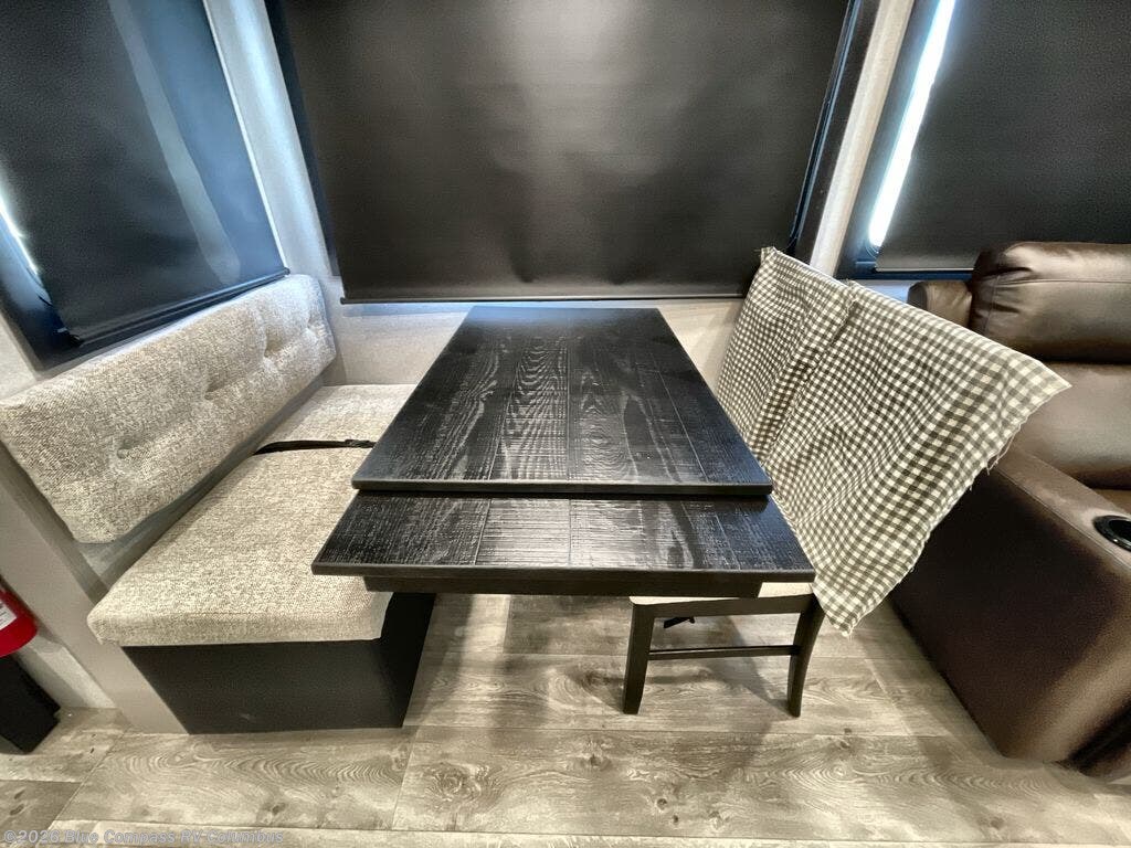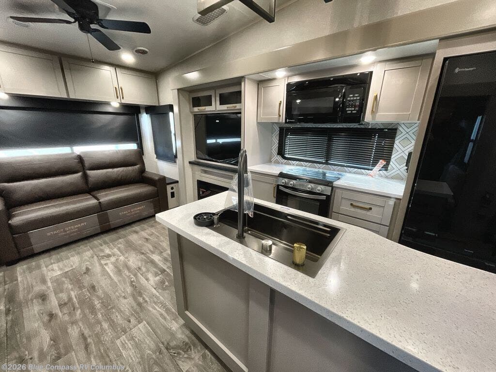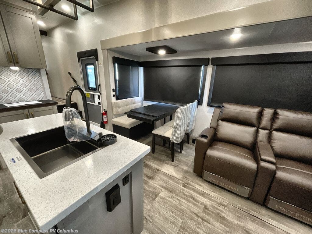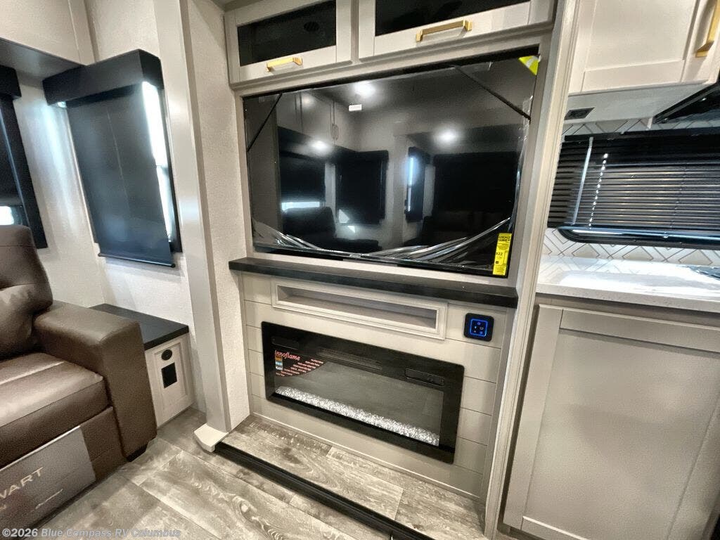 This RV offers a luxurious living experience on the road. The rear living area boasts a tri-fold sofa, a theater sofa that provides ample seating for relaxation and entertainment, and the entertainment center with a fireplace is the perfect spot to unwind on chilly evenings, while the ceiling fan keeps the air circulating on warm days. The kitchen is equipped with a kitchen island that provides additional counter space and storage, a microwave, a 12V refrigerator, a table with chairs and a bench seat that offers a comfortable dining space. Plus, the hutch and pantry provide ample storage for dishes, cookware, and food. The full bathroom is designed for comfort and convenience. The front bedroom is a serene retreat, featuring a king bed and a dresser that provide a comfortable sleeping space for sleeping tight all night long.
