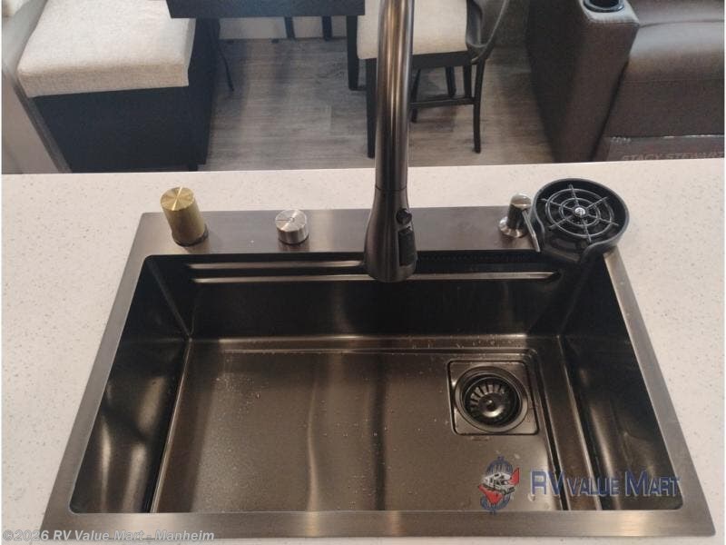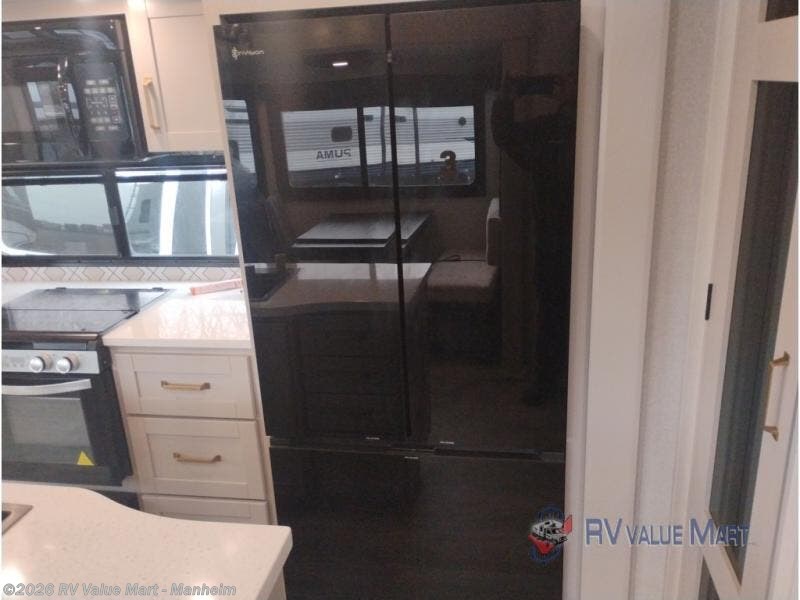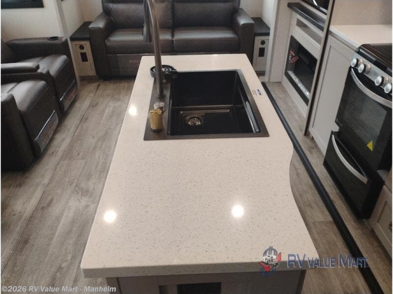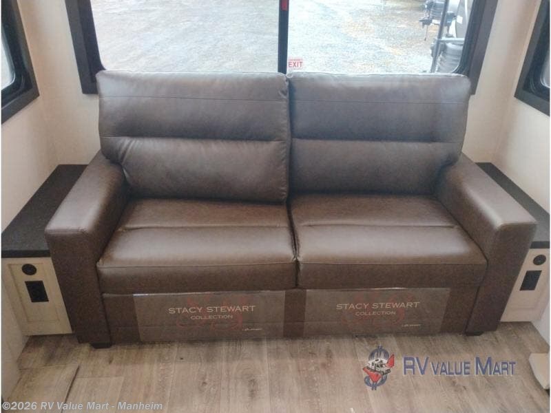 This RV offers a luxurious living experience on the road. The rear living area boasts a tri-fold sofa, a theater sofa that provides ample seating for relaxation and entertainment, and the entertainment center with a fireplace is the perfect spot to unwind on chilly evenings, while the ceiling fan keeps the air circulating on warm days. The kitchen is equipped with a kitchen island that provides additional counter space and storage, a microwave, a 12V refrigerator, a table with chairs and a bench seat that offers a comfortable dining space. Plus, the hutch and pantry provide ample storage for dishes, cookware, and food. The full bathroom is designed for comfort and convenience. The front bedroom is a serene retreat, featuring a king bed and a dresser that provide a comfortable sleeping space for sleeping tight all night long.