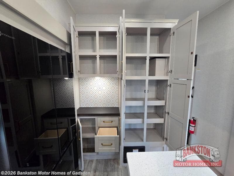 The majestic rear living area features a plush 75” tri-fold sofa and a comfortable theater sofa, perfect for relaxing and entertaining while enjoying your favorite TV shows in the entertainment center with a warm and inviting fireplace. The gourmet kitchen is equipped with a kitchen island, a microwave, and a reliable 12V refrigerator, making meal preparation and storage effortless. The elegant dining area features a table with chairs and a bench seat, while the hutch and pantry provide ample storage for your culinary essentials. The loft space is a unique retreat, offering a comfortable tri-fold sofa and a functional desk under it, perfect for relaxation, work, or study. The luxurious full bathroom provides a serene space for personal care, and you can take a nap in the plush king bed located in the front bedroom.