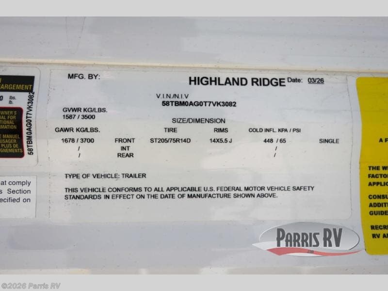 Request More Info on this 2026 Highland Ridge Colt 13BH Offered for sale by Parris RV
