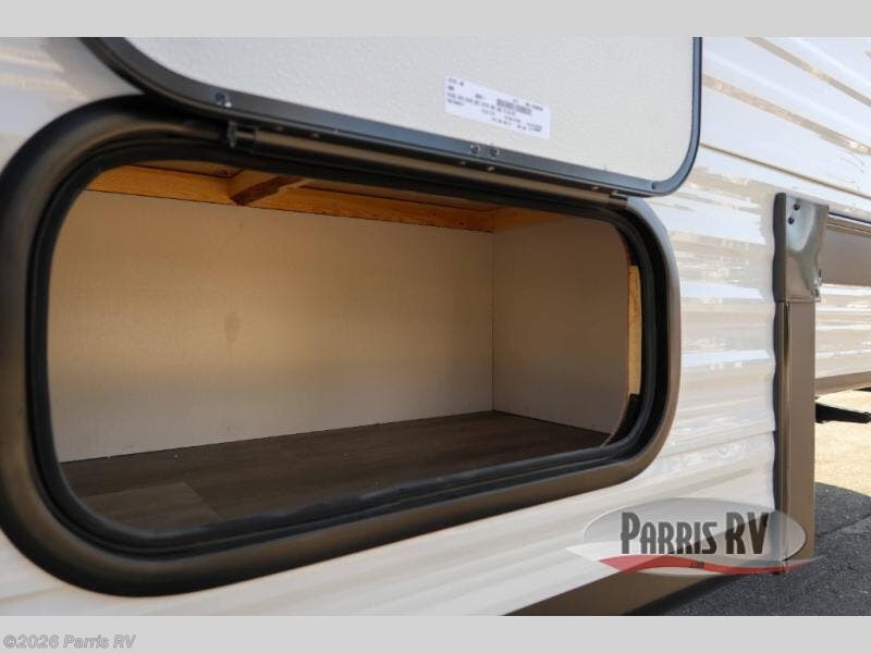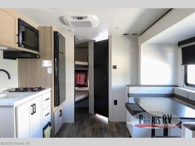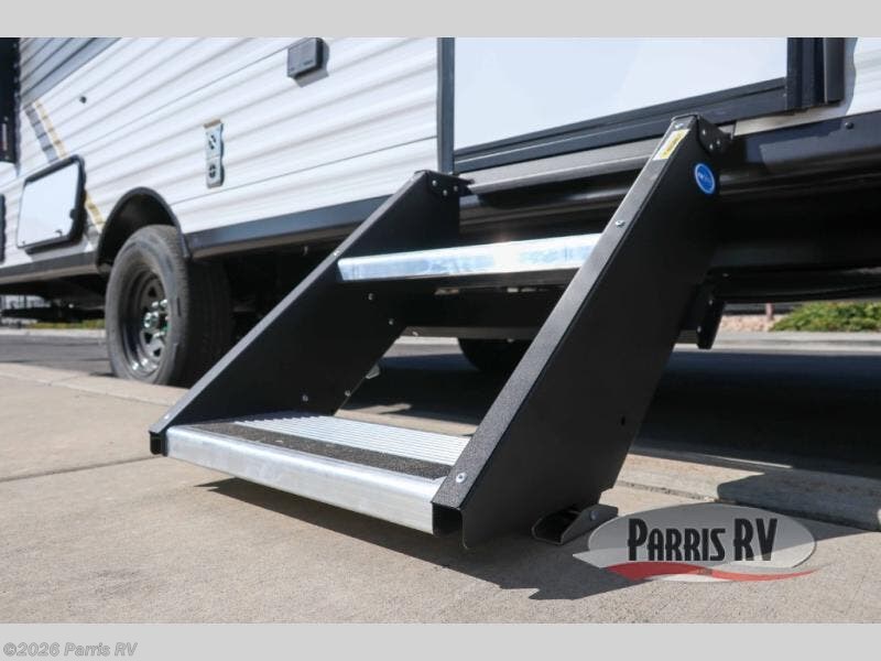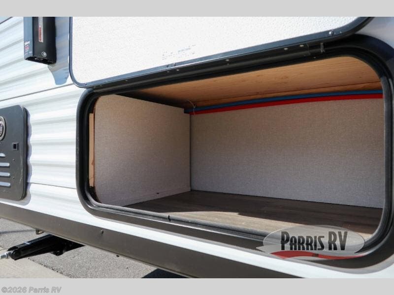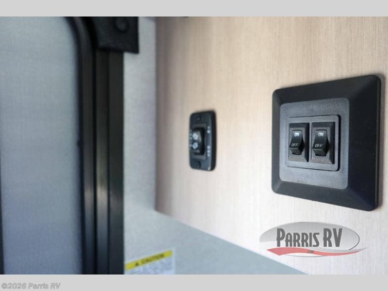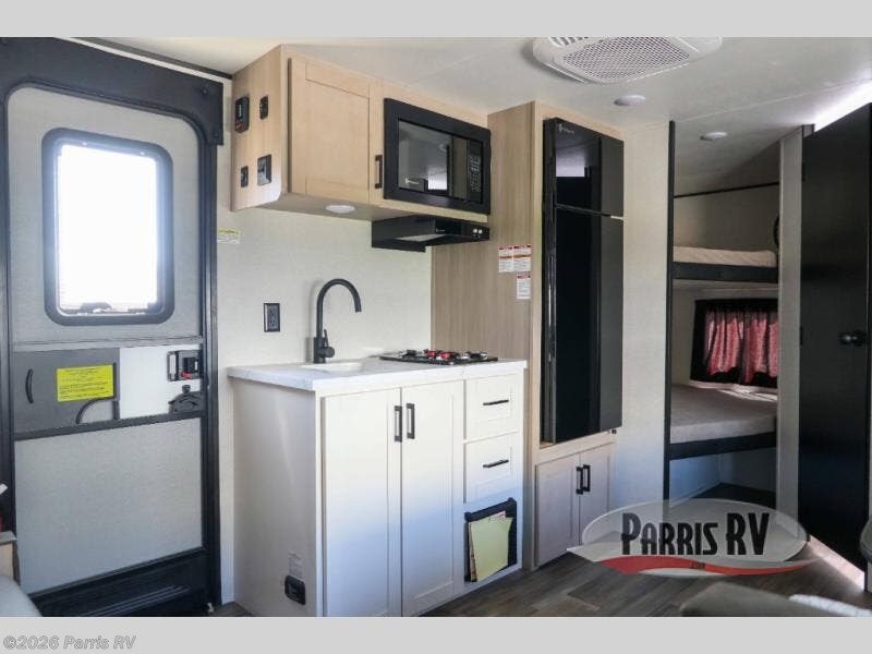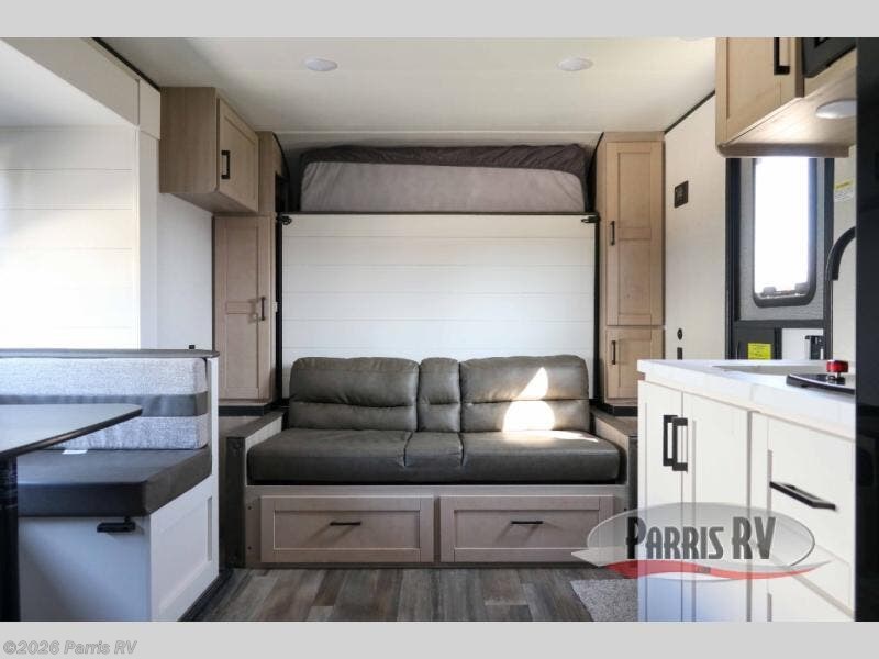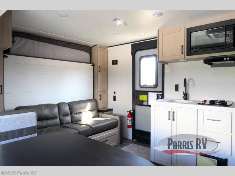 This travel trailer features compact sleeping spaces thanks to the double-size bunk beds in the rear corner, and the private full bath is right next to the bunks for easy nighttime use! You'll have the front Murphy bed all to yourselves, and in the morning, you can fold it away to sit on the jack-knife sofa. A cooktop and microwave oven will let you make meals each day, and there is a 12V refrigerator to keep your cold items fresh. Outside, you'll enjoy the 13' power awning for added shade, and there are two exterior storage compartments to keep fishing poles, hiking gear and more!