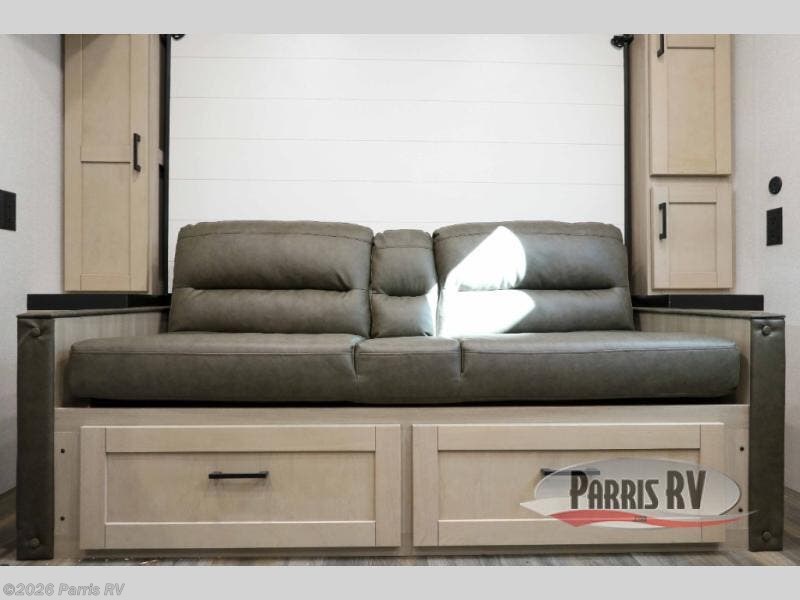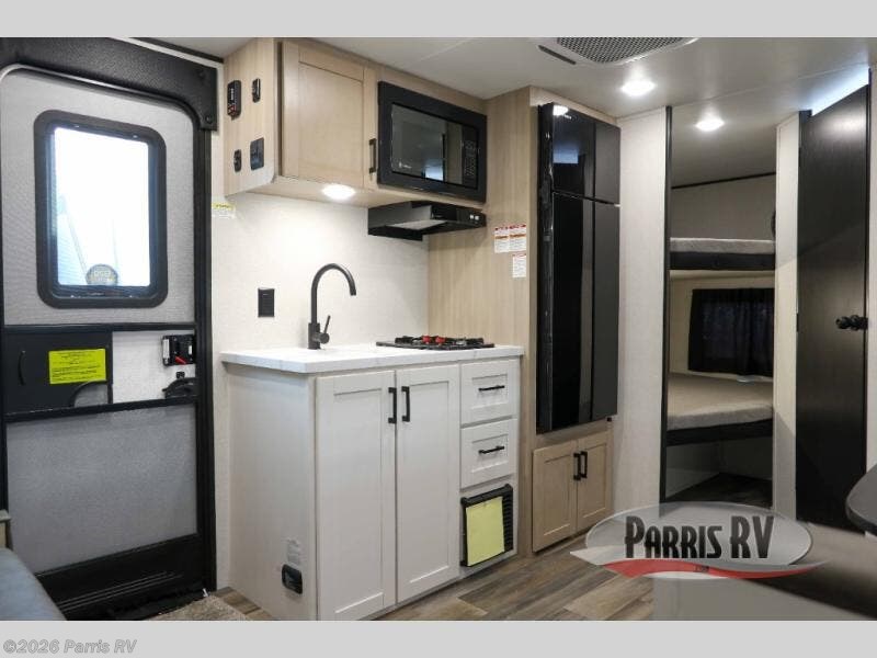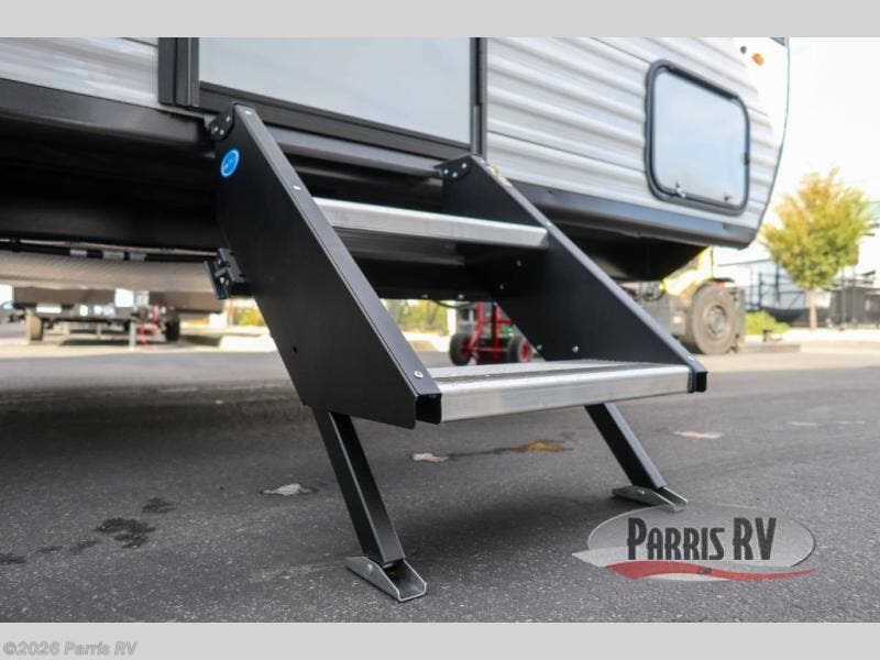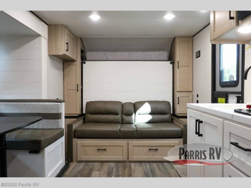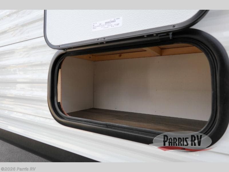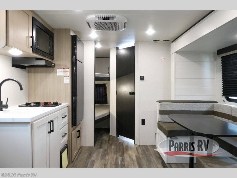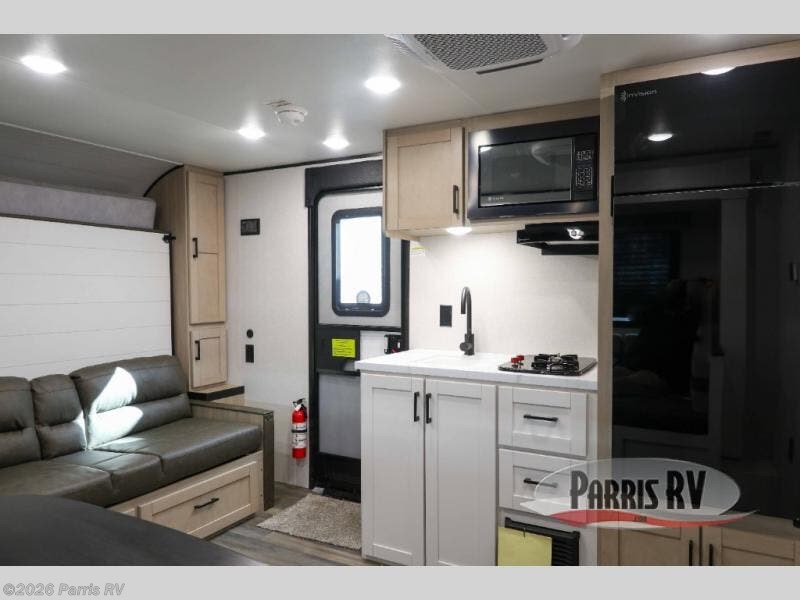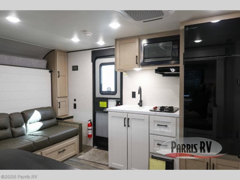 This travel trailer features compact sleeping spaces thanks to the double-size bunk beds in the rear corner, and the private full bath is right next to the bunks for easy nighttime use! You'll have the front Murphy bed all to yourselves, and in the morning, you can fold it away to sit on the jack-knife sofa. A cooktop and microwave oven will let you make meals each day, and there is a 12V refrigerator to keep your cold items fresh. Outside, you'll enjoy the 13' power awning for added shade, and there are two exterior storage compartments to keep fishing poles, hiking gear and more!