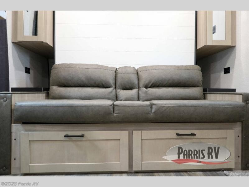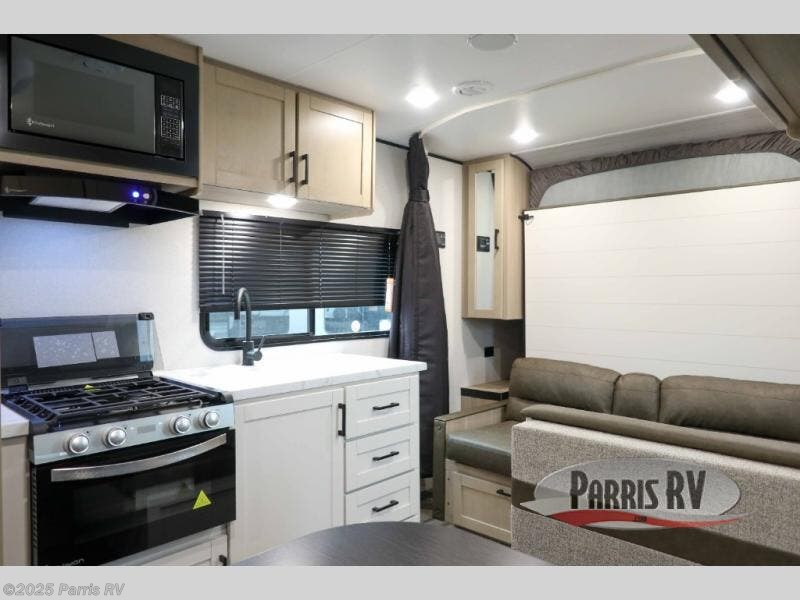 This travel trailer features compact sleeping spaces thanks to the double-size bunk beds in the rear corner, and the private full bath is right next to the bunks for easy nighttime use! You'll have the front Murphy bed all to yourselves, and in the morning, you can fold it away to sit on the jack-knife sofa. A three-burner cooktop and microwave oven will let you make meals each day, and there is a 12V refrigerator to keep your cold items fresh. Outside, you'll enjoy the 13' power awning with LED lights for added shade, and there are two exterior storage compartments to keep fishing poles, hiking gear and more!