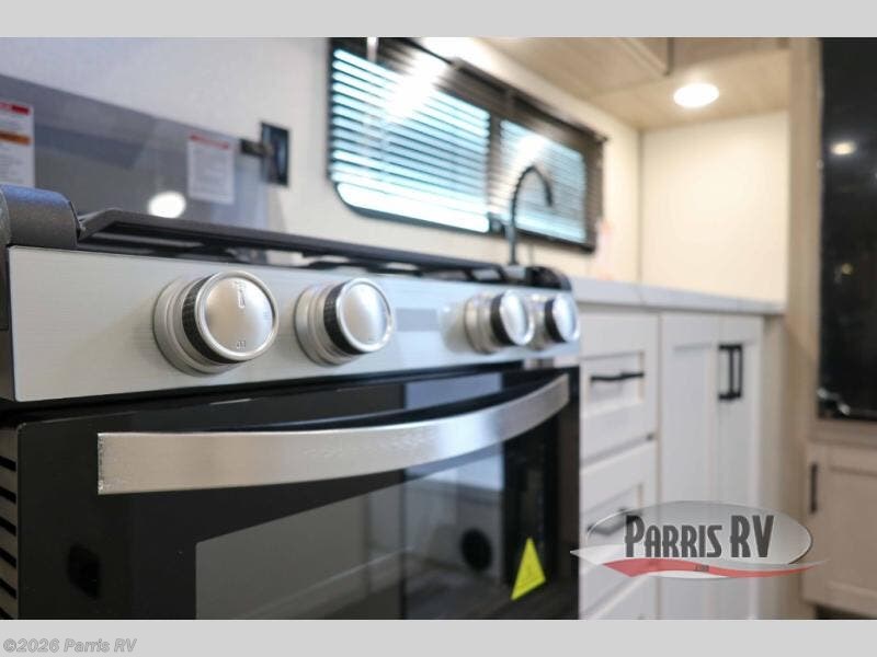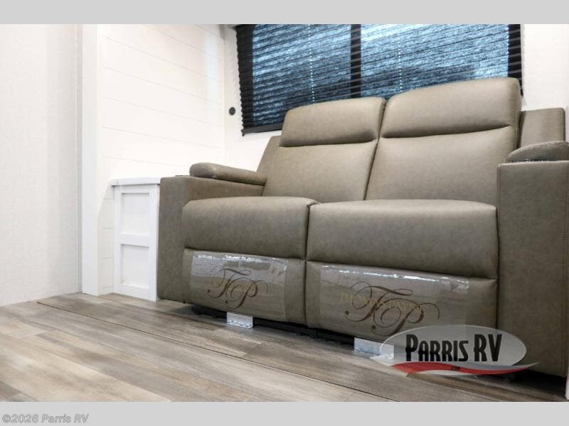 This couple's travel trailer is perfect for weekend trips to the lake! Once you arrive at the campground, you can unload the exterior storage, put out the 17' power awning with LED lights, then relax in your camp chairs. Head inside to make lunch on the three-burner cooktop in the rear corner kitchen, and you'll be pleased to find ample counter space here. The theater seat includes swivel tables where you can dine together, and the front queen bed is sure to bring a great night's rest!