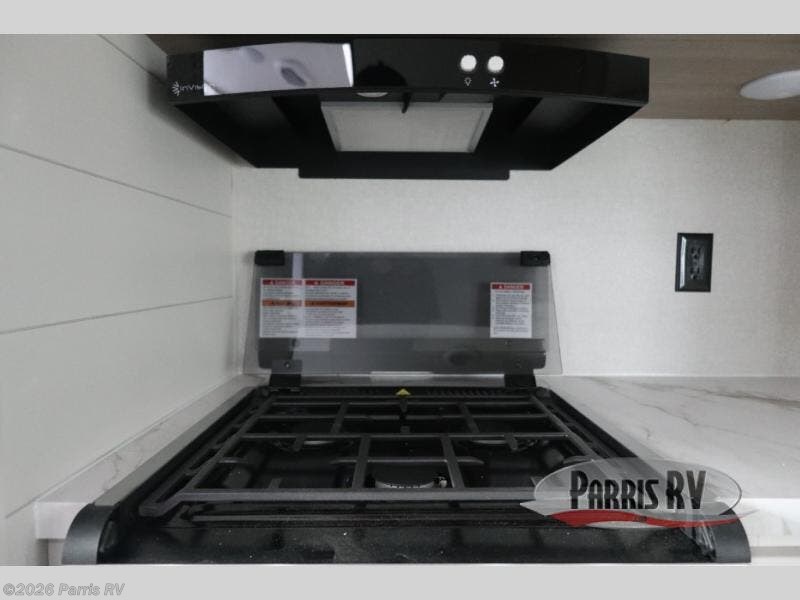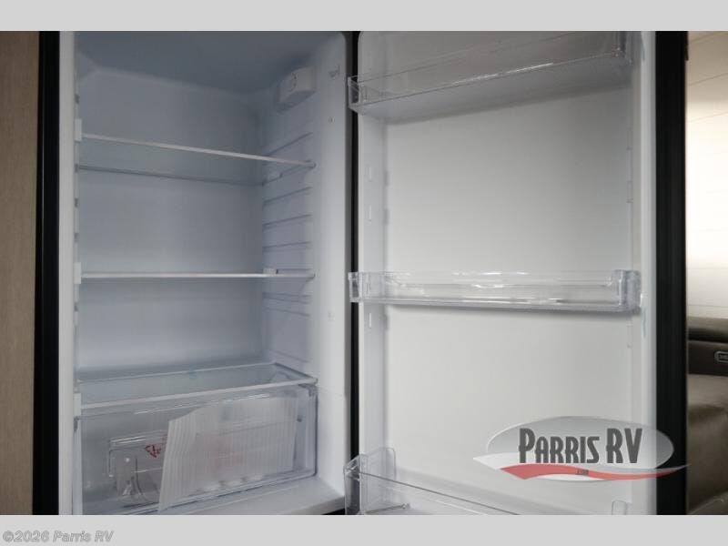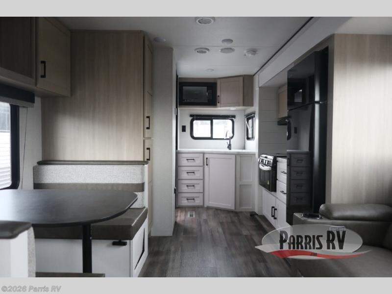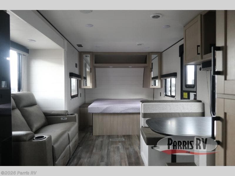 This travel trailer is perfect for weekend trips to the lake! Once you arrive at the campground, you can unload the exterior storage, put out the 18' power awning with LED lights, then relax in your camp chairs. Head inside to make lunch on the three-burner cooktop in the rear corner kitchen, and you'll find the full bath in the other rear corner for quick access. A booth dinette provides a place to dine together, and a theater seat within the large slide out is sure to bring comfort. This unit includes a queen bed in the front semi-private bedroom with a privacy curtain and dual wardrobes for your things!