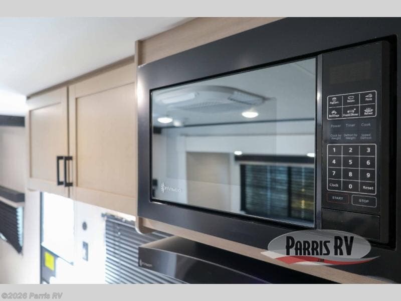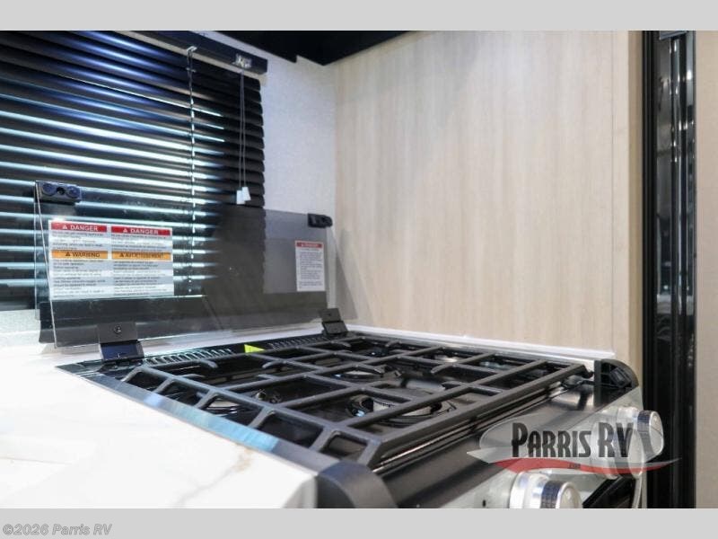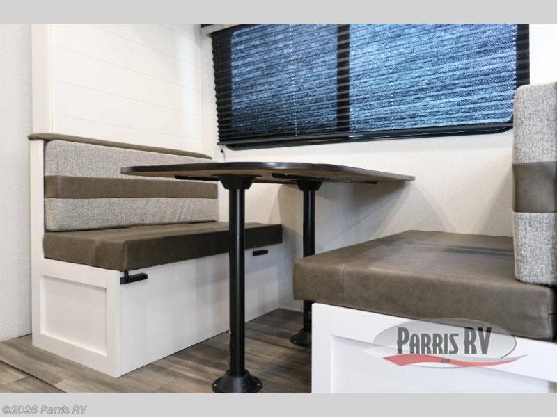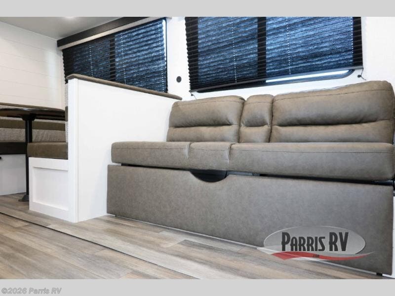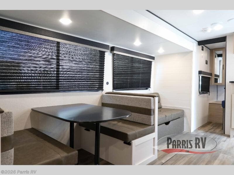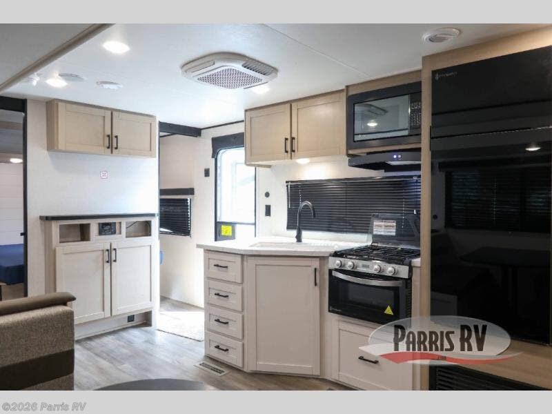 This travel trailer with double-size bunks is spacious and cozy! Once you've unloaded the exterior storage, your crew can put out the 16' power awning with LED lights, then start lunch on the outside kitchen. If the weather isn't cooperating, there is a three-burner cooktop and microwave oven inside, plus comfortable seating on the jack-knife sofa and booth dinette. You're sure to appreciate the front private bedroom with an RV queen bed, dual wardrobes, plus an overhead shelf for books, and the rear corner full bath will let everyone freshen up each day!