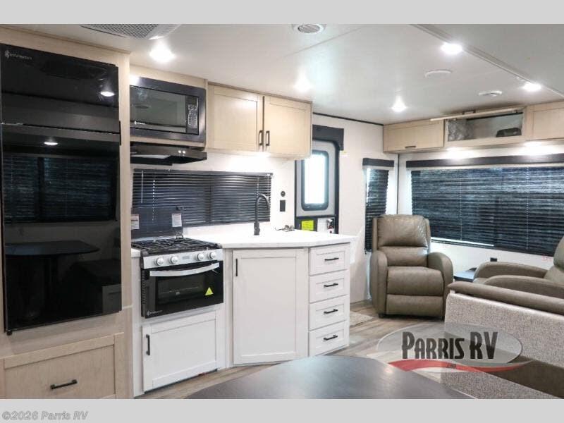 With dual entry doors in this unit, you can enter in through the front master bedroom or the rear living room! The dual lounge chairs in the back will let you relax with a book and your coffee, and there is a large slide out with a jack-knife sofa and booth dinette for additional seating spaces. The chef of your group can make meals on the three-burner cooktop or in the microwave oven, and there is a pantry for dry goods or snacks. The walk-thru bath is easily accessible for everyone to use, and the front master bedroom with a 60" x 74" RV queen bed will make you feel right at home!