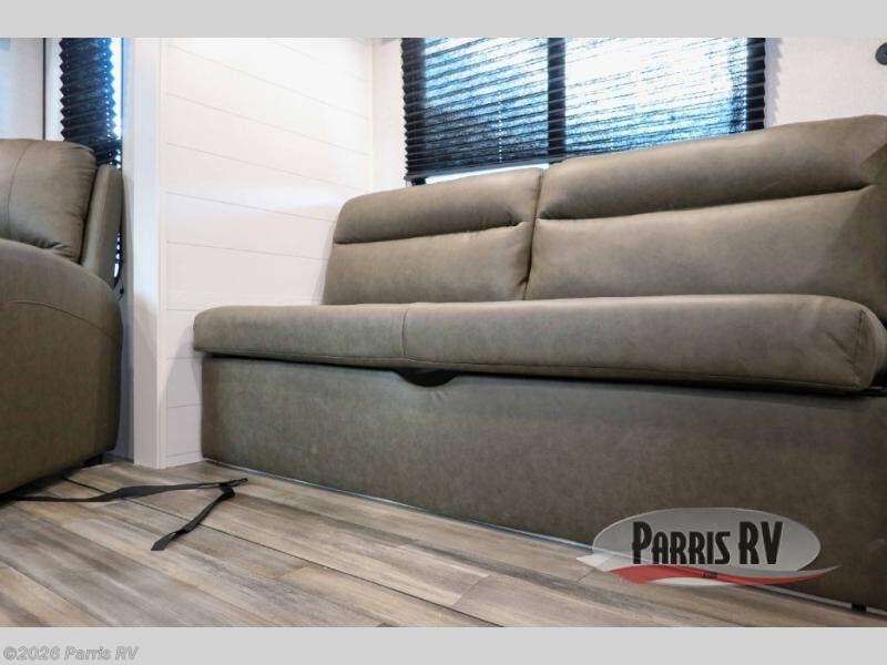 With dual entry doors in this unit, you can enter in through the front master bedroom or the rear living room! The dual lounge chairs in the back will let you relax with a book and your coffee, and there is a large slide out with a jack-knife sofa and booth dinette for additional seating spaces. The chef of your group can make meals on the three-burner cooktop or in the microwave oven, and there is a pantry for dry goods or snacks. The walk-thru bath is easily accessible for everyone to use, and the front master bedroom with a 60" x 74" RV queen bed will make you feel right at home!