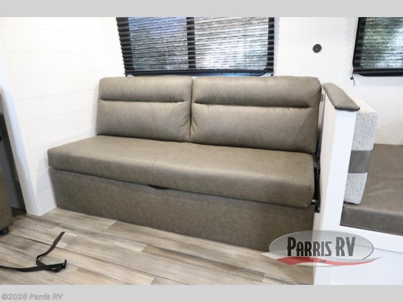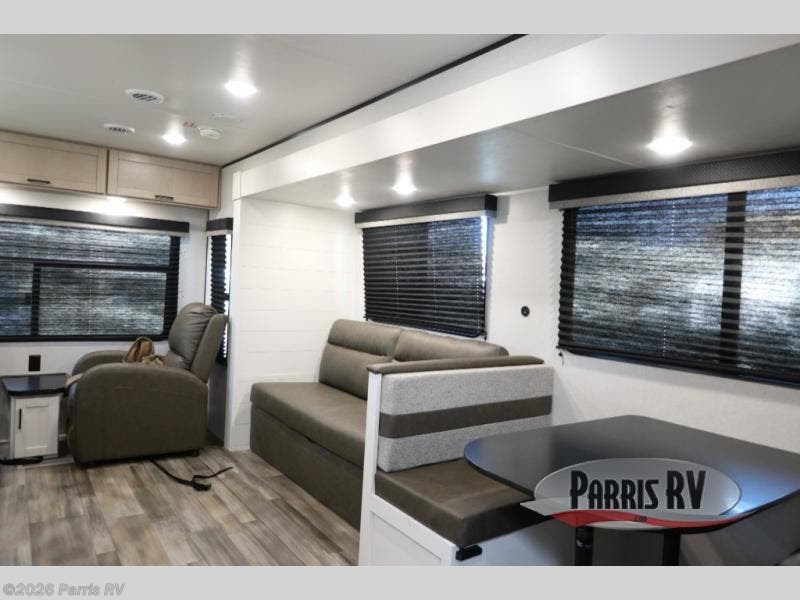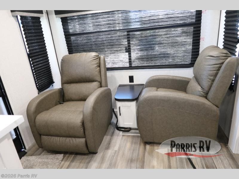 With dual entry doors in this unit, you can enter in through the front master bedroom or the rear living room! The dual lounge chairs in the back will let you relax with a book and your coffee, and there is a large slide out with a jack-knife sofa and booth dinette for additional seating spaces. The chef of your group can make meals on the three-burner cooktop or in the microwave oven, and there is a pantry for dry goods or snacks. The walk-thru bath is easily accessible for everyone to use, and the front master bedroom with a 60" x 74" RV queen bed will make you feel right at home!