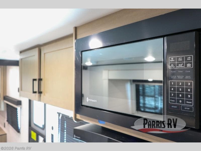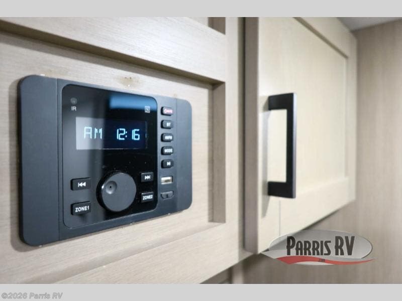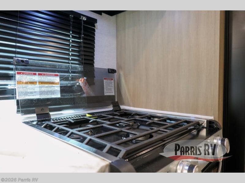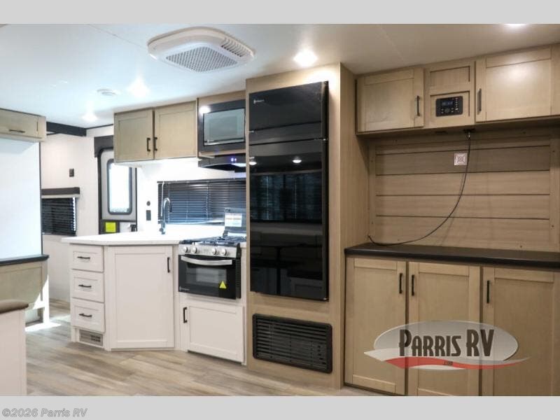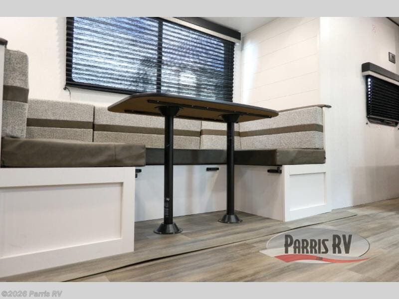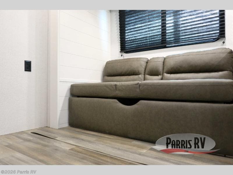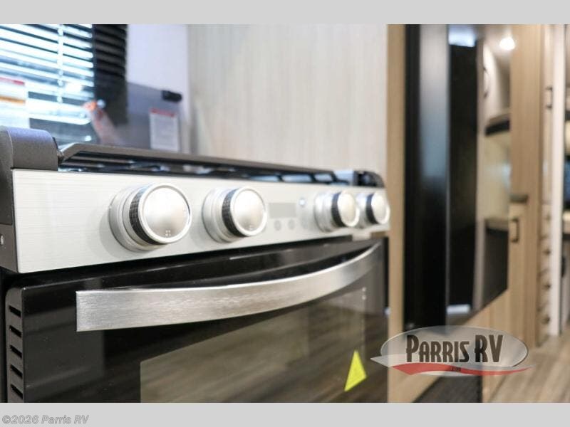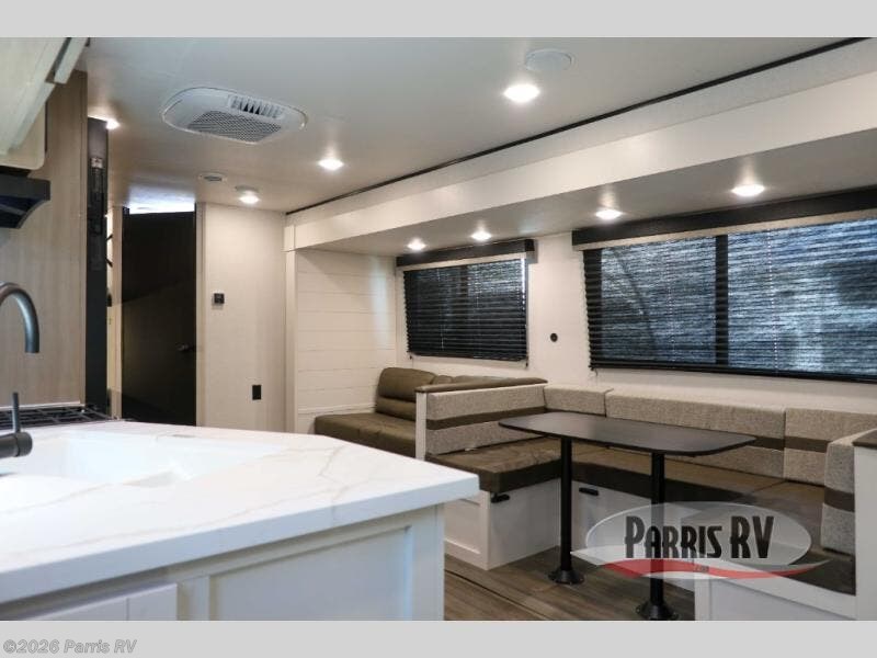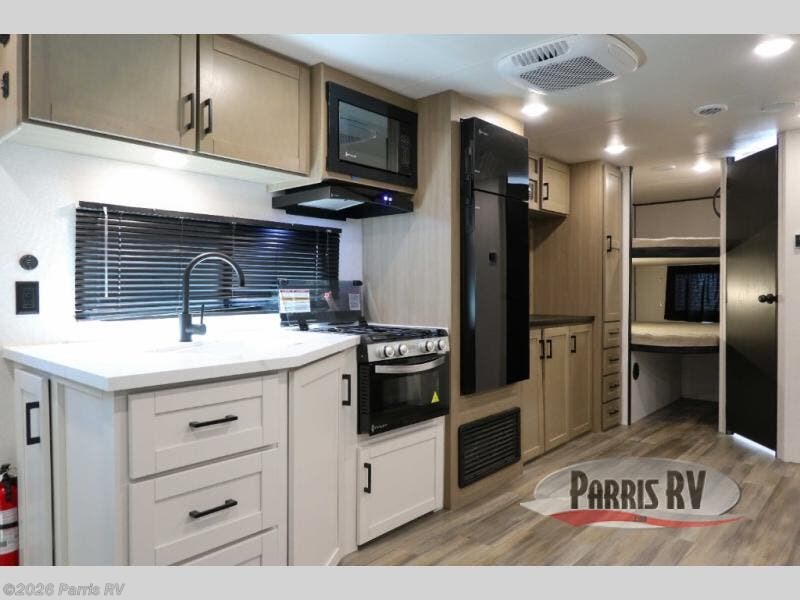 This travel trailer with double-size bunks is spacious and cozy! Once you've unloaded the exterior storage, your crew can put out the 18' power awning with LED lights, then relax in your camp chairs. There is also an outdoor camp kitchen here with an outside refrigerator and storage for snacks. When you're ready to make lunch, there is a three-burner cooktop and microwave oven inside, plus comfortable seating on the jack-knife sofa and U-shaped dinette. And an entertainment center with a fireplace will make this space feel more like home! You're sure to appreciate the front private bedroom with an RV queen bed, dual wardrobes, and overhead storage for books.