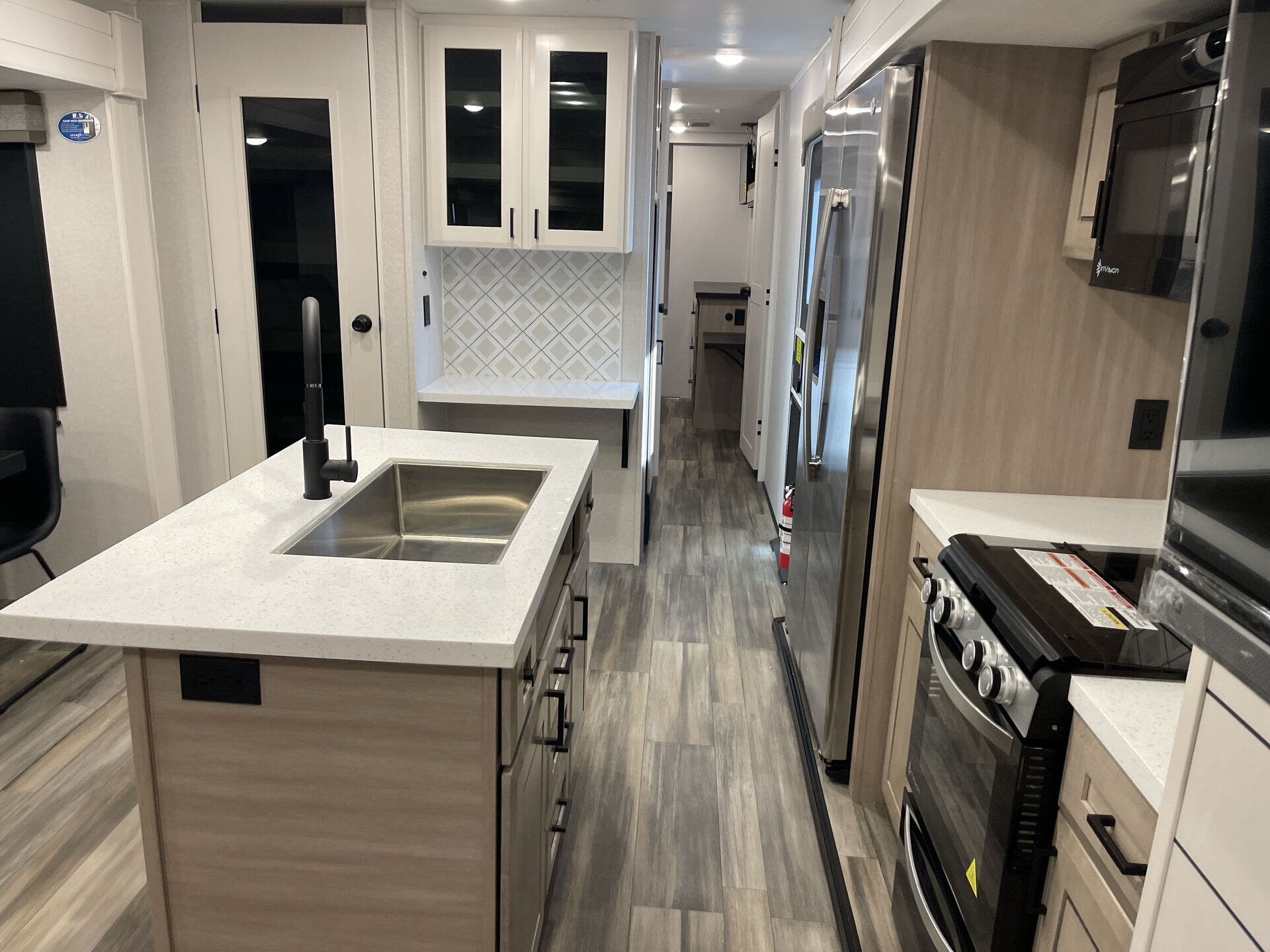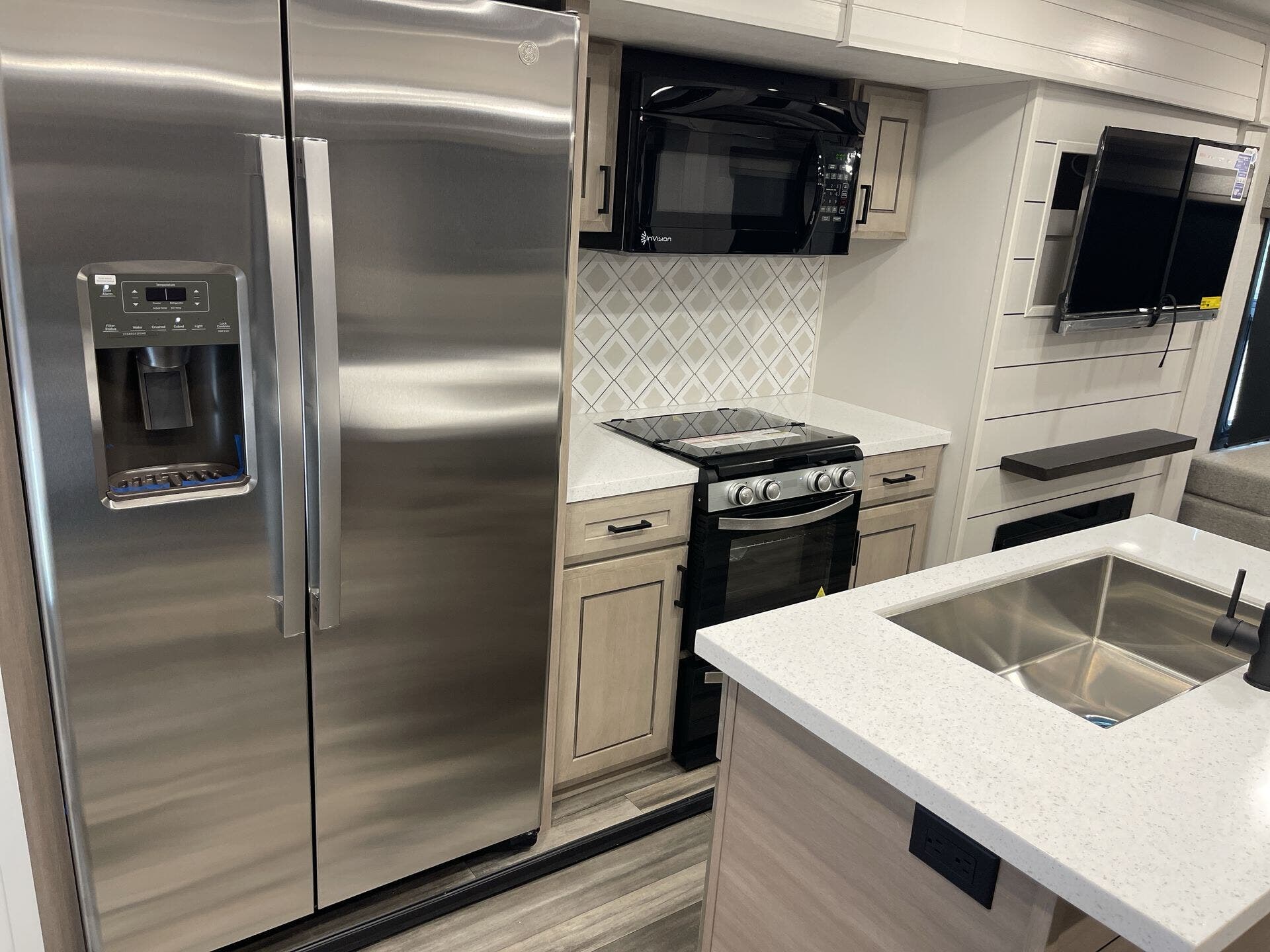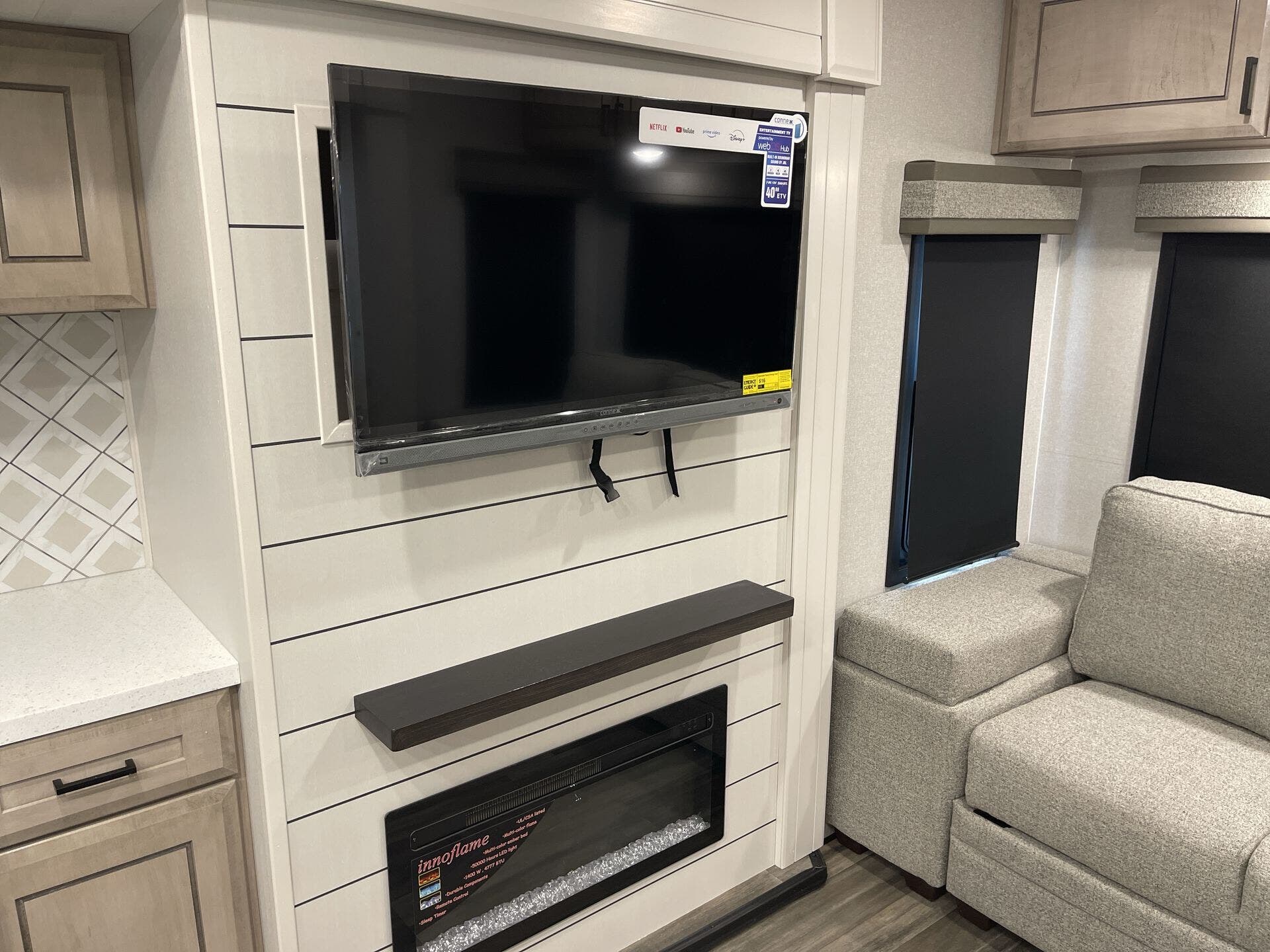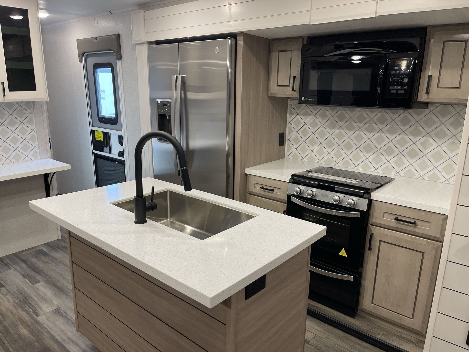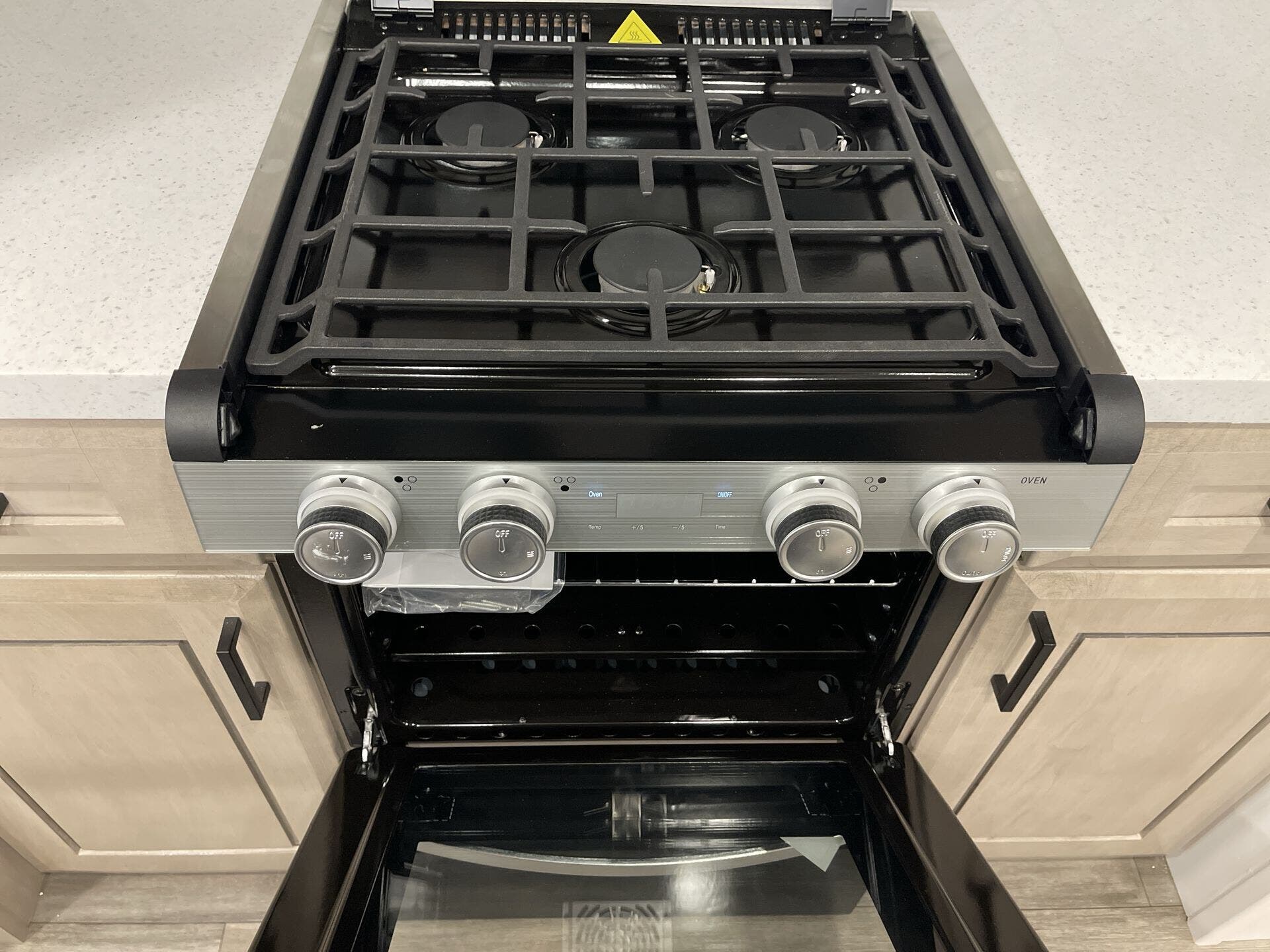 The front master suite features a queen slide-out bed, mirrored wardrobe, dresser, and washer/dryer prep. The central living area—equipped with two opposing slides—includes a kitchen island, pantry, free-standing table and chairs, theatre seating, and a tri-fold sofa facing a 50″ Smart HDTV and electric fireplace, making it perfect for relaxation and entertaining. The well-appointed central bathroom offers dual entry, a shower, vanity, and toilet. The fully equipped kitchen features a 20?cu?ft 12?V refrigerator, three-burner cooktop with oven, and 6-gal quick recovery gas/electric water heater.