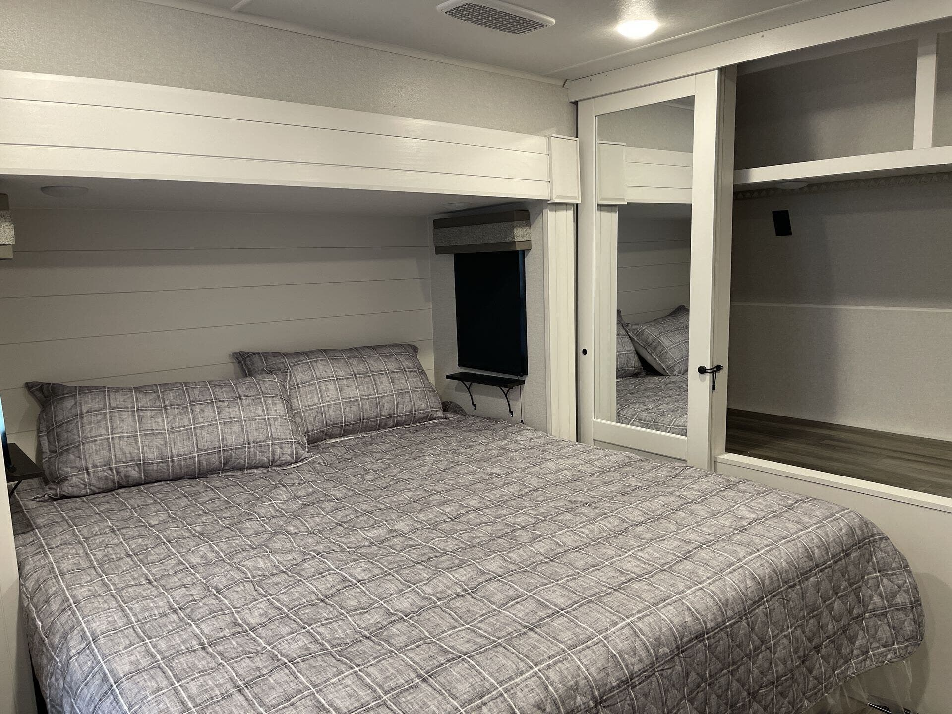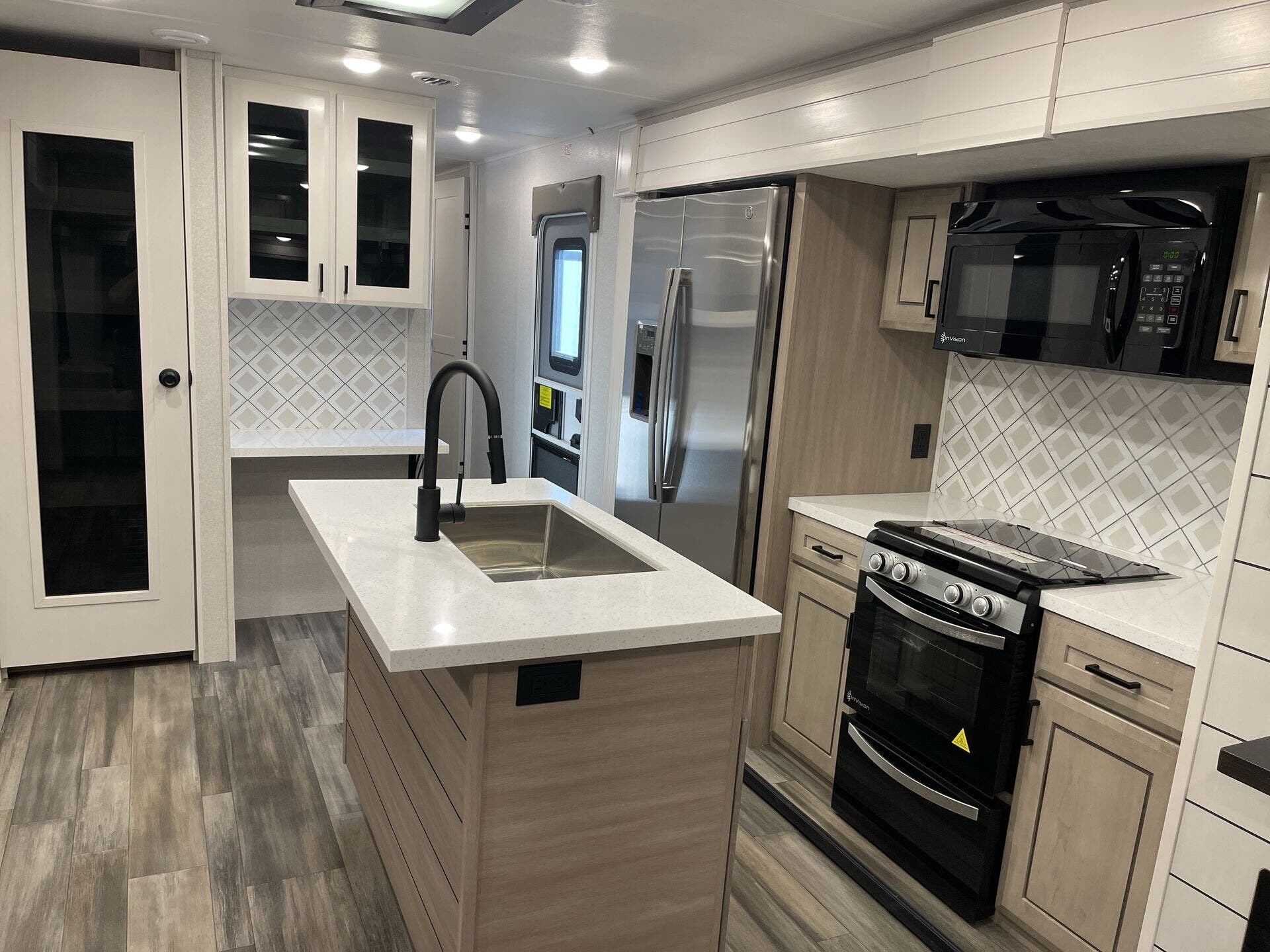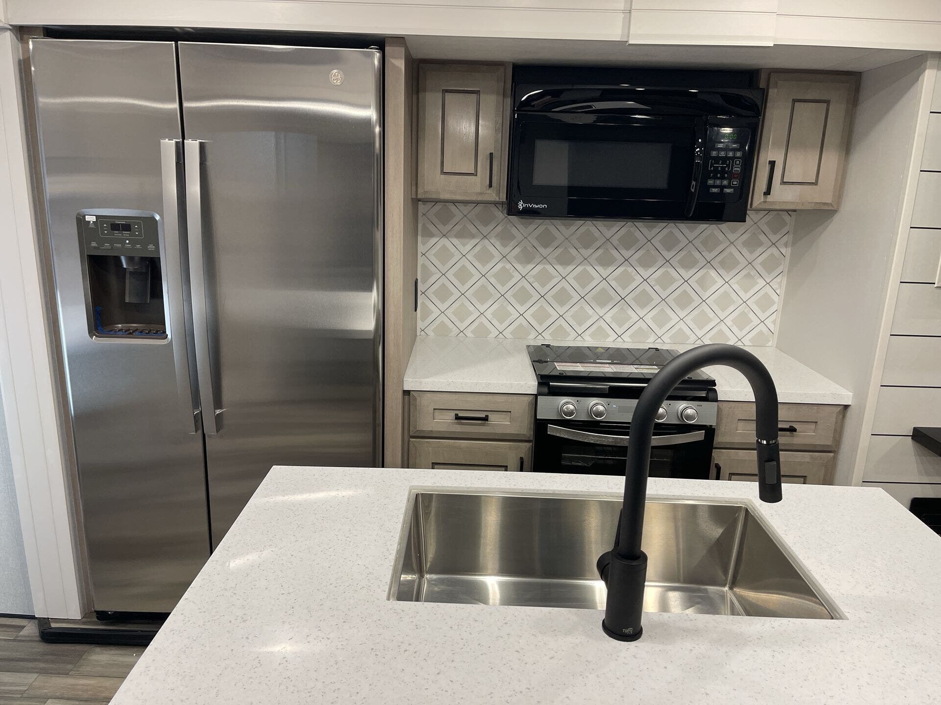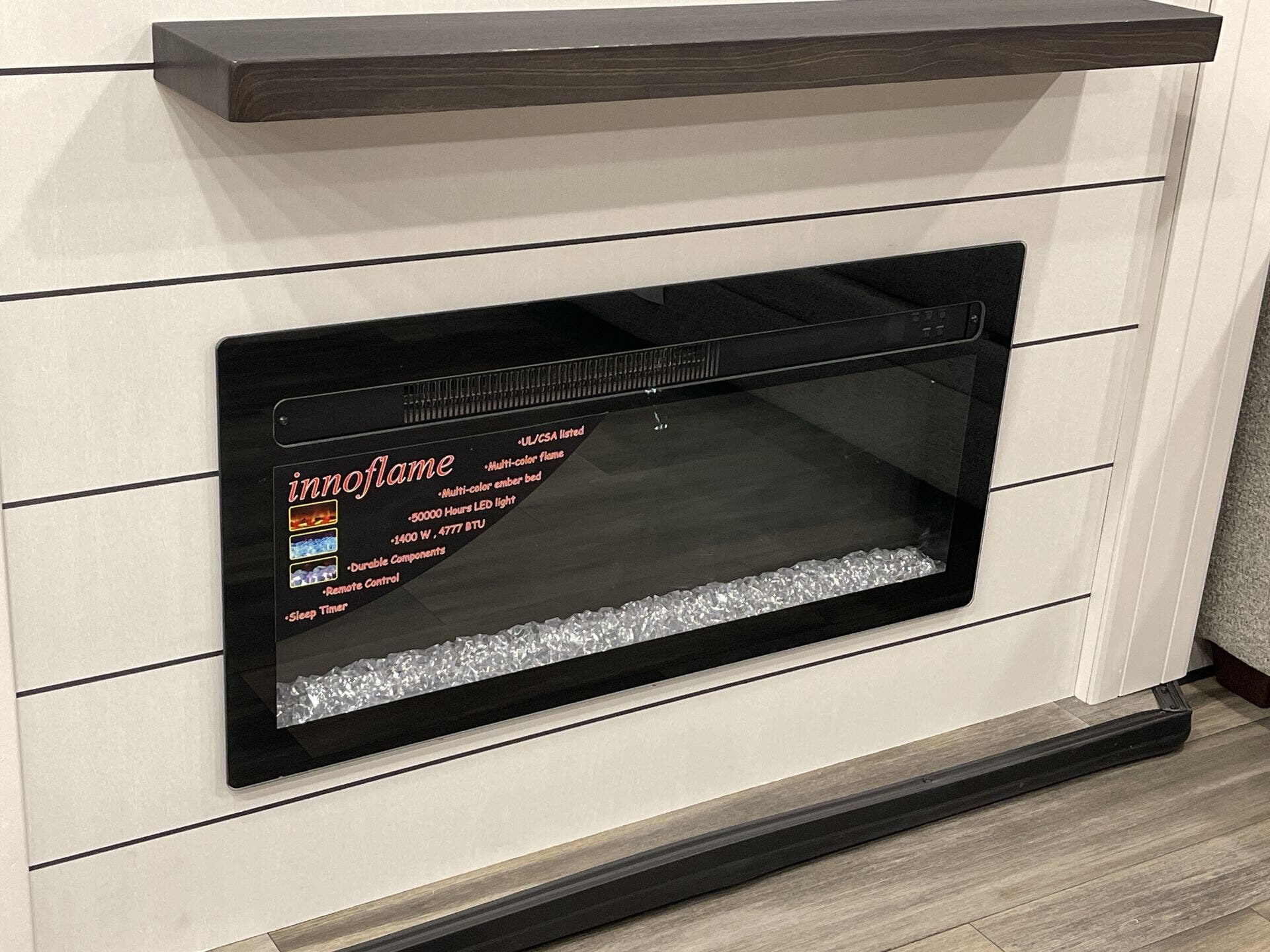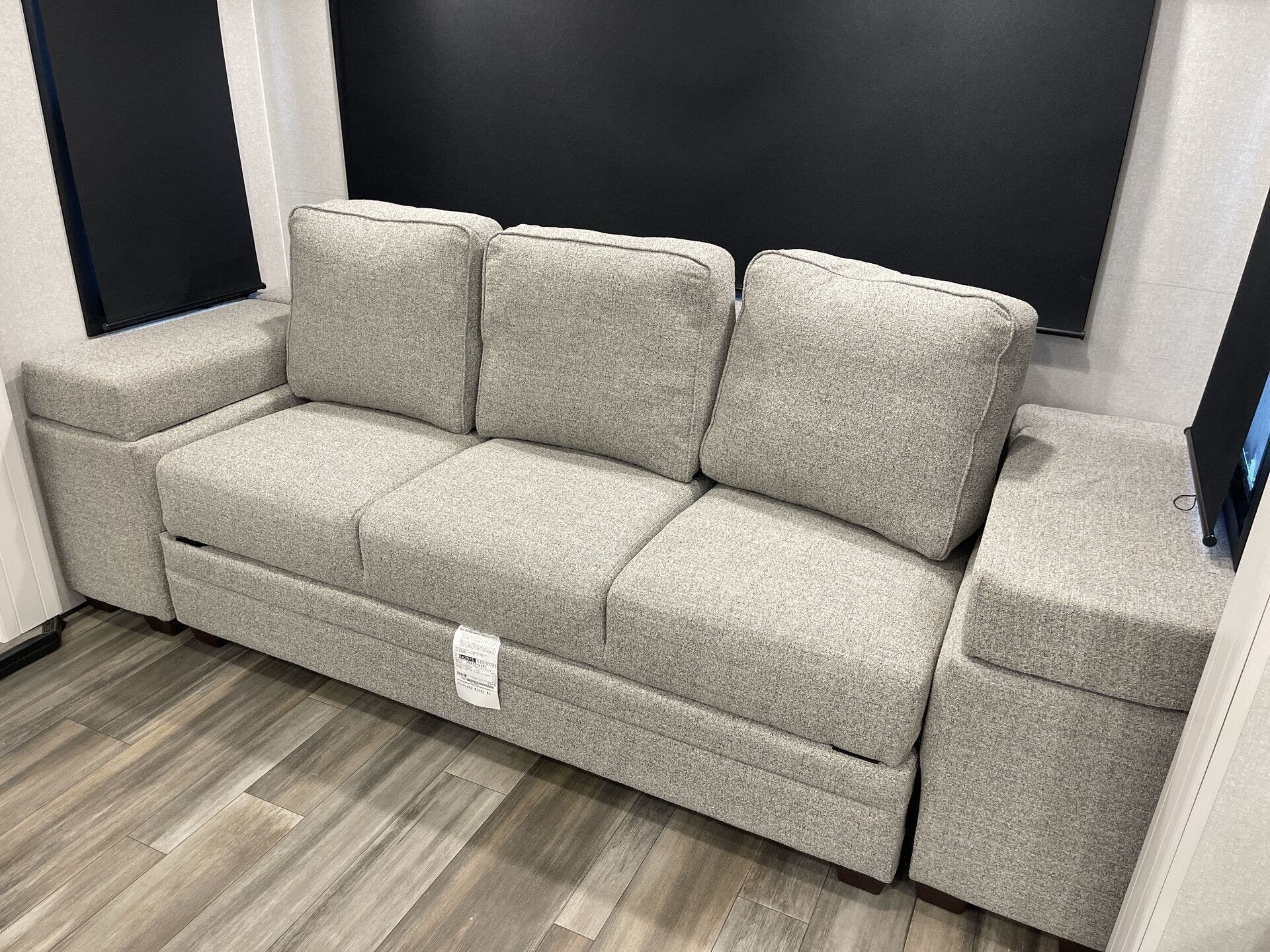 The front master suite features a queen slide-out bed, mirrored wardrobe, dresser, and washer/dryer prep. The central living area—equipped with two opposing slides—includes a kitchen island, pantry, free-standing table and chairs, theatre seating, and a tri-fold sofa facing a 50″ Smart HDTV and electric fireplace, making it perfect for relaxation and entertaining. The well-appointed central bathroom offers dual entry, a shower, vanity, and toilet. The fully equipped kitchen features a 20?cu?ft 12?V refrigerator, three-burner cooktop with oven, and 6-gal quick recovery gas/electric water heater.