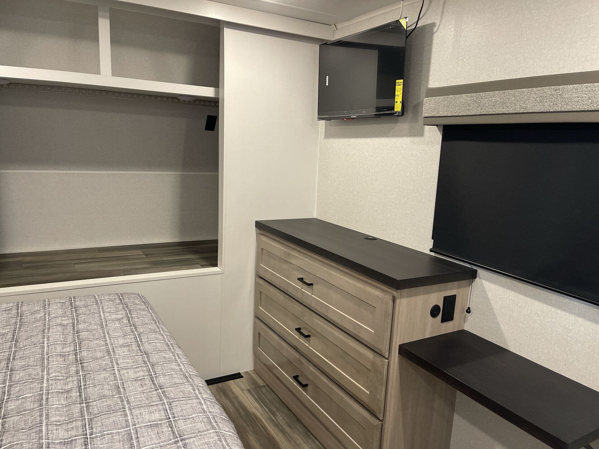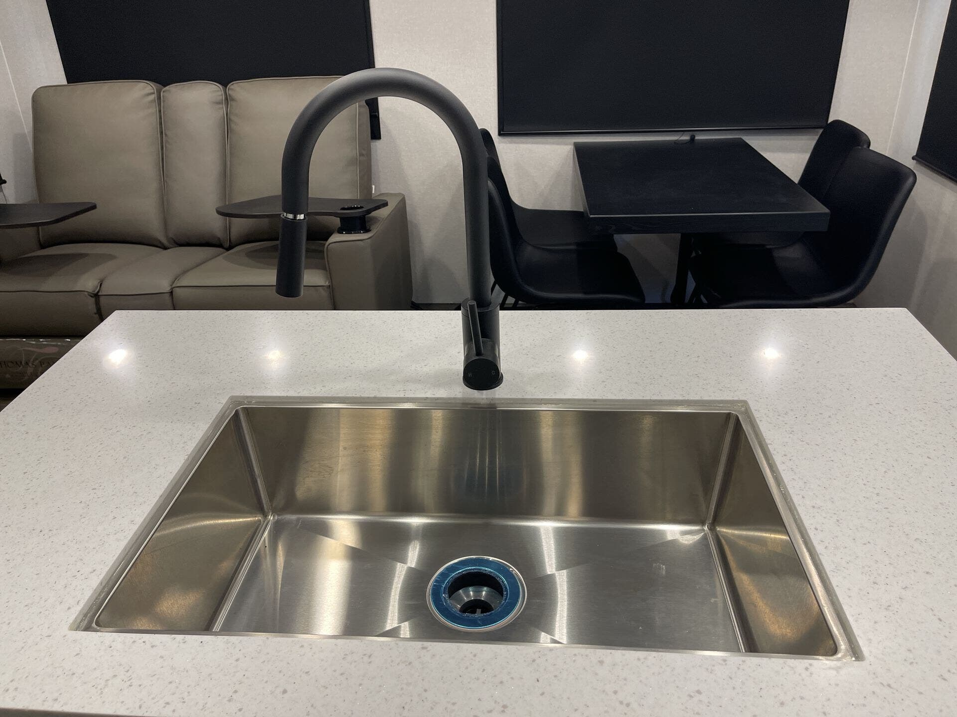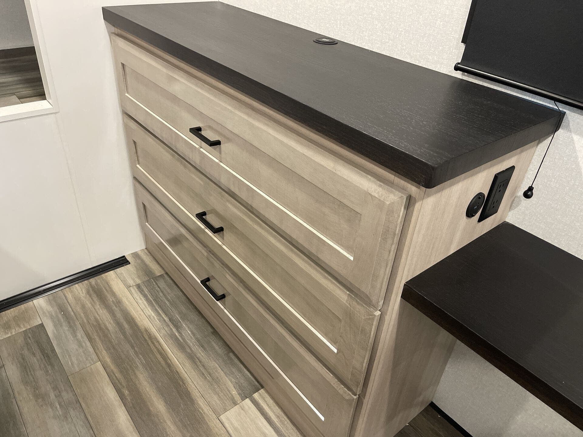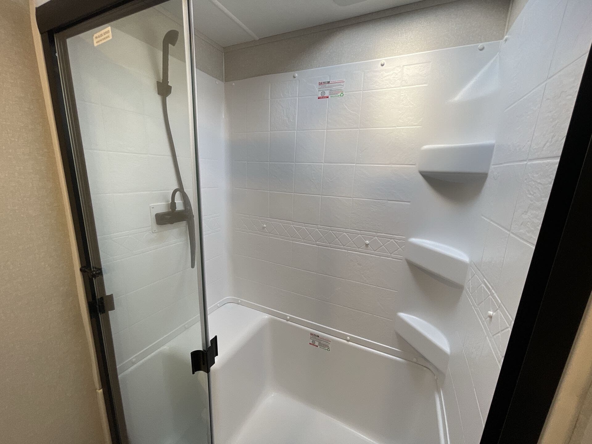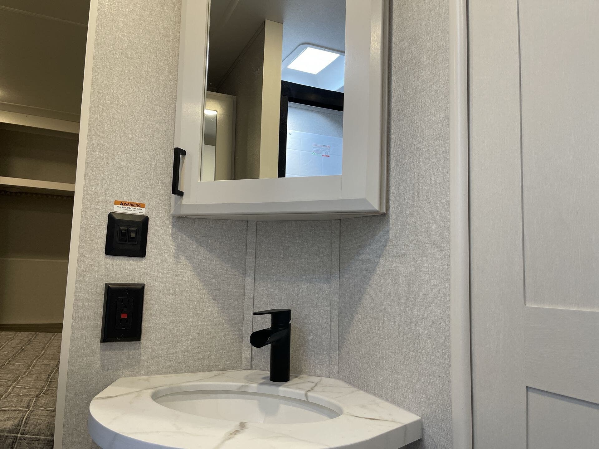 The front master suite features a queen slide-out bed, mirrored wardrobe, dresser, and washer/dryer prep. The central living area—equipped with two opposing slides—includes a kitchen island, pantry, free-standing table and chairs, theatre seating, and a tri-fold sofa facing a 50″ Smart HDTV and electric fireplace, making it perfect for relaxation and entertaining. The well-appointed central bathroom offers dual entry, a shower, vanity, and toilet. The fully equipped kitchen features a 20?cu?ft 12?V refrigerator, three-burner cooktop with oven, and 6-gal quick recovery gas/electric water heater.