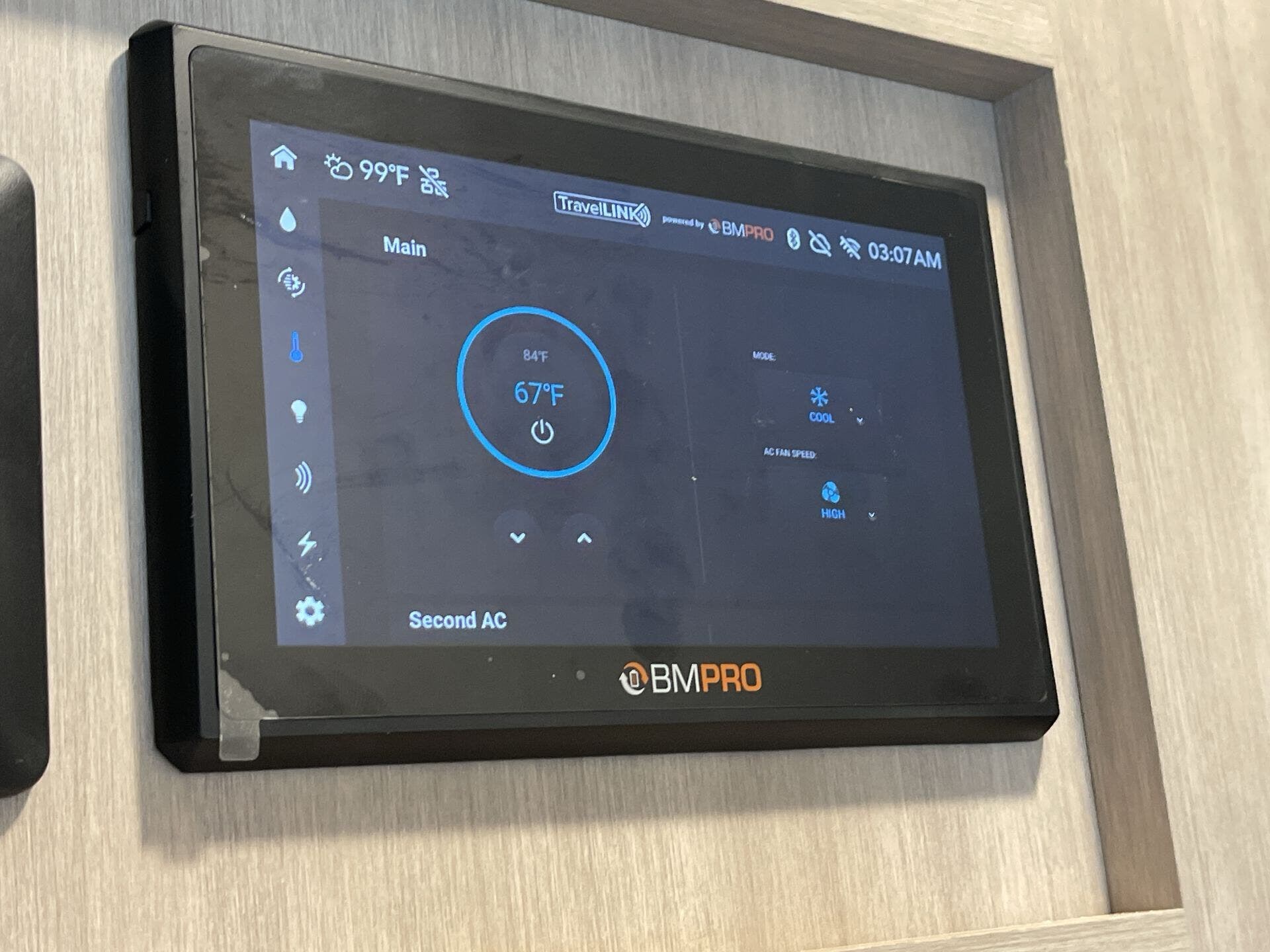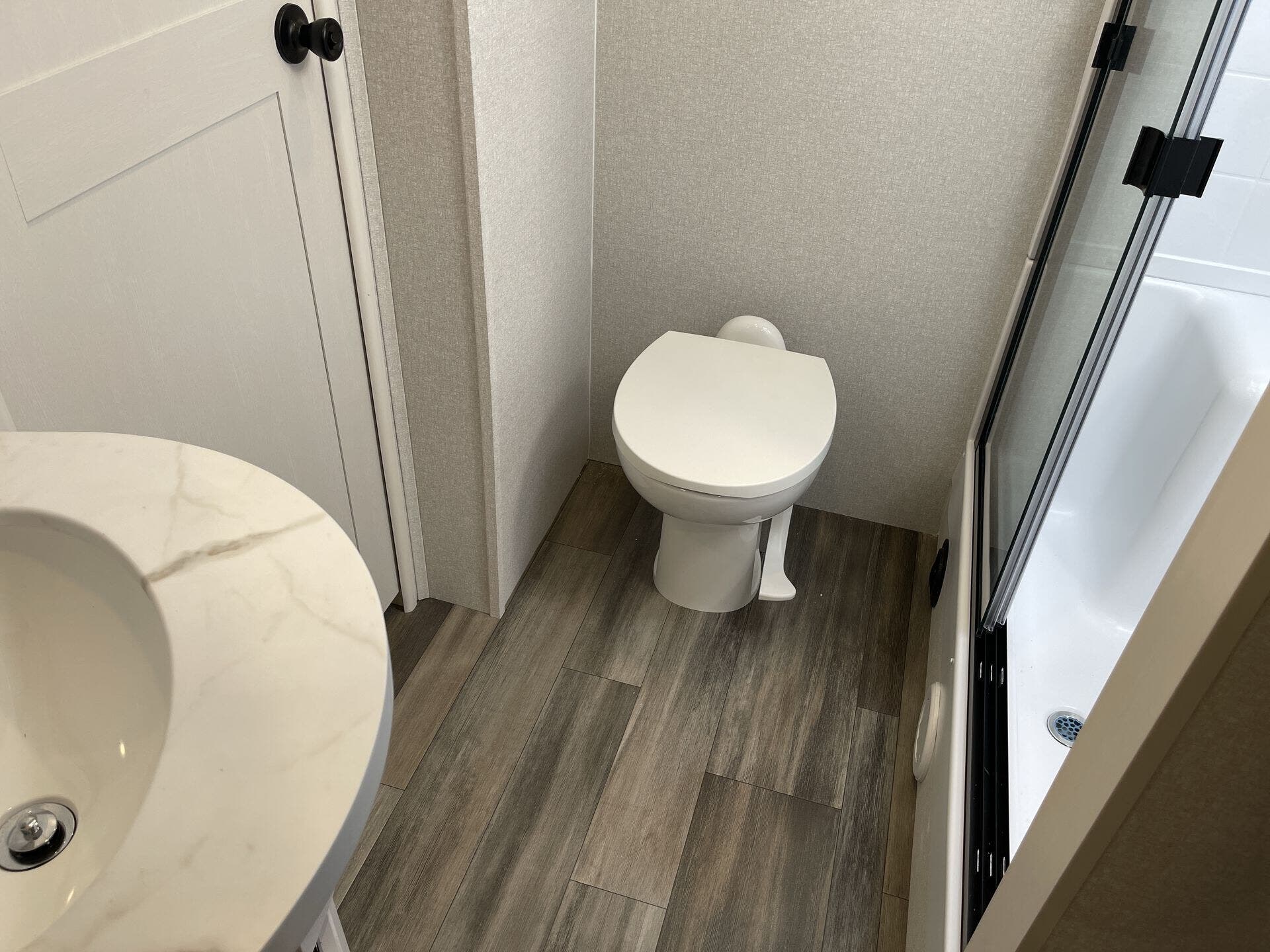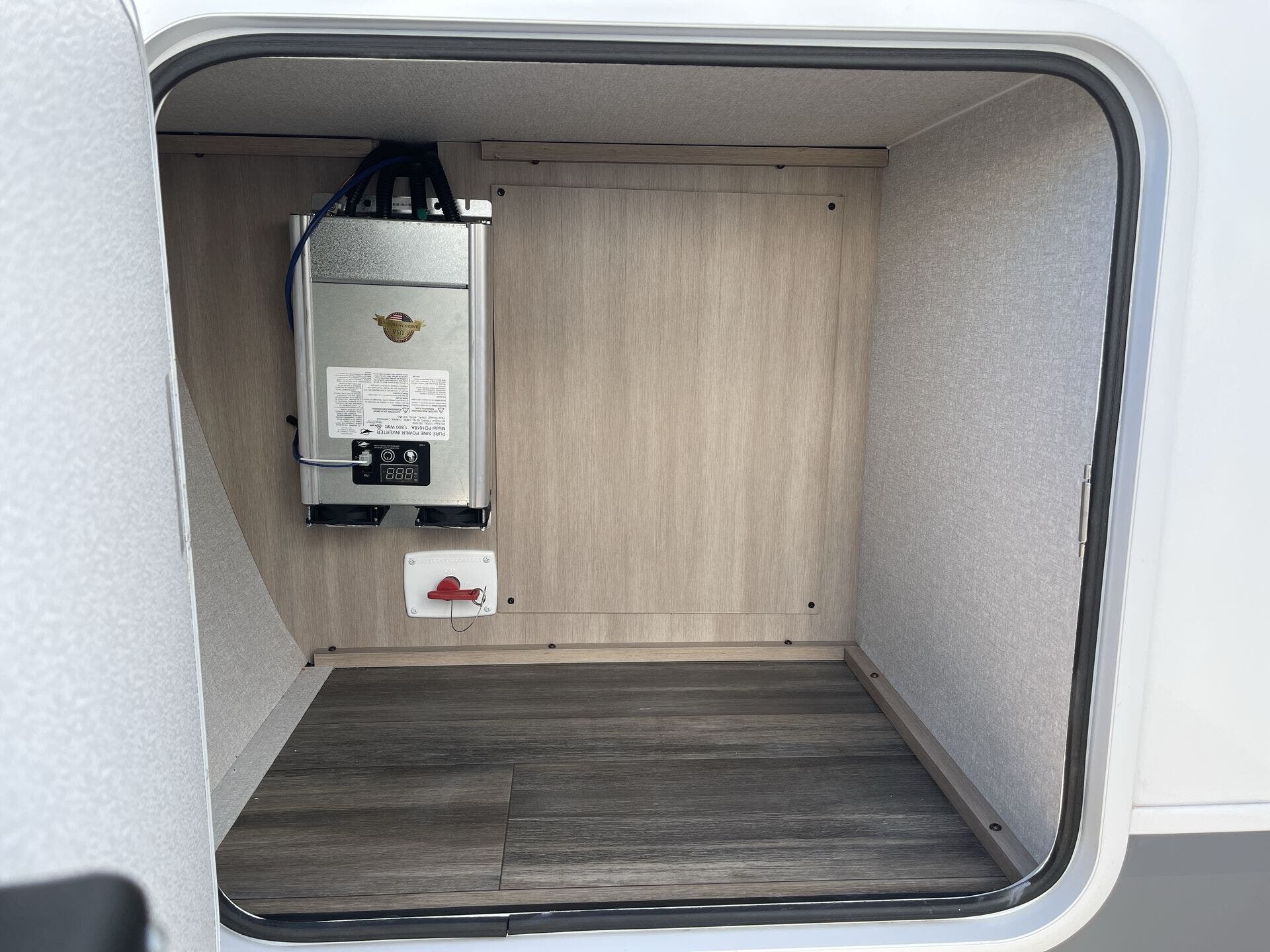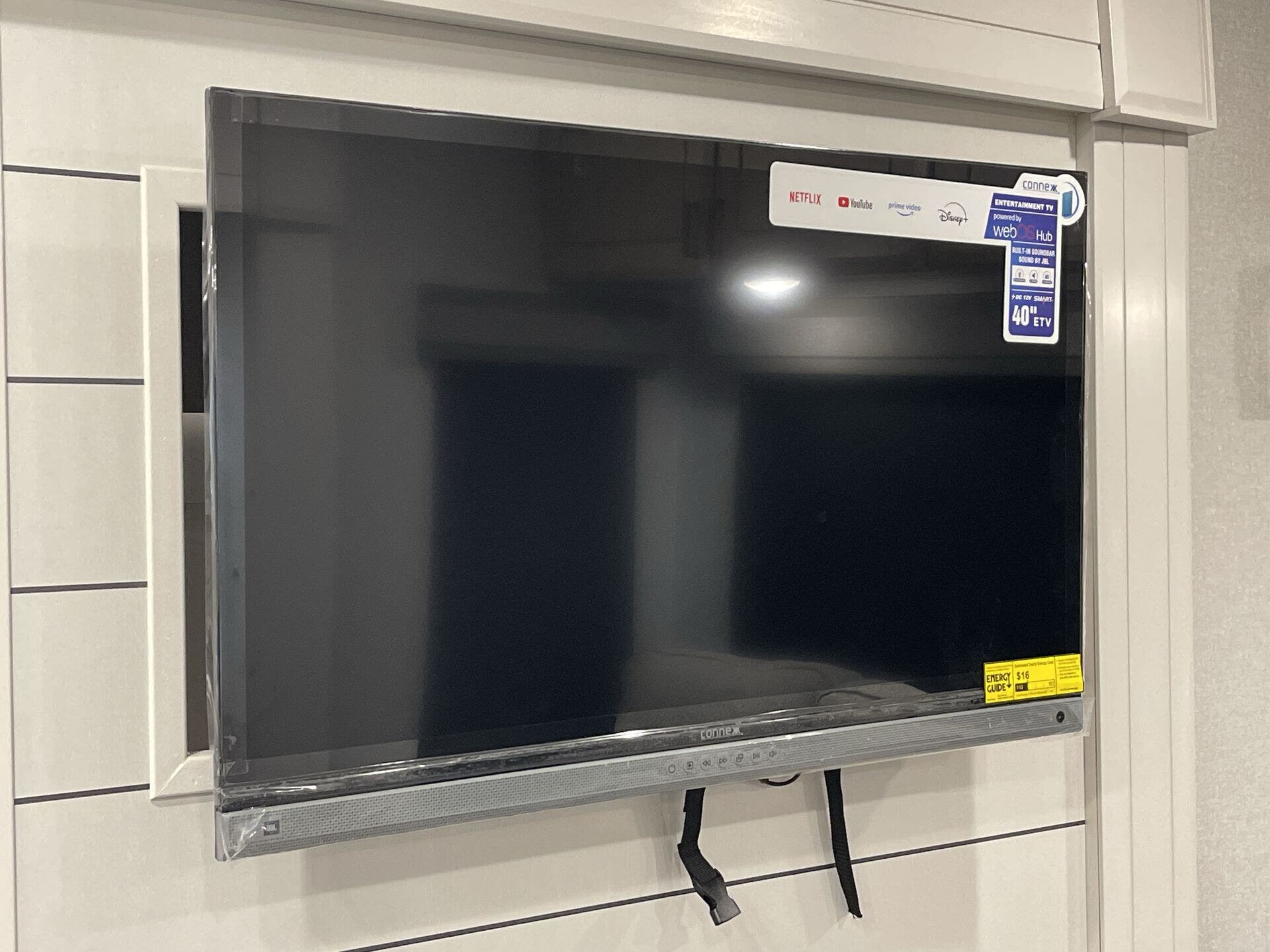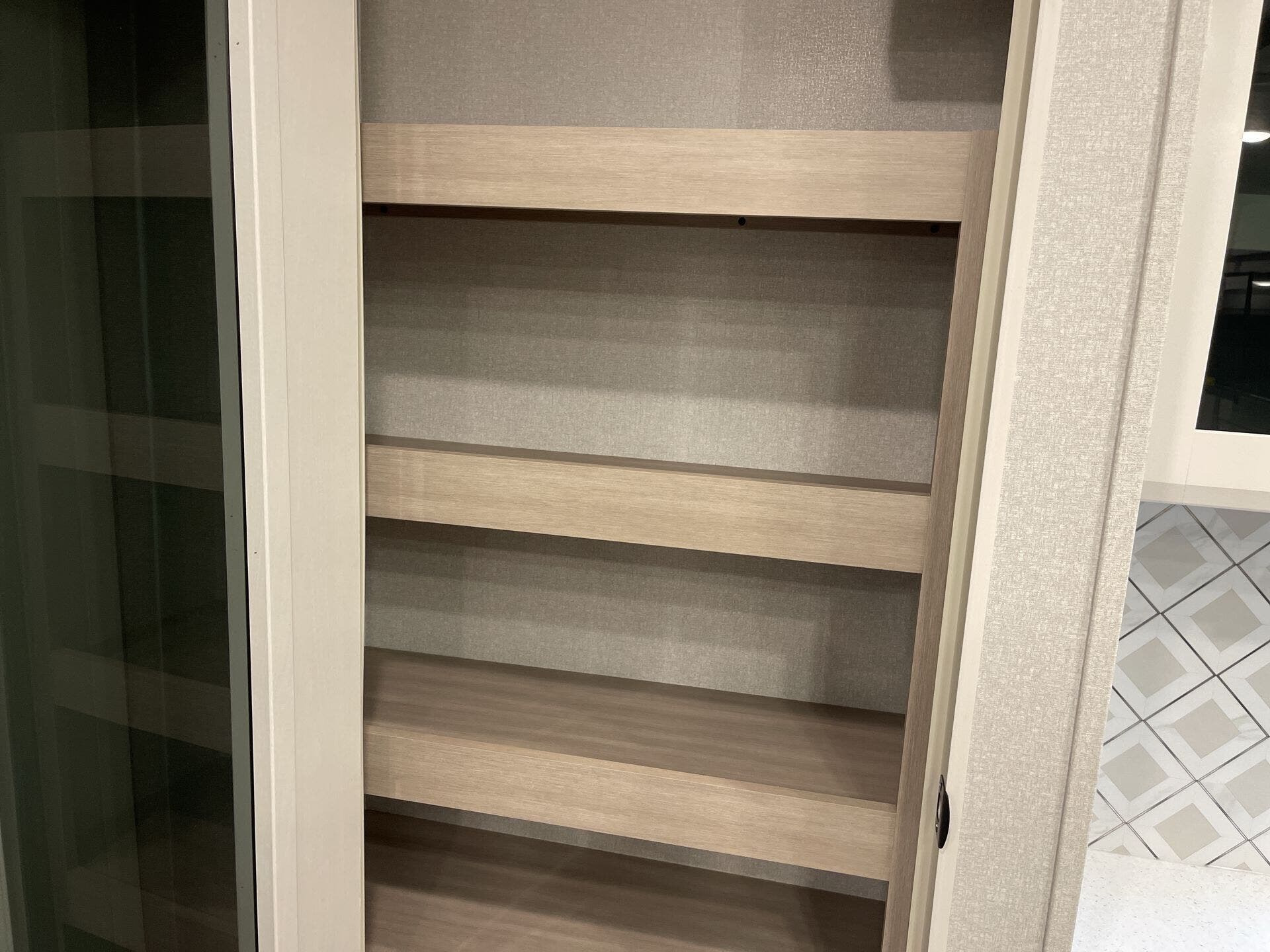 The front master suite features a queen slide-out bed, mirrored wardrobe, dresser, and washer/dryer prep. The central living area—equipped with two opposing slides—includes a kitchen island, pantry, free-standing table and chairs, theatre seating, and a tri-fold sofa facing a 50″ Smart HDTV and electric fireplace, making it perfect for relaxation and entertaining. The well-appointed central bathroom offers dual entry, a shower, vanity, and toilet. The fully equipped kitchen features a 20?cu?ft 12?V refrigerator, three-burner cooktop with oven, and 6-gal quick recovery gas/electric water heater.