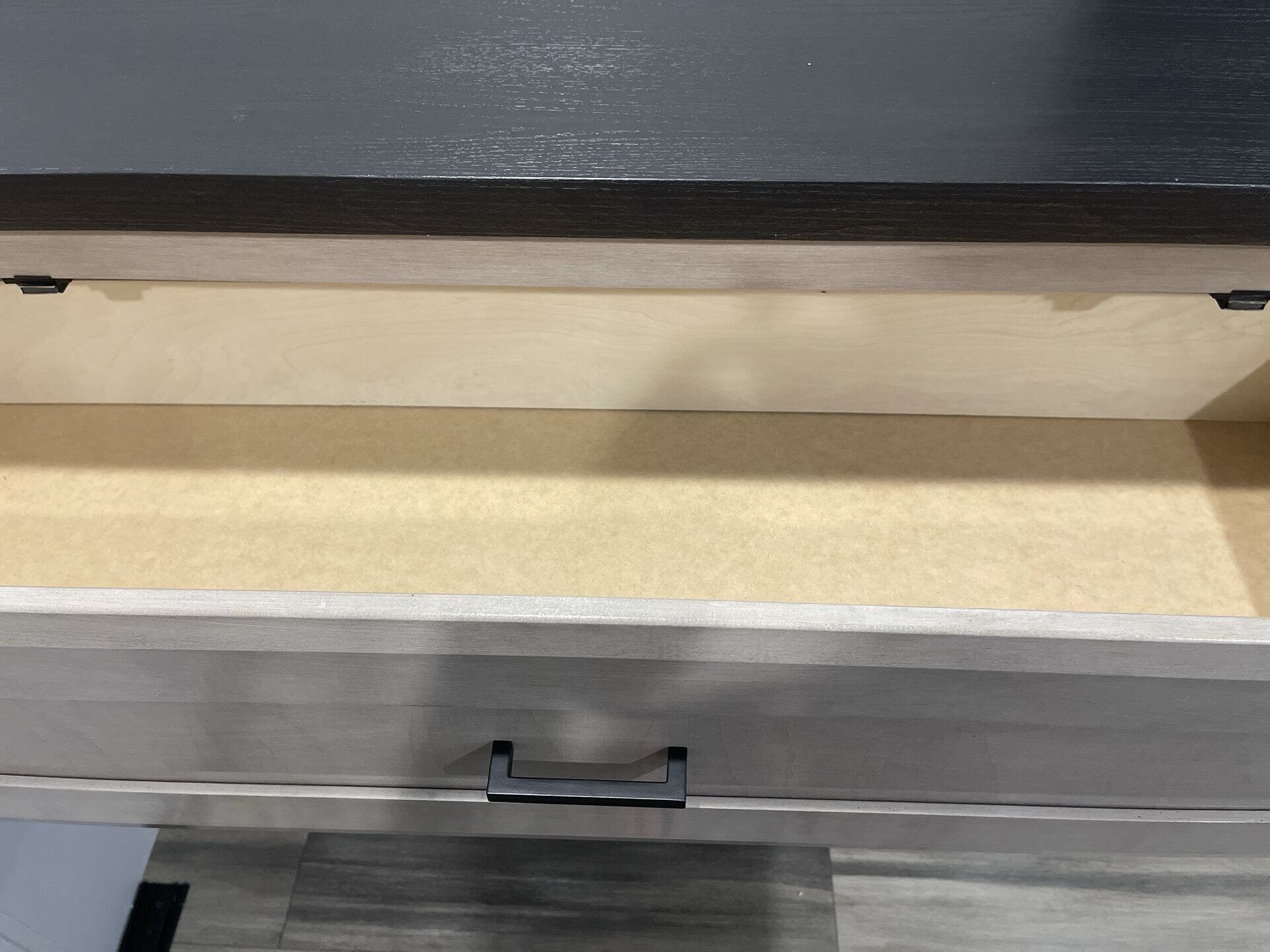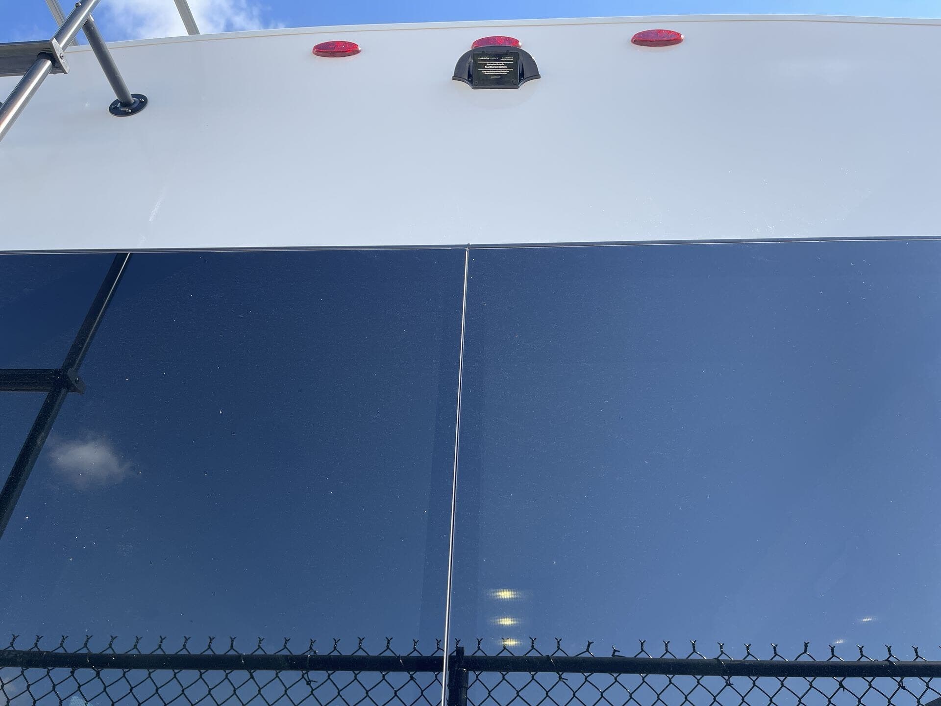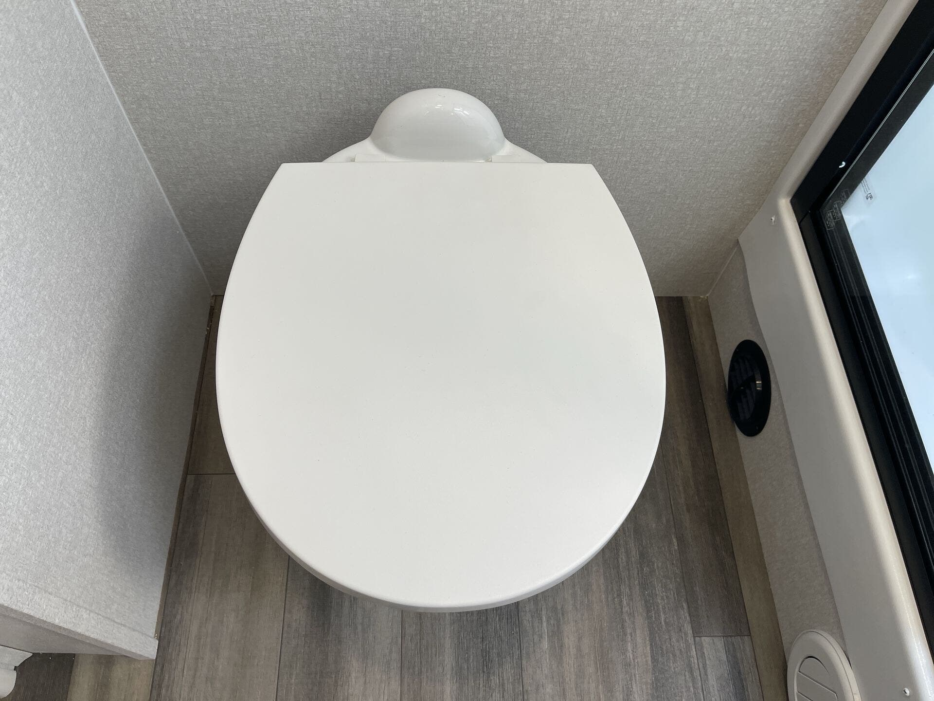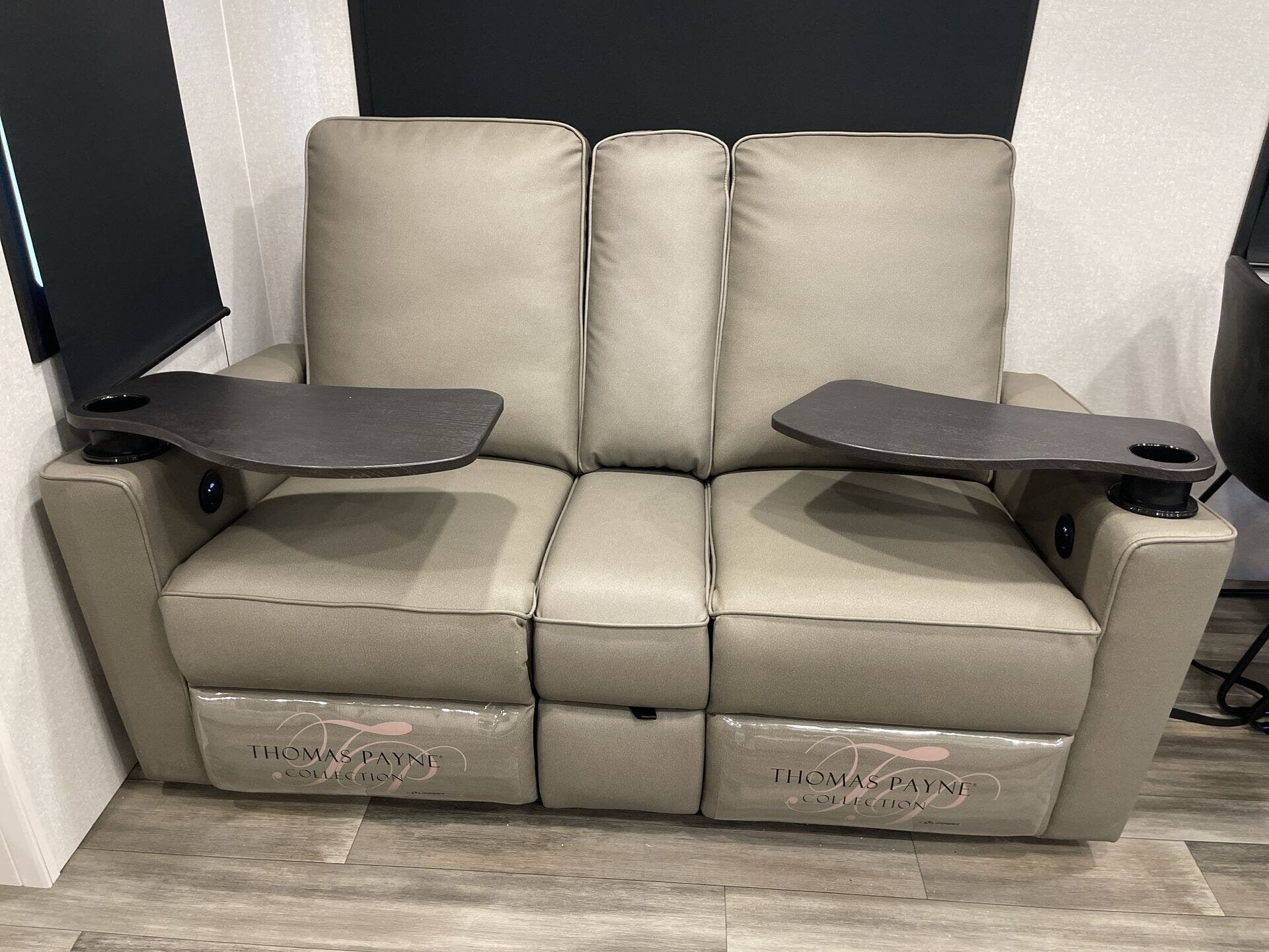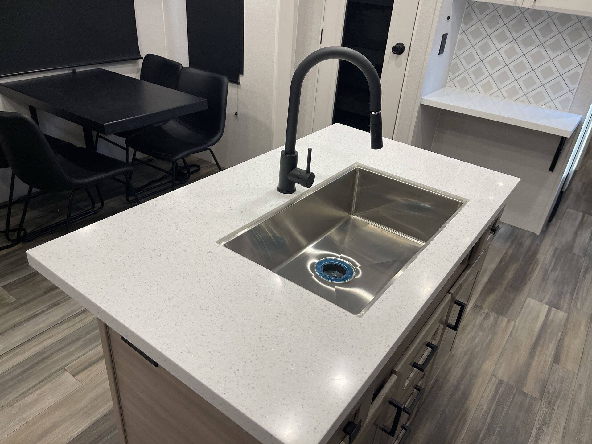 The front master suite features a queen slide-out bed, mirrored wardrobe, dresser, and washer/dryer prep. The central living area—equipped with two opposing slides—includes a kitchen island, pantry, free-standing table and chairs, theatre seating, and a tri-fold sofa facing a 50″ Smart HDTV and electric fireplace, making it perfect for relaxation and entertaining. The well-appointed central bathroom offers dual entry, a shower, vanity, and toilet. The fully equipped kitchen features a 20?cu?ft 12?V refrigerator, three-burner cooktop with oven, and 6-gal quick recovery gas/electric water heater.