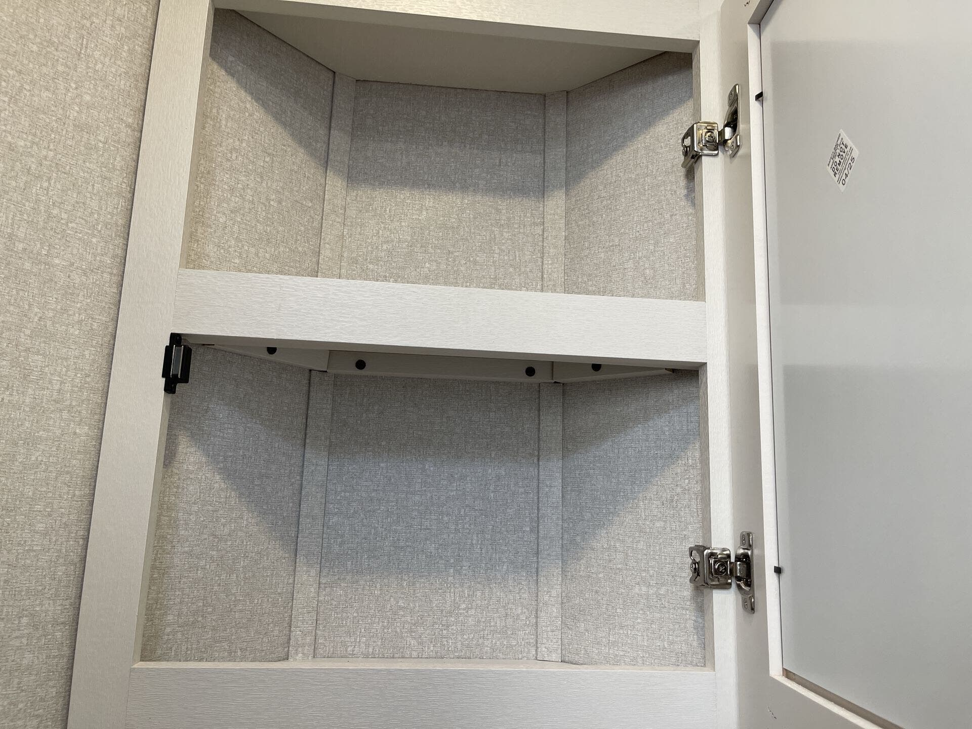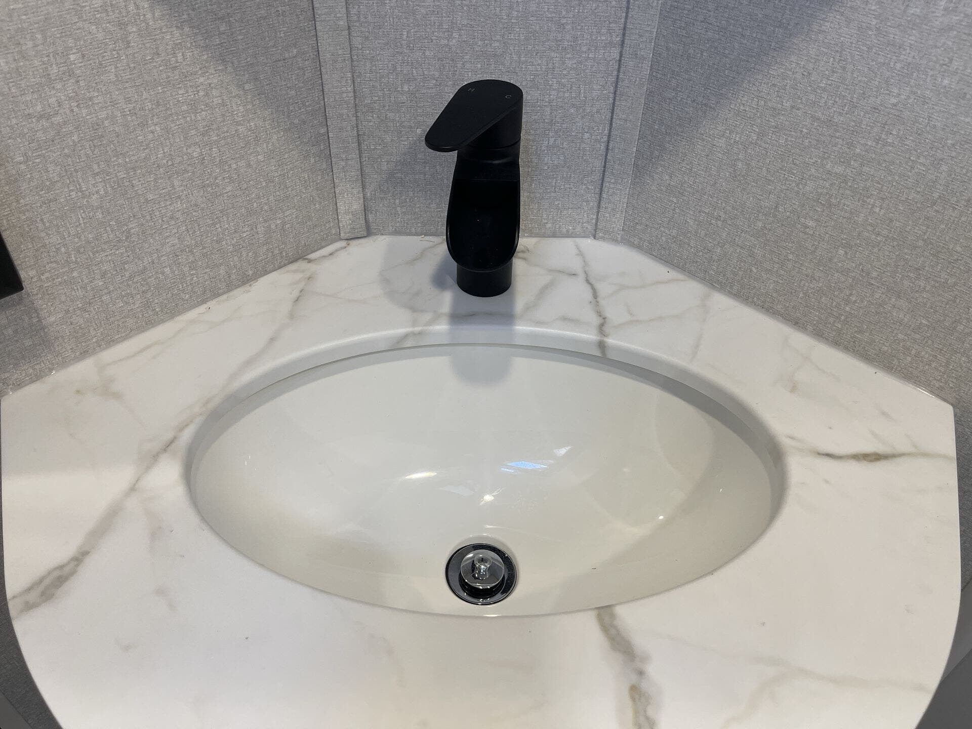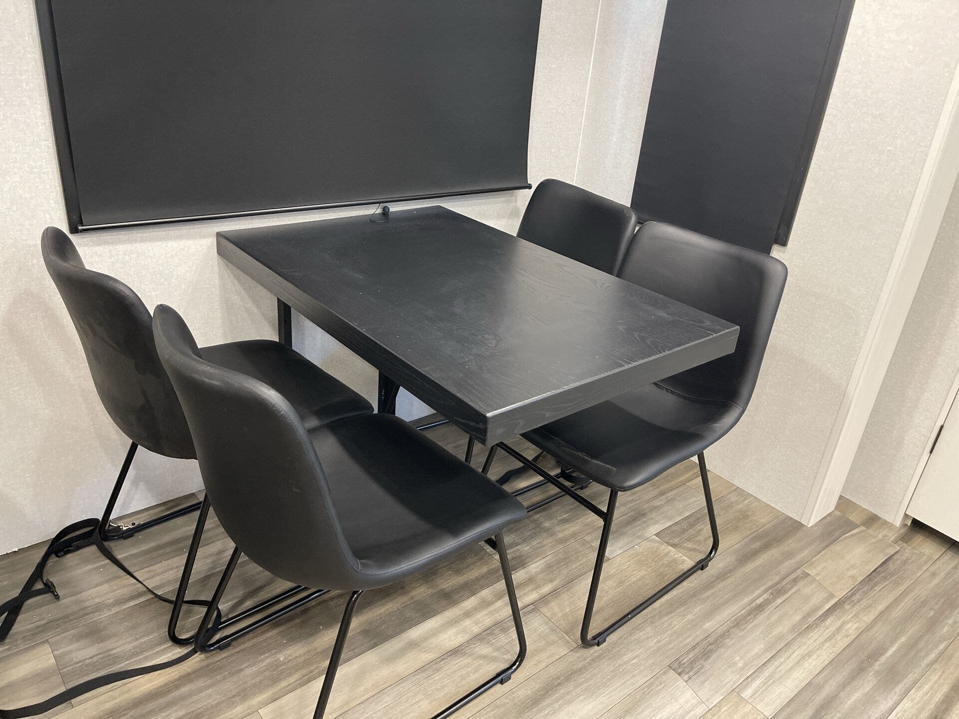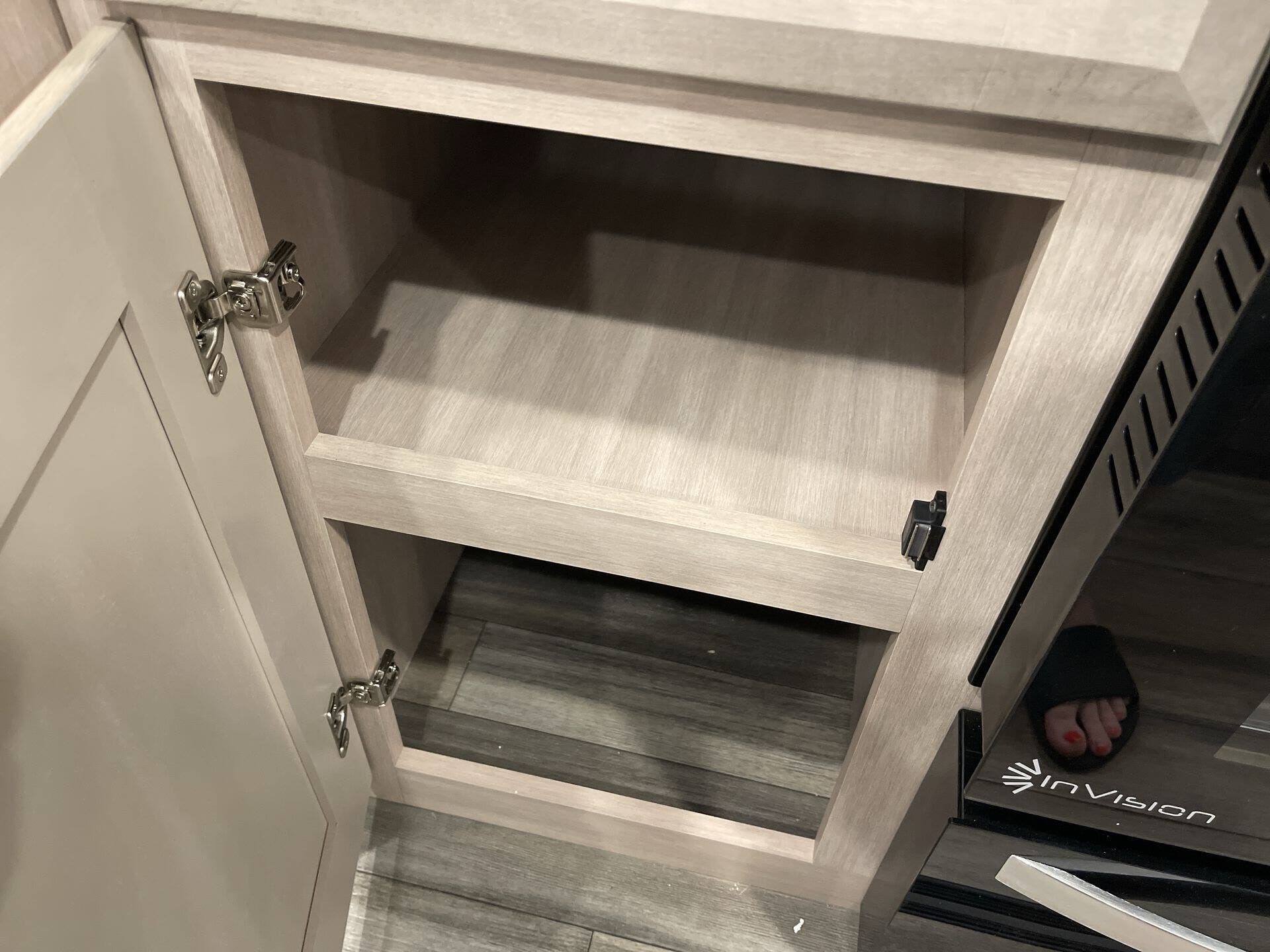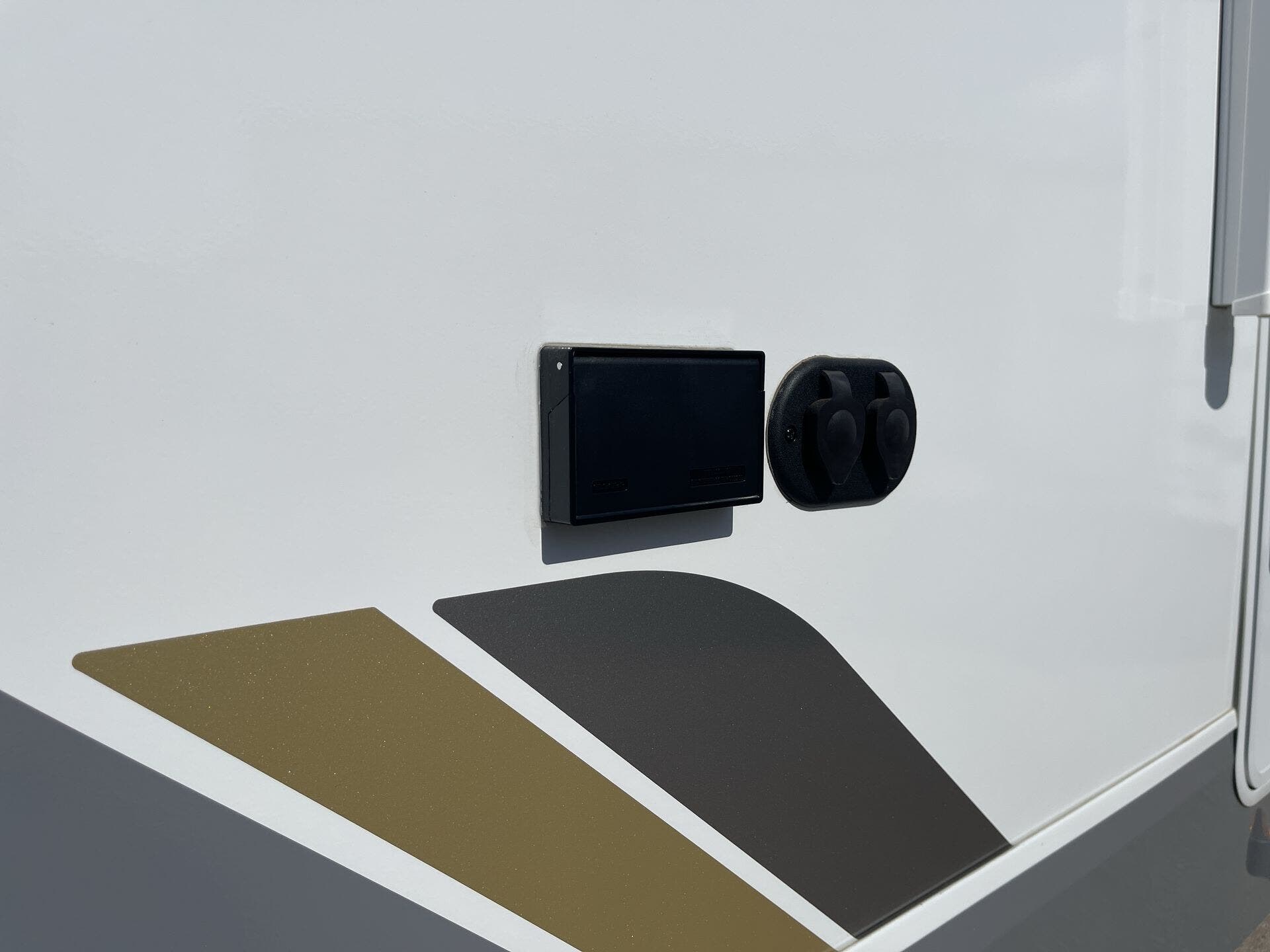 The front master suite features a queen slide-out bed, mirrored wardrobe, dresser, and washer/dryer prep. The central living area—equipped with two opposing slides—includes a kitchen island, pantry, free-standing table and chairs, theatre seating, and a tri-fold sofa facing a 50″ Smart HDTV and electric fireplace, making it perfect for relaxation and entertaining. The well-appointed central bathroom offers dual entry, a shower, vanity, and toilet. The fully equipped kitchen features a 20?cu?ft 12?V refrigerator, three-burner cooktop with oven, and 6-gal quick recovery gas/electric water heater.