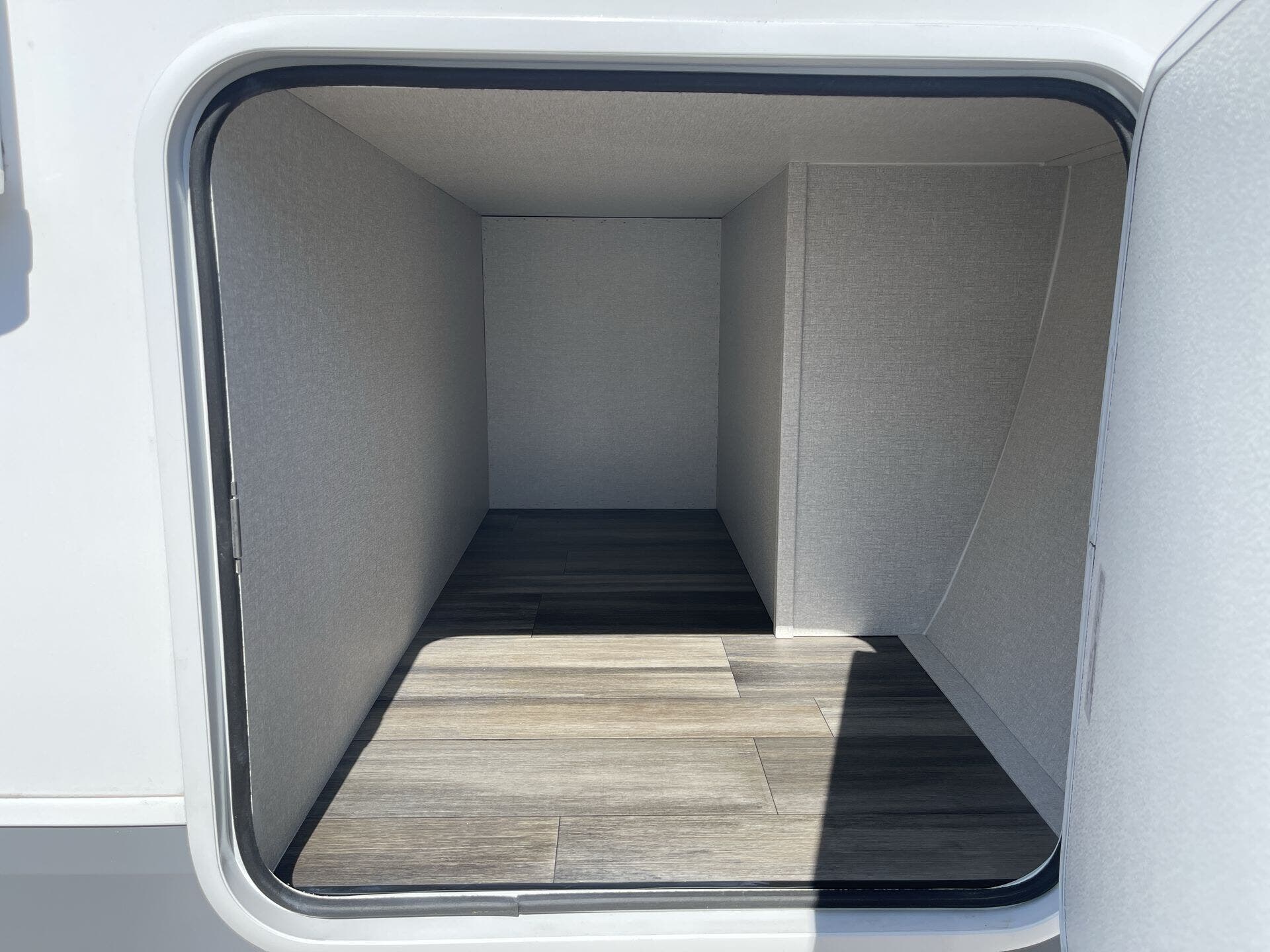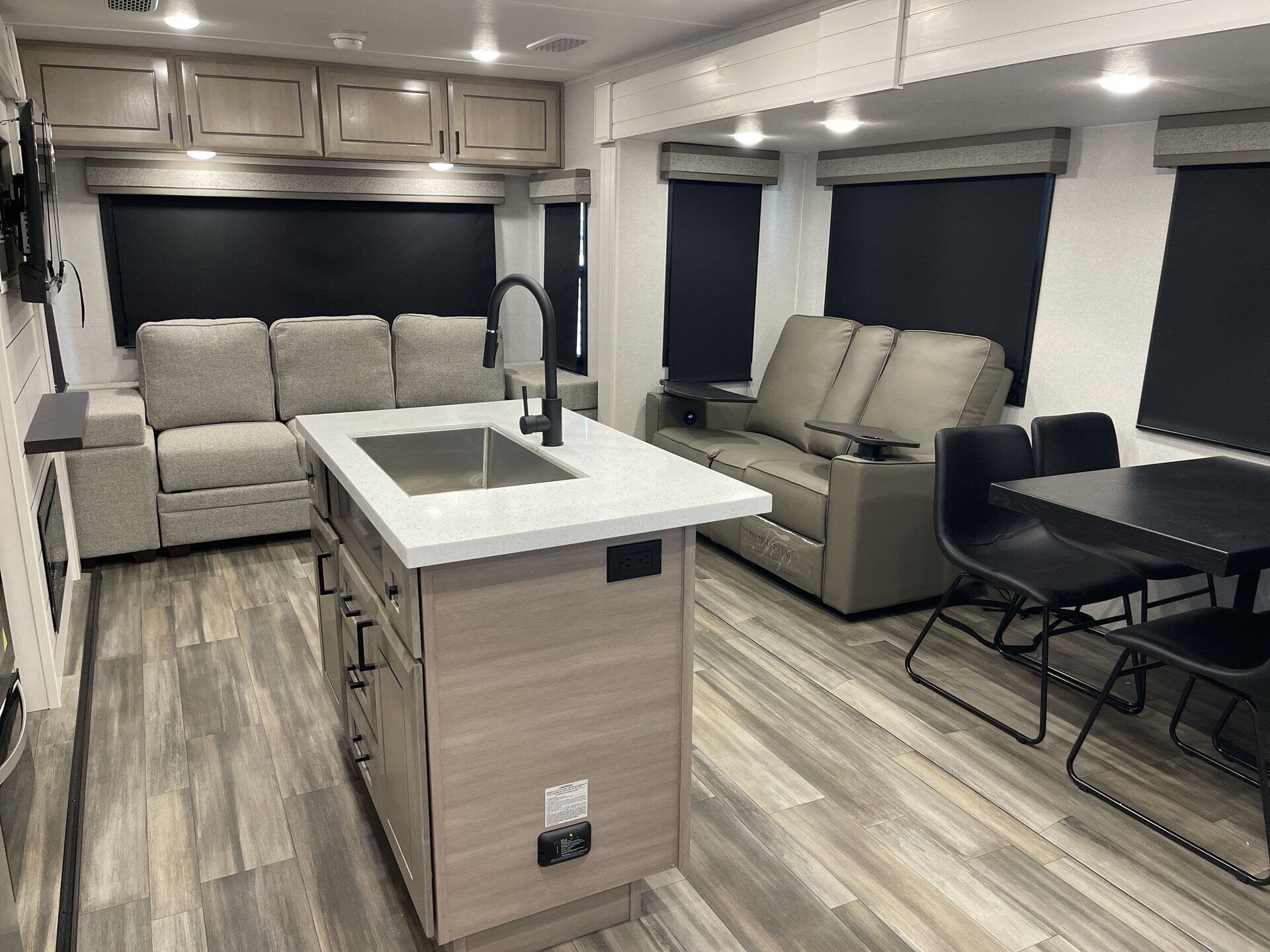 The 322RLS is a luxurious full-profile travel trailer spanning 37′ 9″ with a GVWR of 11,500lb, a dry weight of 9,485lb, and 2,140lb of cargo capacity. It rests on a durable aluminum frame with fiberglass sidewalls and a one-piece TPO roof, and it includes a heated/enclosed underbelly, suspended tanks, and optional four-season insulation packages, making it ideal for year-round use . With three power slide-outs, dual electric awnings, power tongue jack, and a sleek ocean-linen exterior, this model blends rugged build quality with refined style .