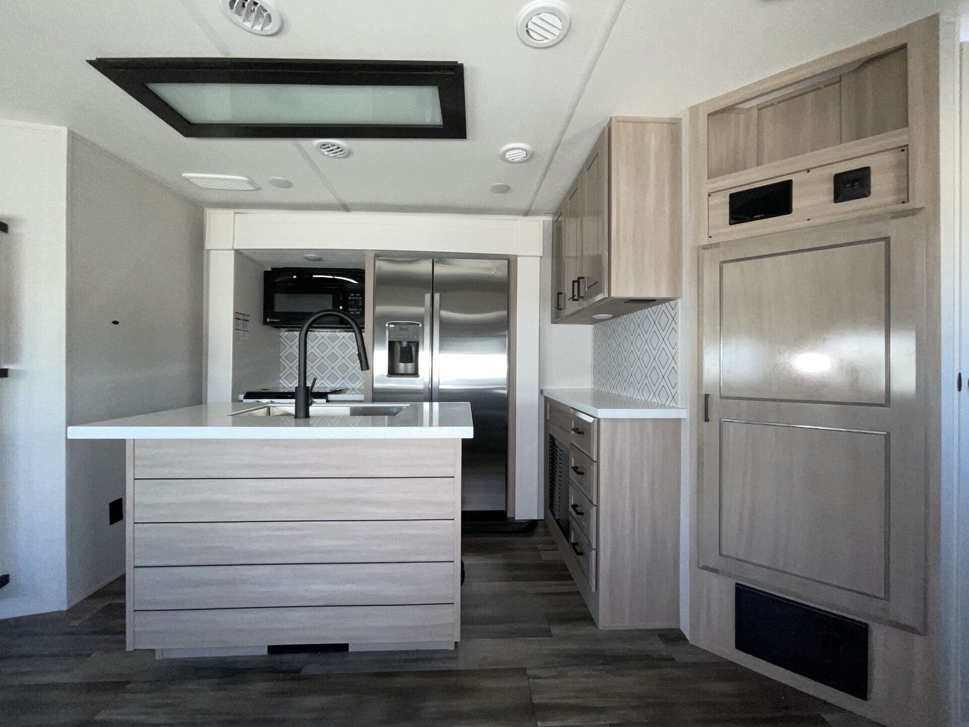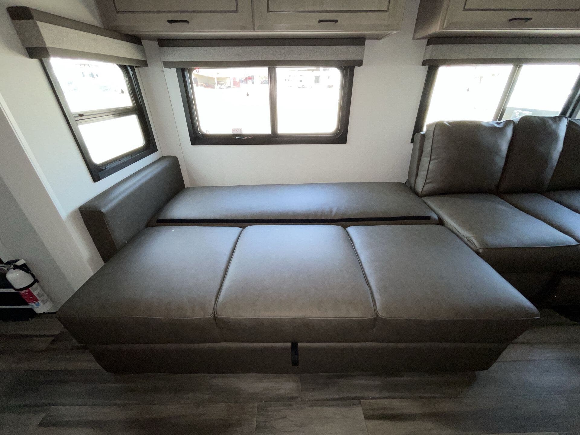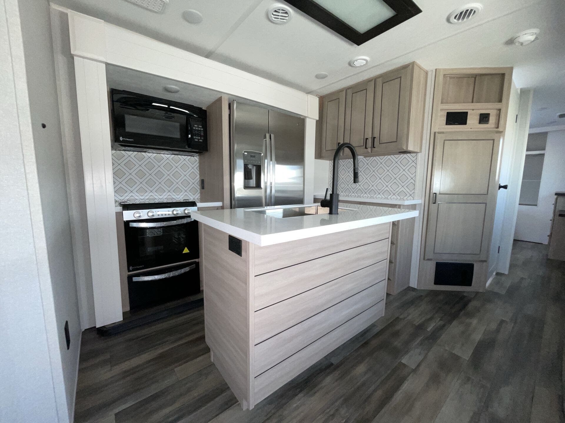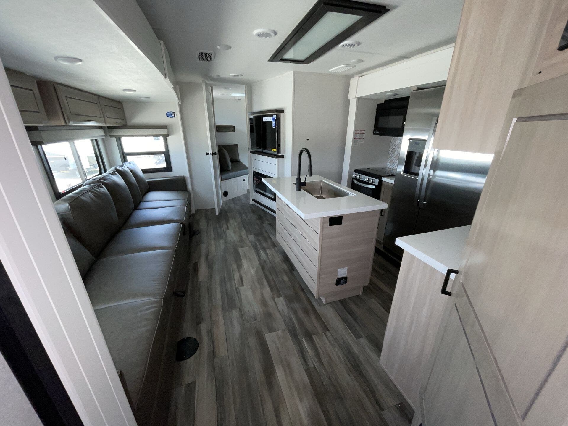 Once you’re parked and both slide-outs are open, the living and kitchen area feels spacious and livable. The kitchen has solid counter space and thoughtful storage, so cooking meals out on the road actually makes sense — not just heating stuff up. There’s room to move, room to prep, and room to relax without bumping into stuff.
