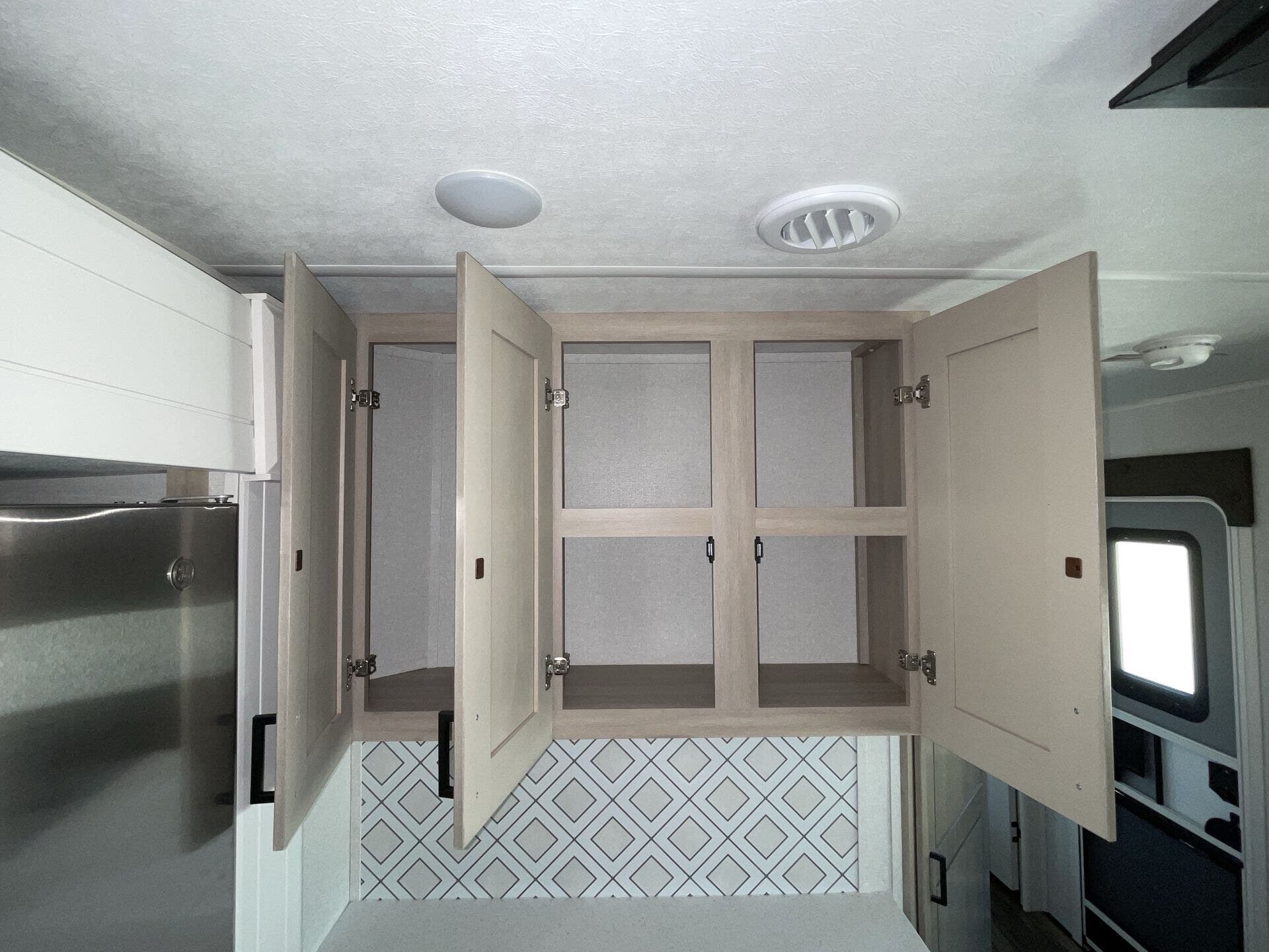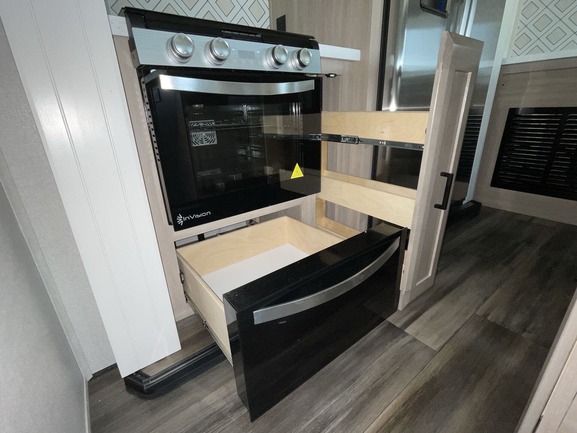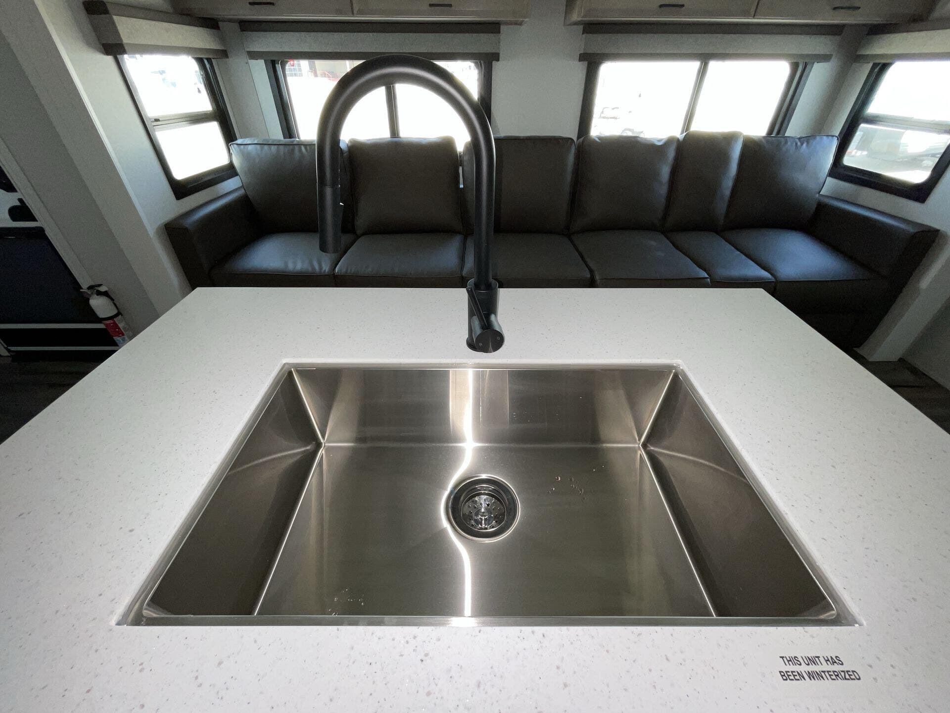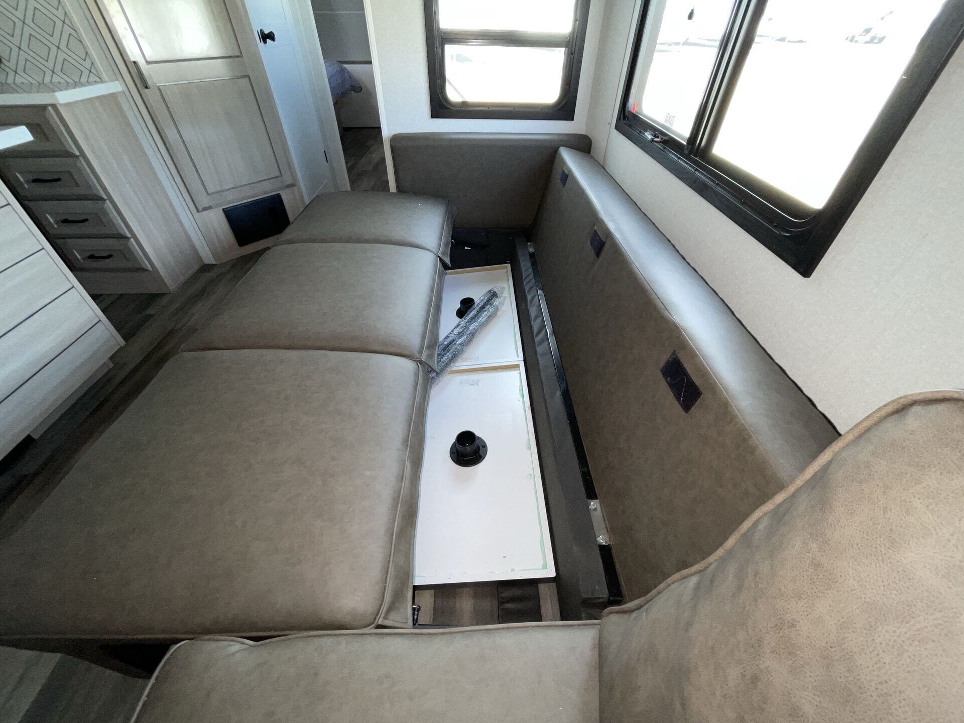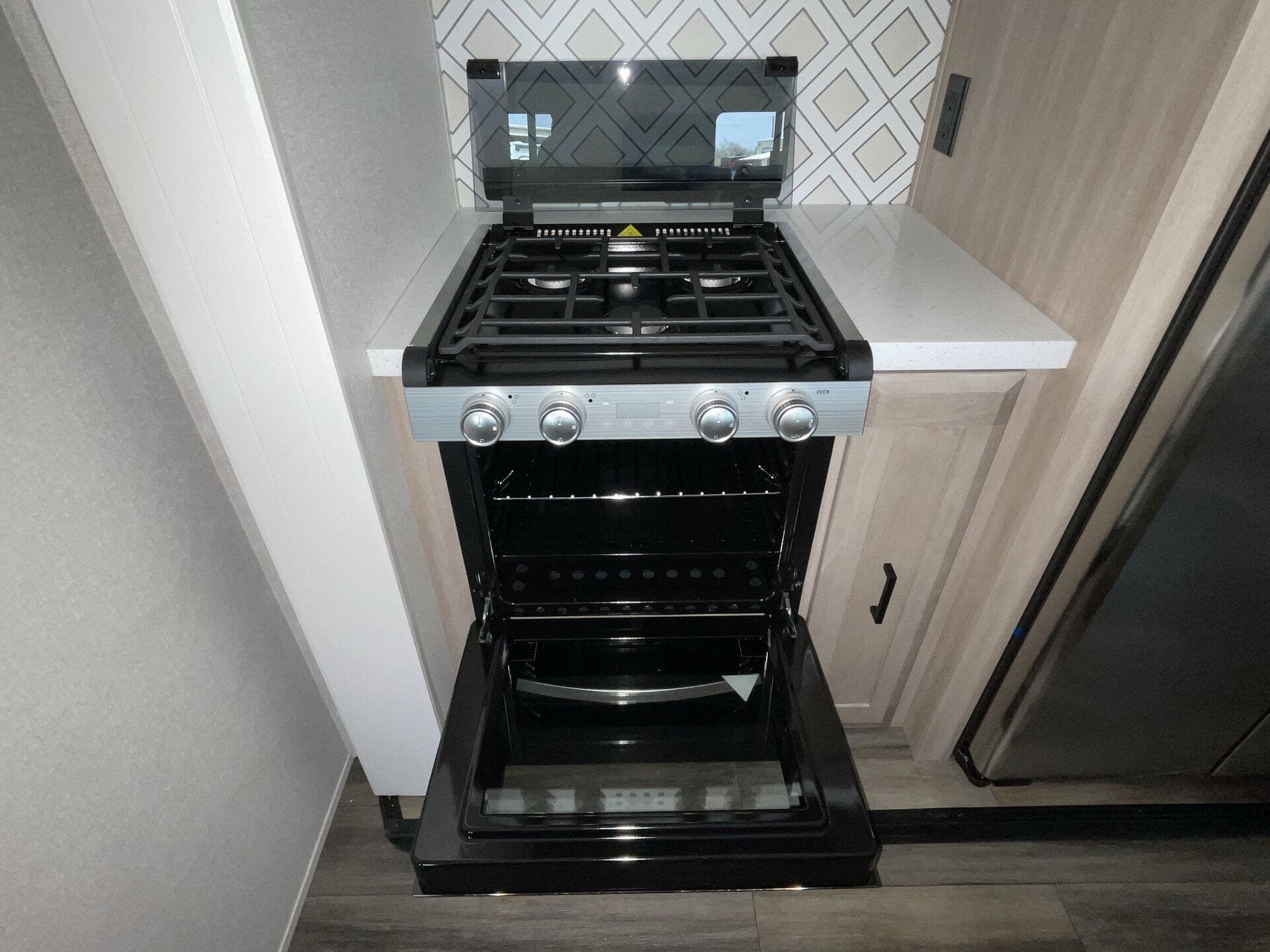 Once you’re parked and both slide-outs are open, the living and kitchen area feels spacious and livable. The kitchen has solid counter space and thoughtful storage, so cooking meals out on the road actually makes sense — not just heating stuff up. There’s room to move, room to prep, and room to relax without bumping into stuff.