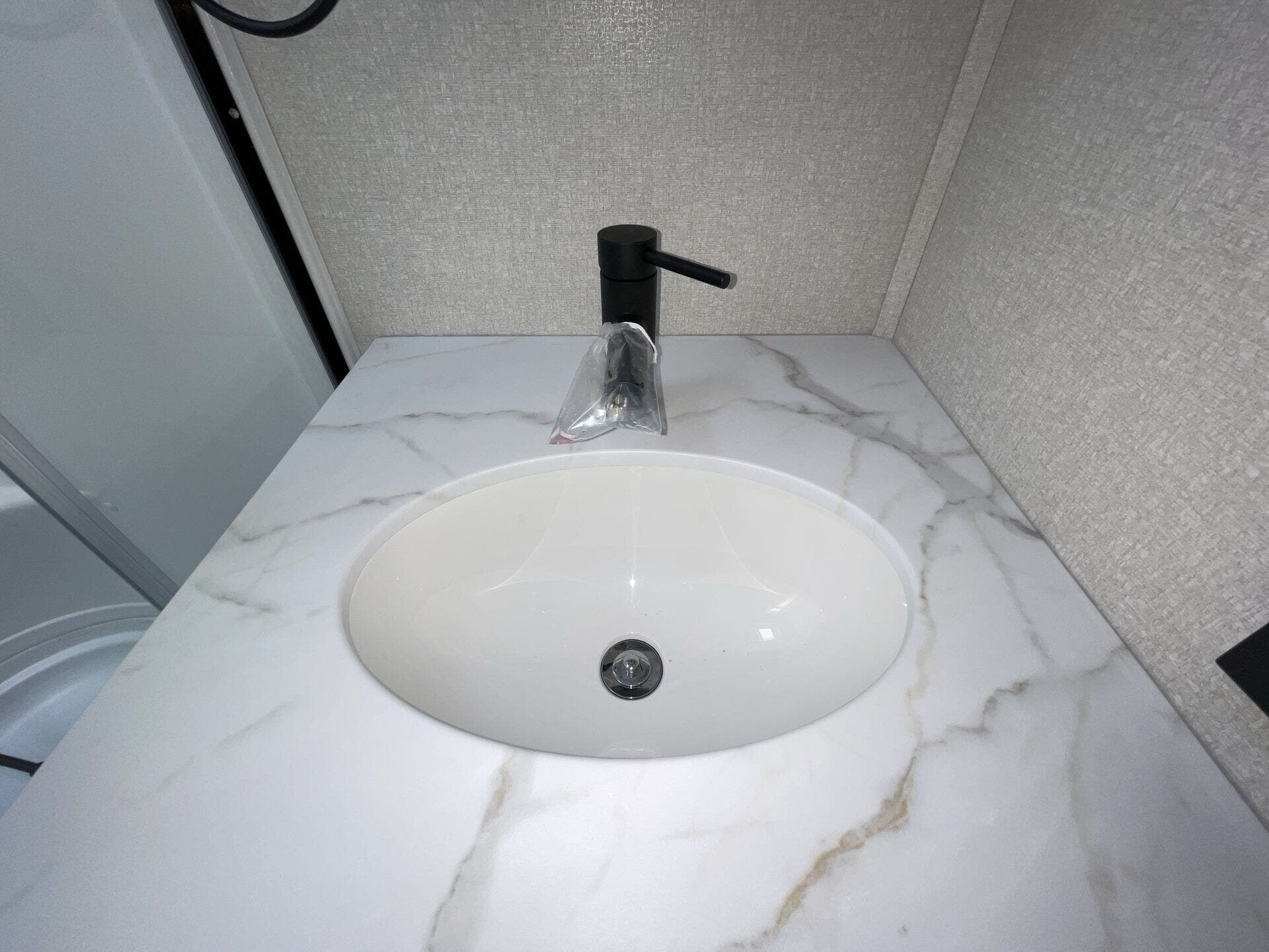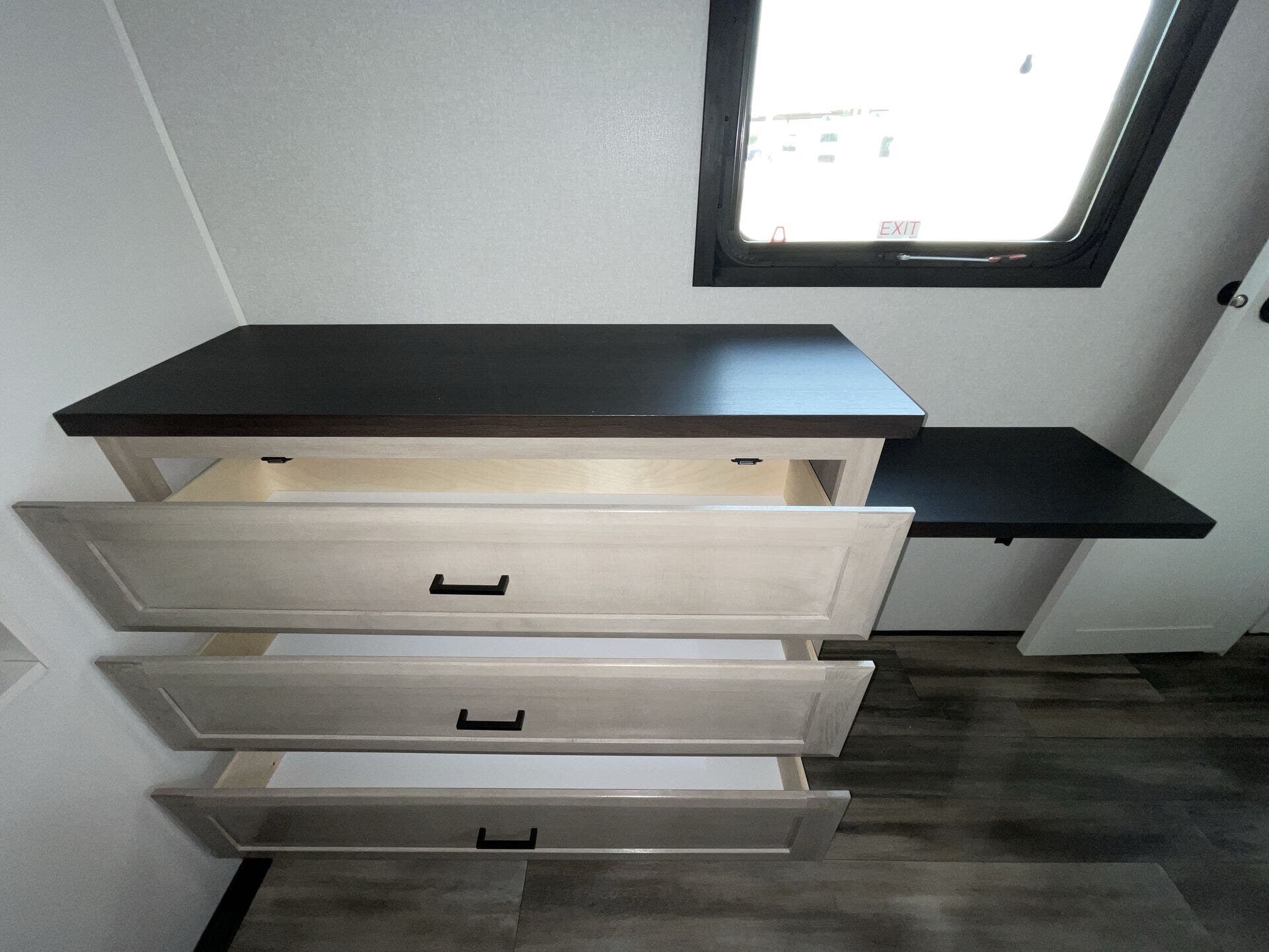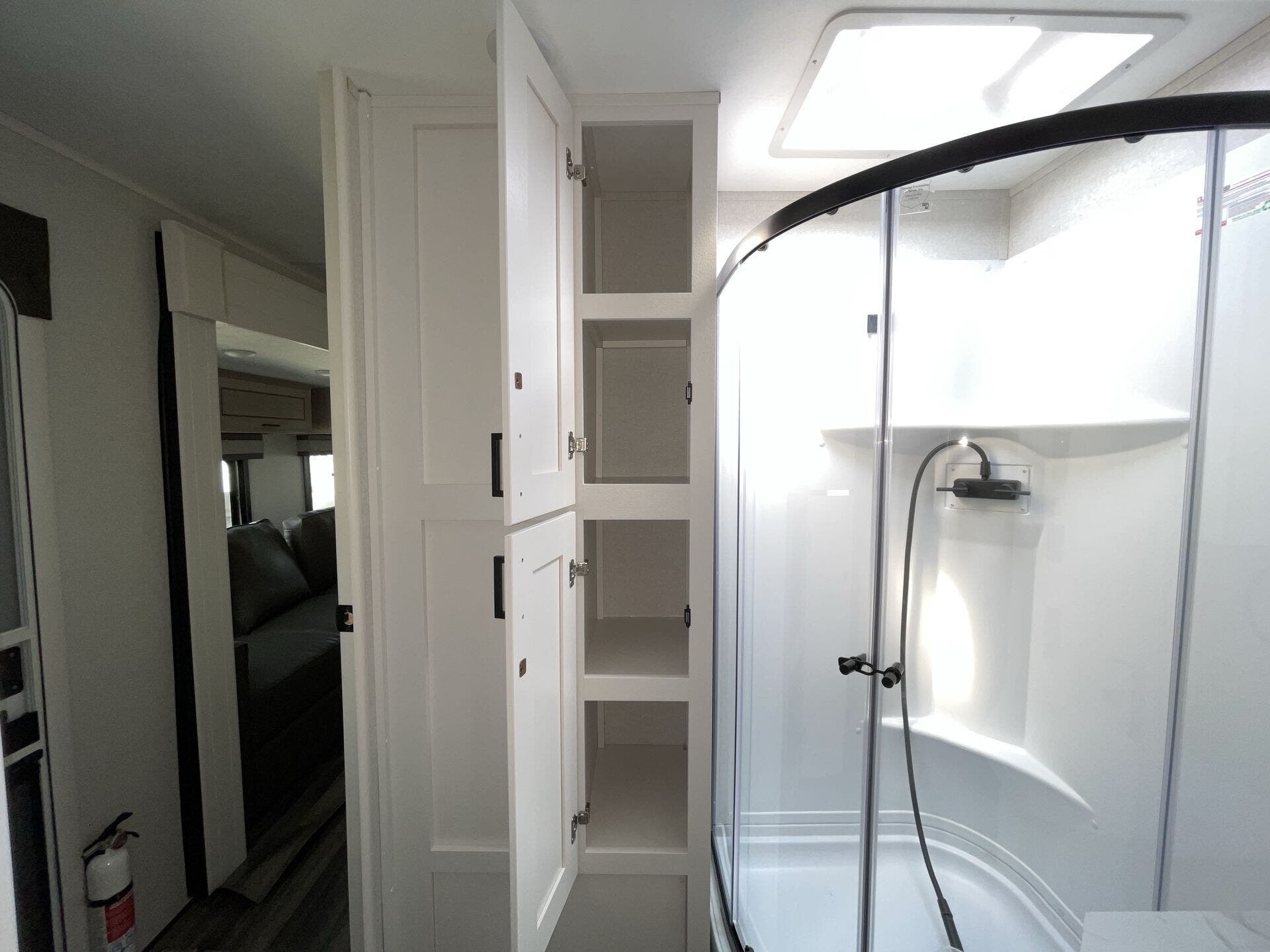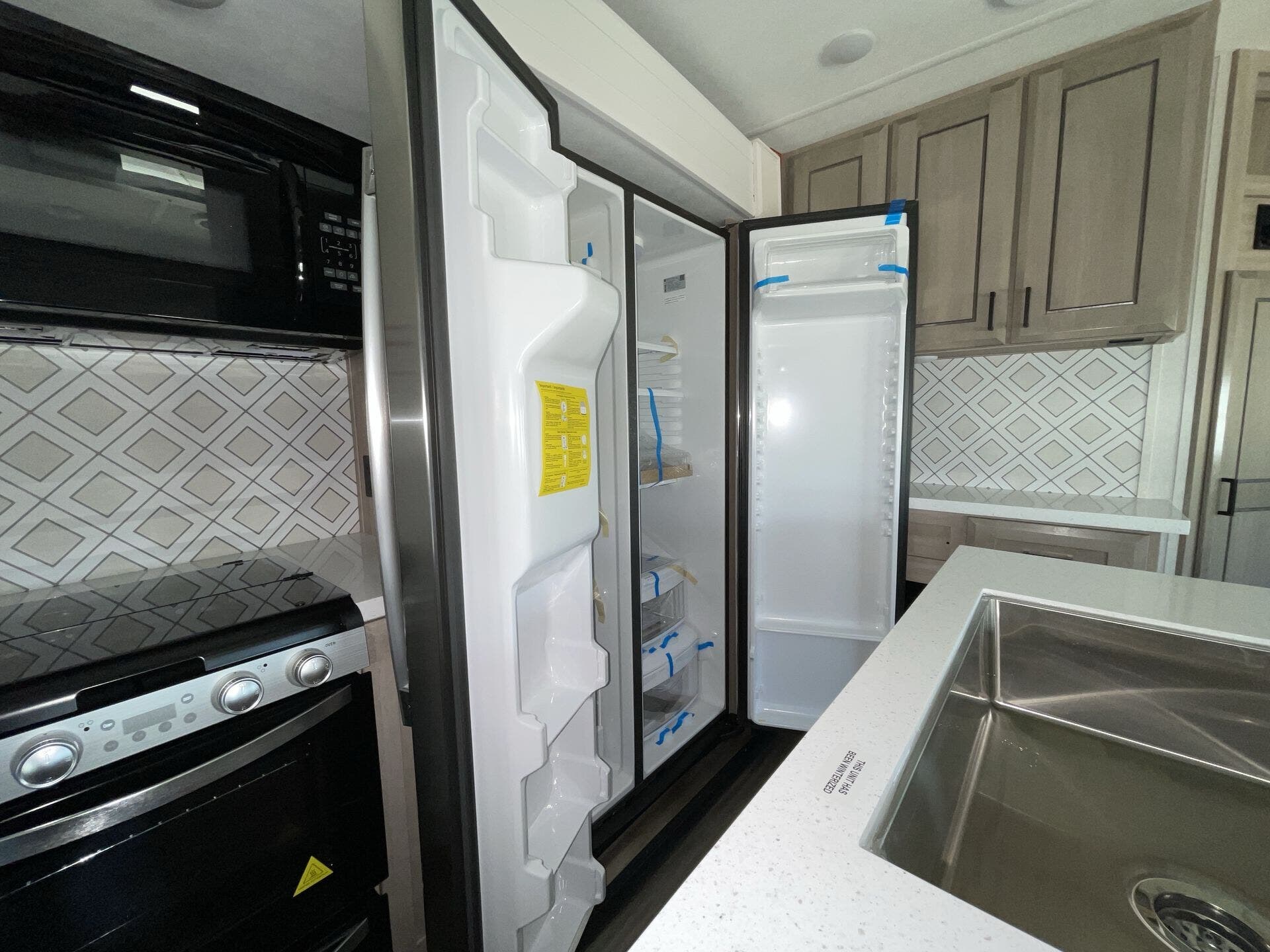 Once you’re parked and both slide-outs are open, the living and kitchen area feels spacious and livable. The kitchen has solid counter space and thoughtful storage, so cooking meals out on the road actually makes sense — not just heating stuff up. There’s room to move, room to prep, and room to relax without bumping into stuff.