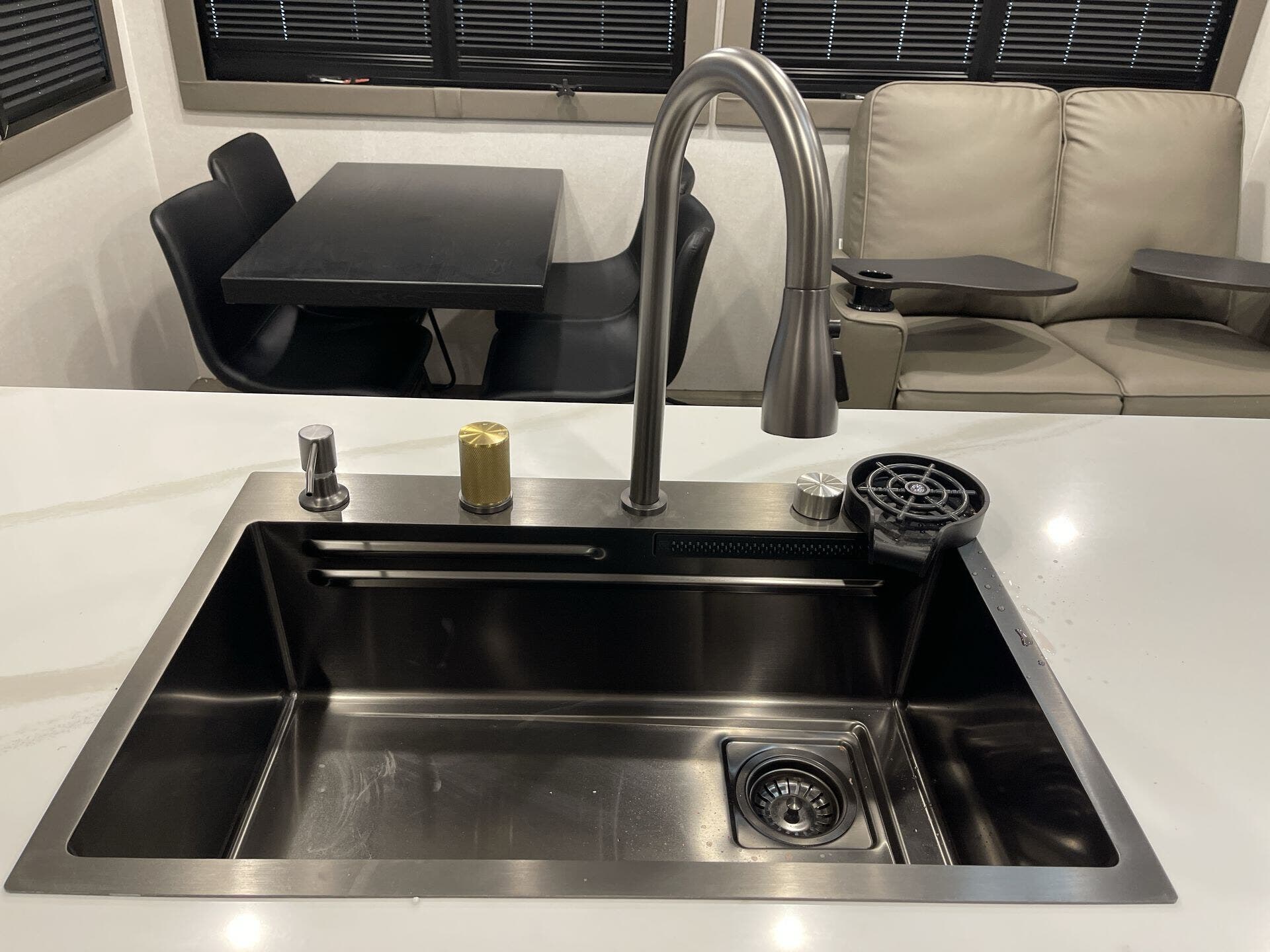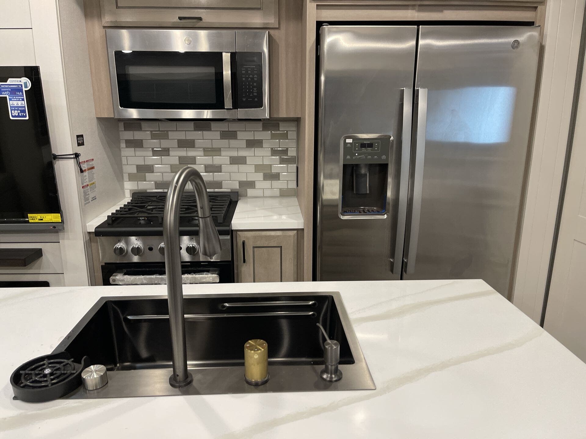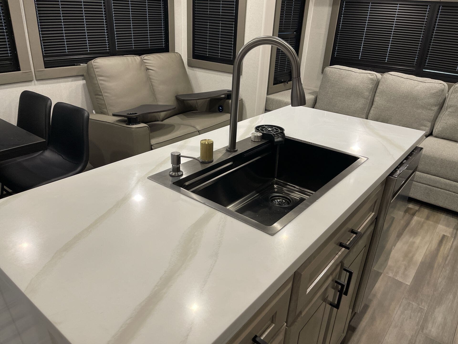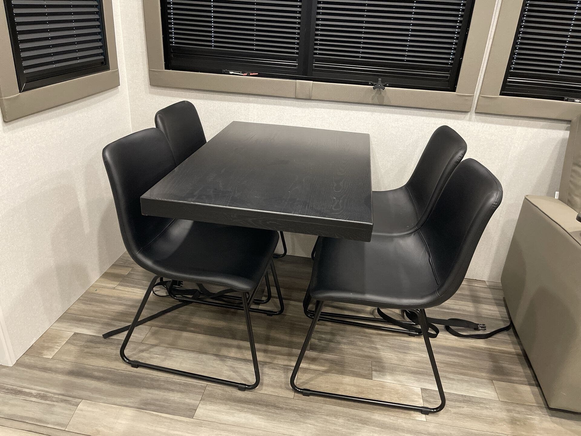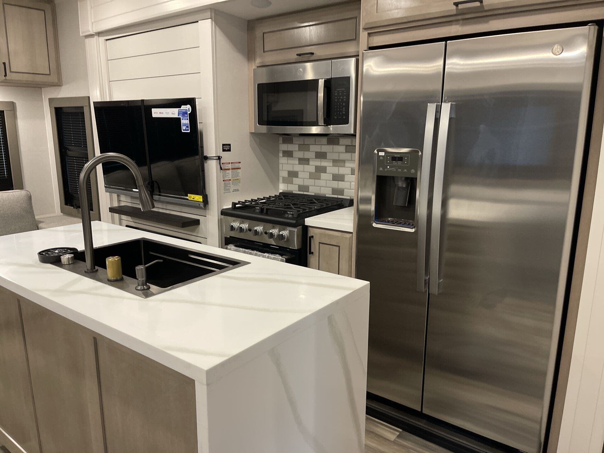 Inside, the 372MBH features a mid-bunk room with a queen-size tri-fold sofa, desk, and overhead loft, providing versatile sleeping and storage options. The rear living area includes theater seating, a tri-fold sofa, fireplace, and smart TV, creating a cozy environment for relaxation. The central kitchen is equipped with a four-burner cooktop, oven, microwave, 21 cu. ft. GE residential refrigerator, and solid-surface countertops, ensuring all the conveniences of home. The kitchen island and free-standing dinette offer additional workspace and dining comfort.