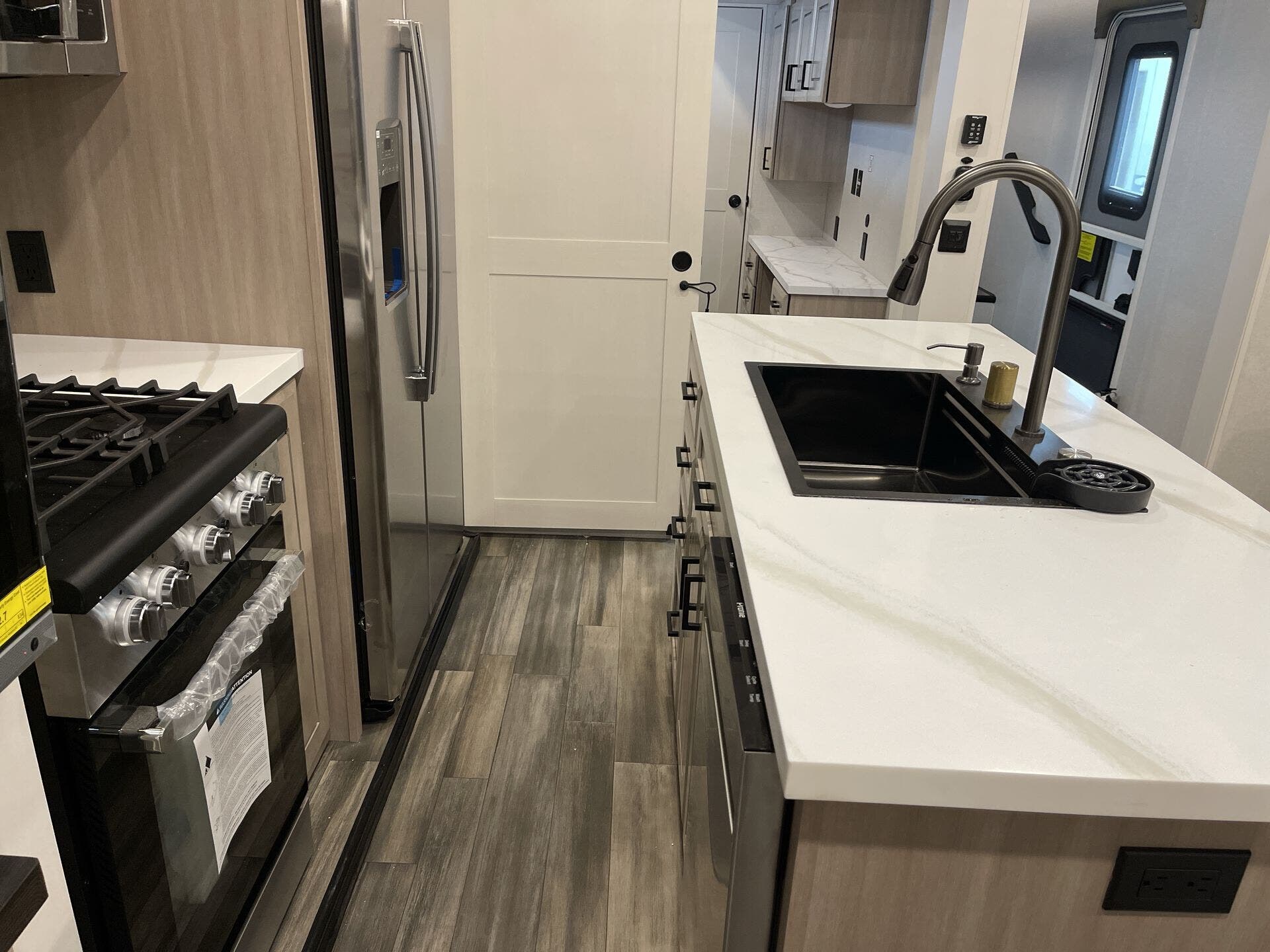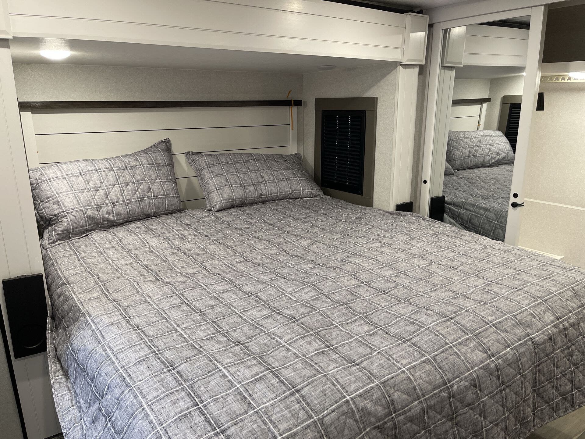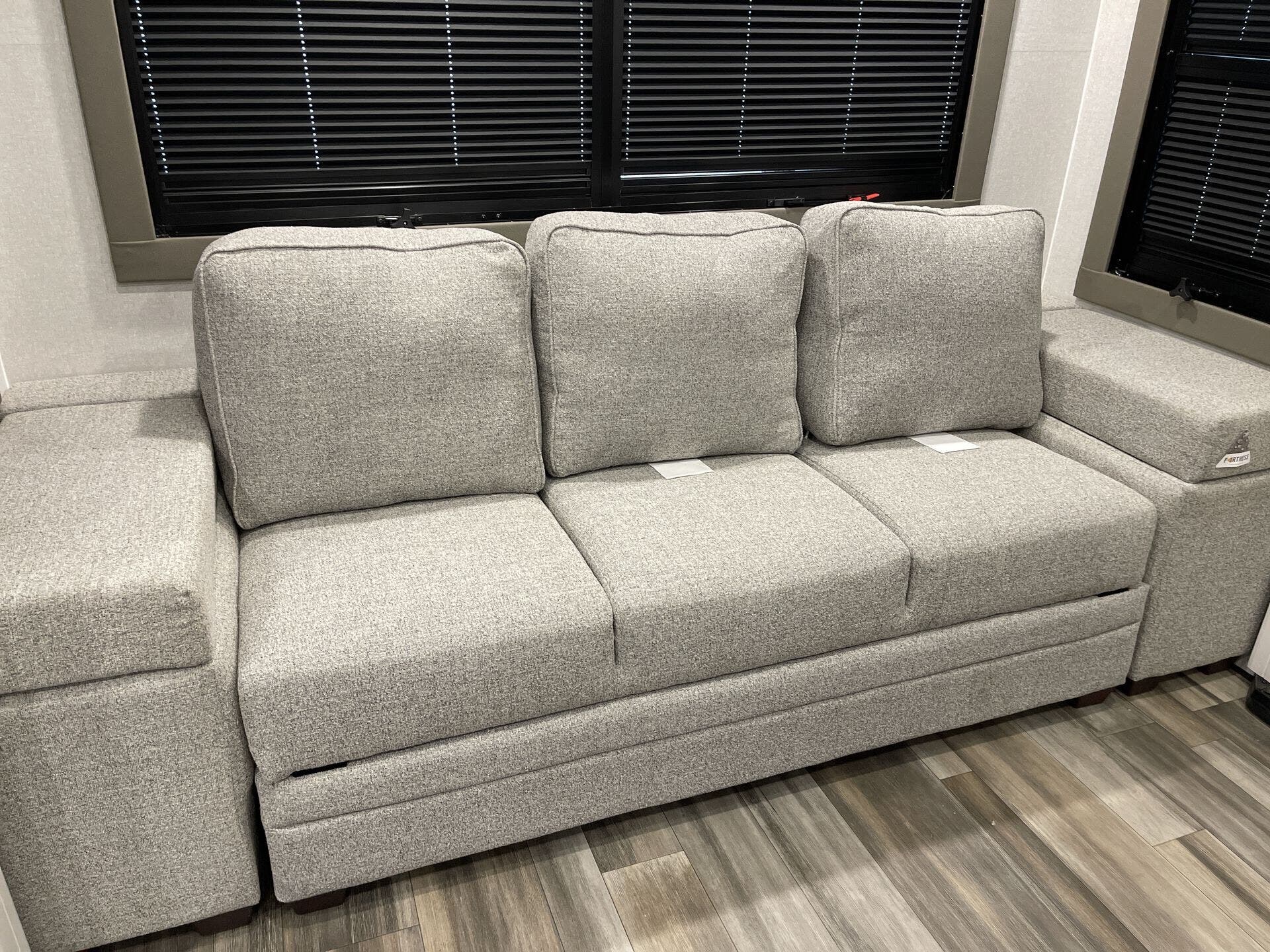 The front master bedroom boasts a king-size bed, large wardrobe, and washer/dryer prep, ensuring a restful retreat. The bathroom features a shower, toilet, and sink, providing all the comforts of home. Additional amenities include four slide-outs, dual power awnings, dual 15,000 BTU air conditioners, and a 40,000 BTU furnace, providing comfort in various climates. The exterior offers an outdoor kitchen with a grill, sink, and refrigerator, perfect for al fresco dining.