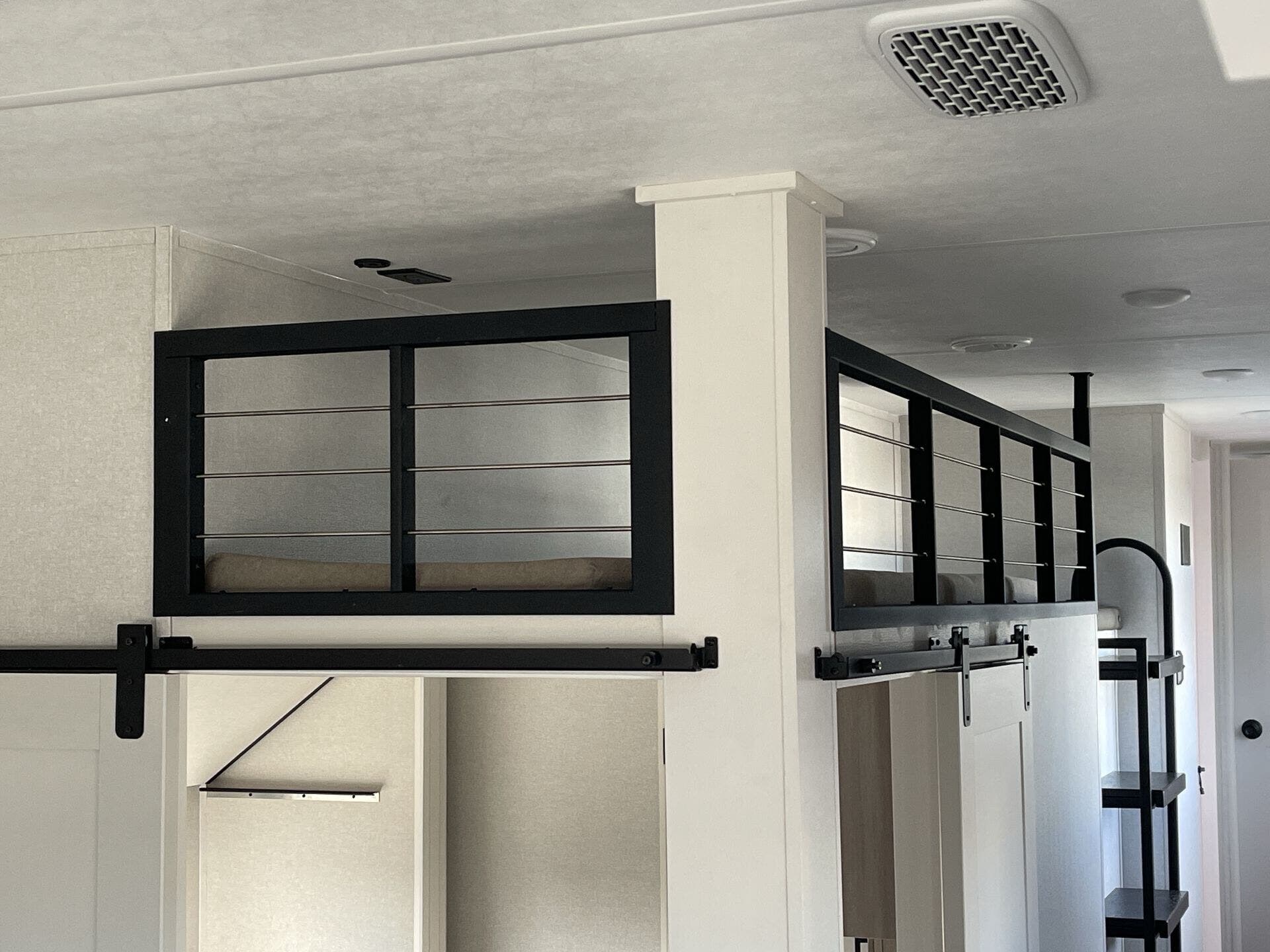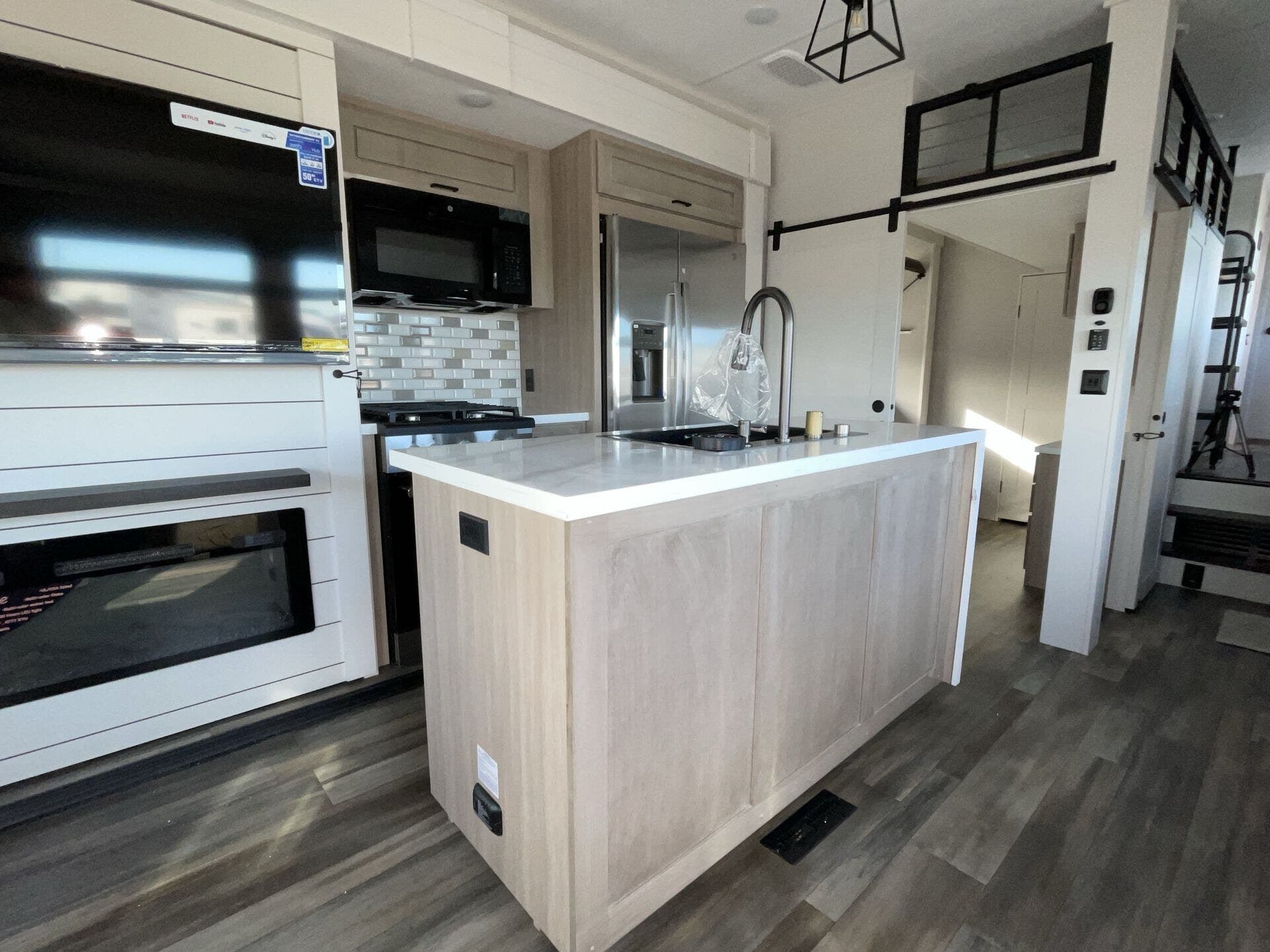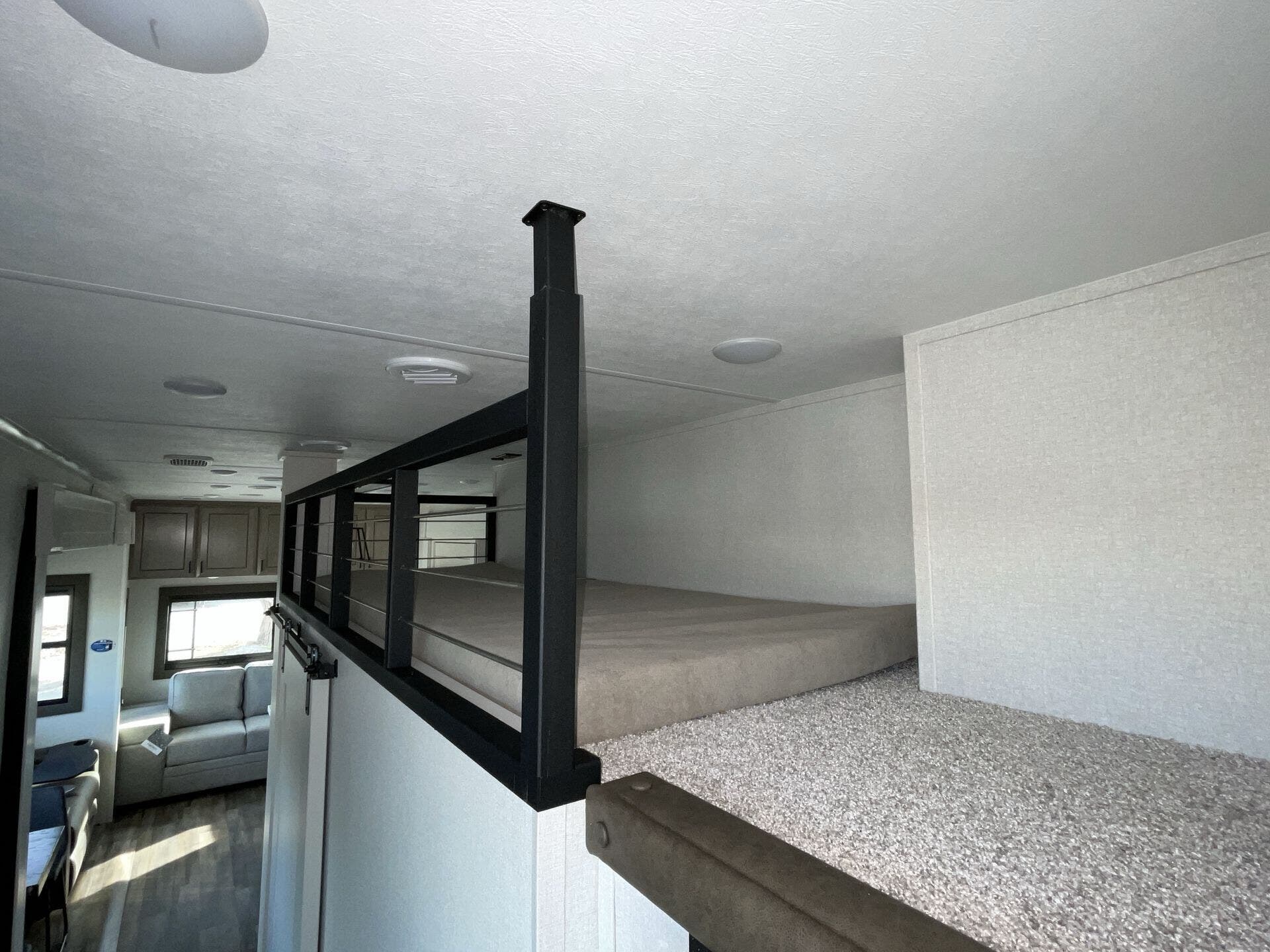 Up front you get a private bedroom that feels like its own space, and in the back there’s a bunkhouse that’s awesome for kids, guests, or just extra storage when you’re traveling without a full crew. The kitchen is one of the standout areas — lots of counter space, a good fridge, and enough room to actually cook without feeling cramped.