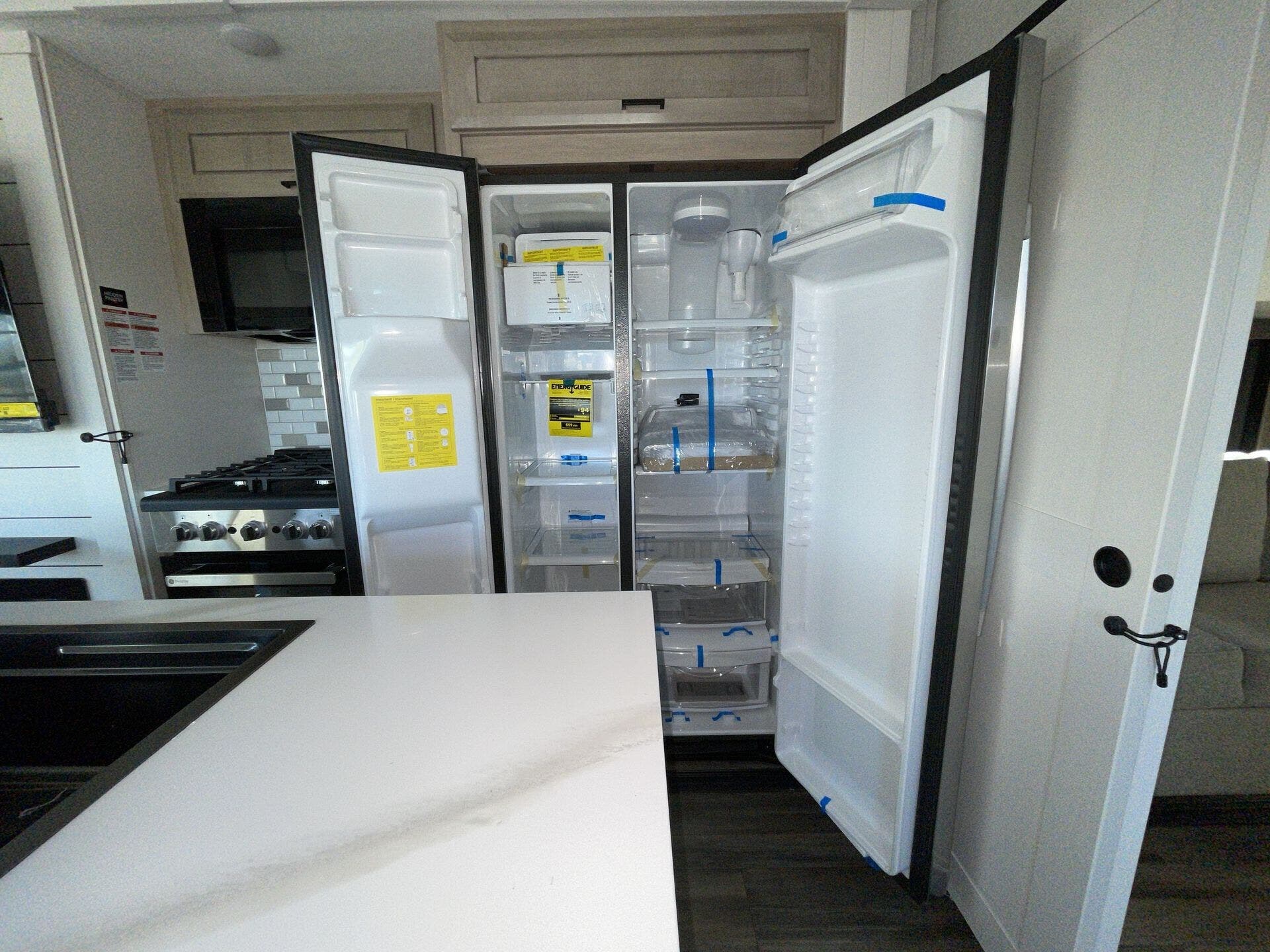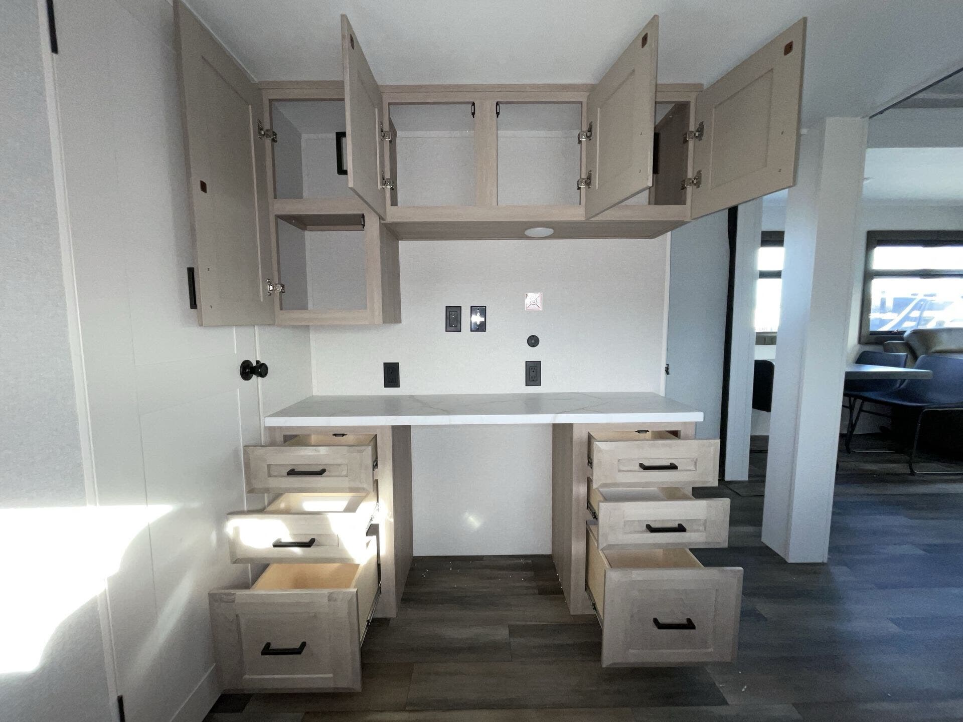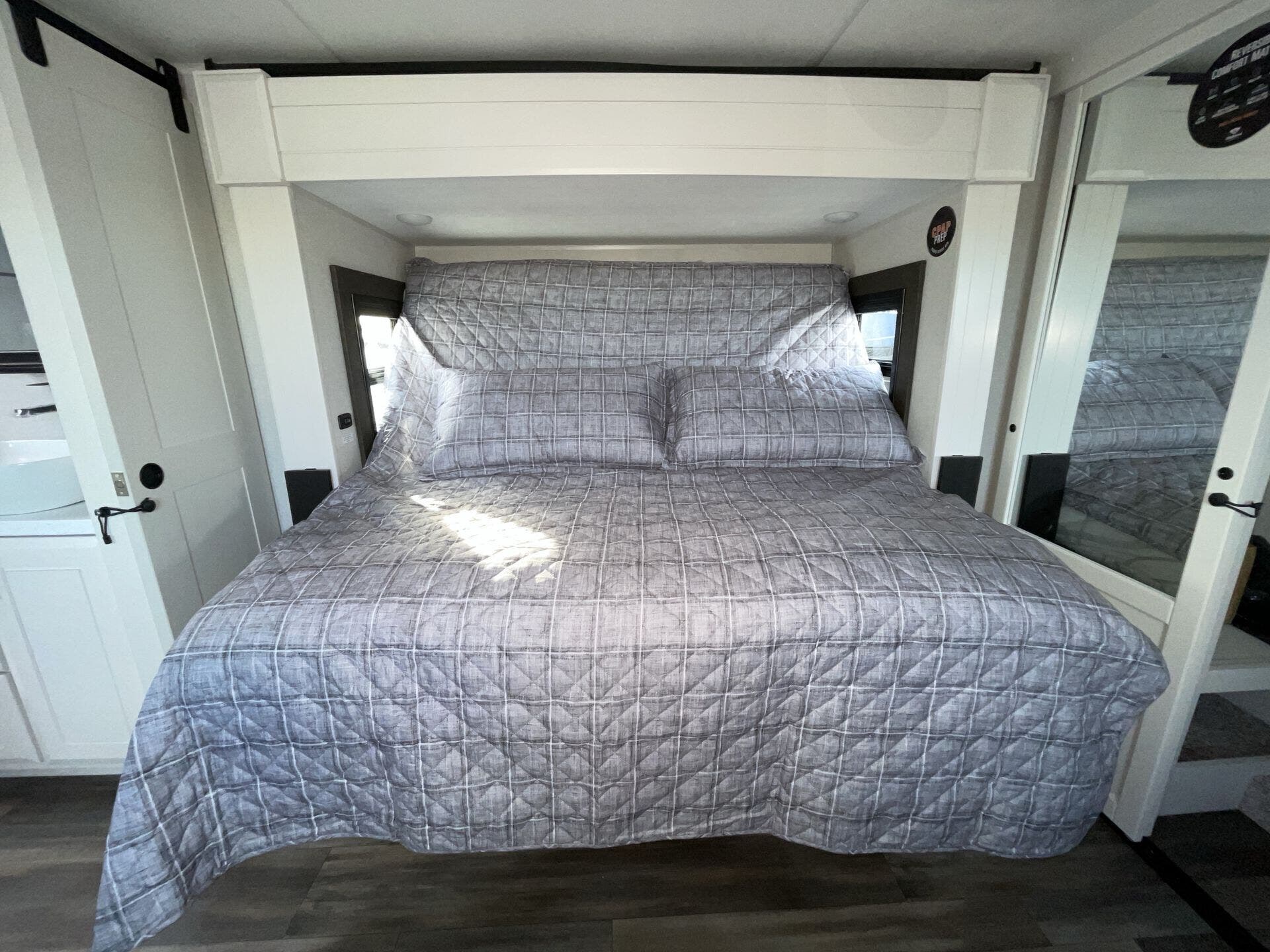 Up front you get a private bedroom that feels like its own space, and in the back there’s a bunkhouse that’s awesome for kids, guests, or just extra storage when you’re traveling without a full crew. The kitchen is one of the standout areas — lots of counter space, a good fridge, and enough room to actually cook without feeling cramped.