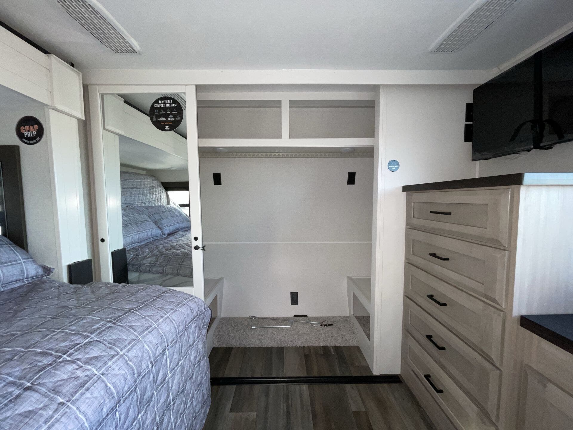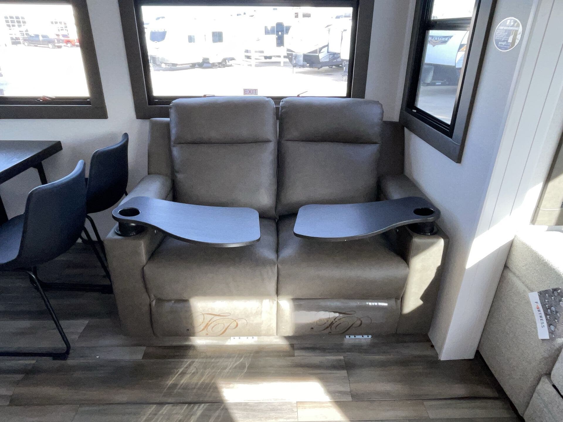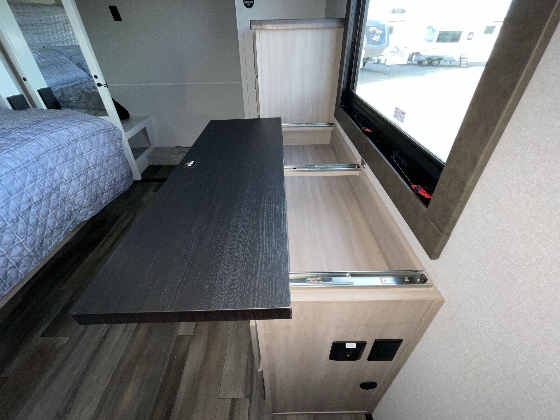 Booth Dinette, Bunk Beds, Bunkhouse, Central Vacuum, Dinette, Fireplace, Glass Shower Door, King Size Bed, Kitchen Sink, Medicine Cabinet, Overhead Cabinetry, Pantry, Roof Vents, Shower, Sofa Bed, Solid Surface Countertops, Theater Seating, Wardrobe(s), Washer/Dryer Prep -