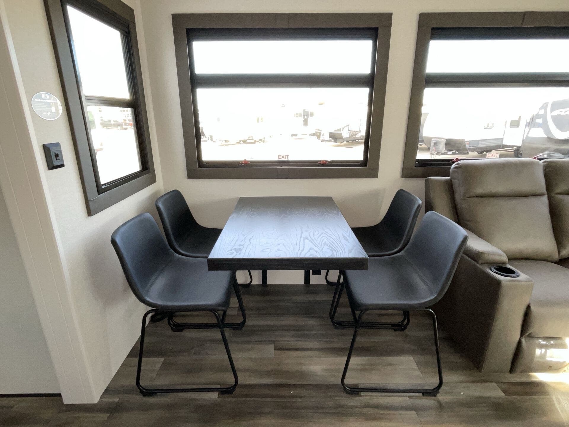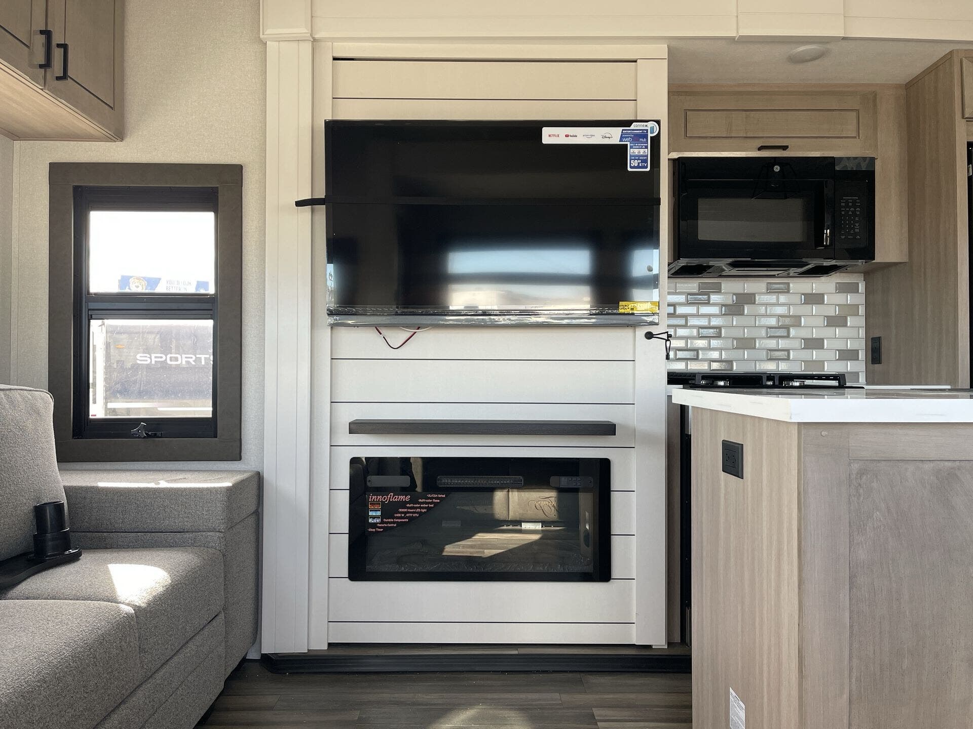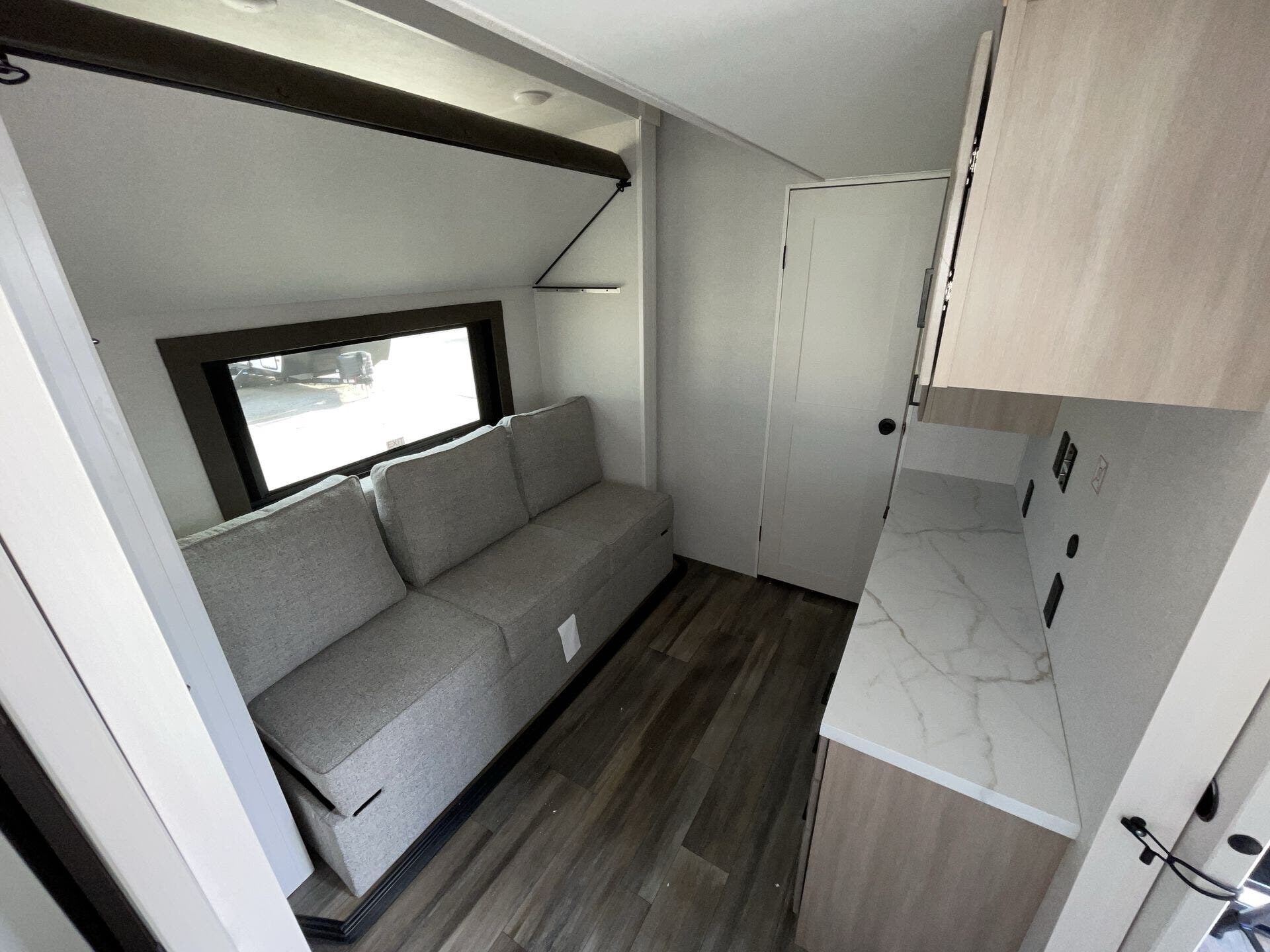 The living/dining area is comfy and set up for hanging out, eating, or watching a movie at night. The tankless water heater and solid tank capacities make longer trips easier, and the insulation/climate setup means it’s not just a fair-weather rig.
