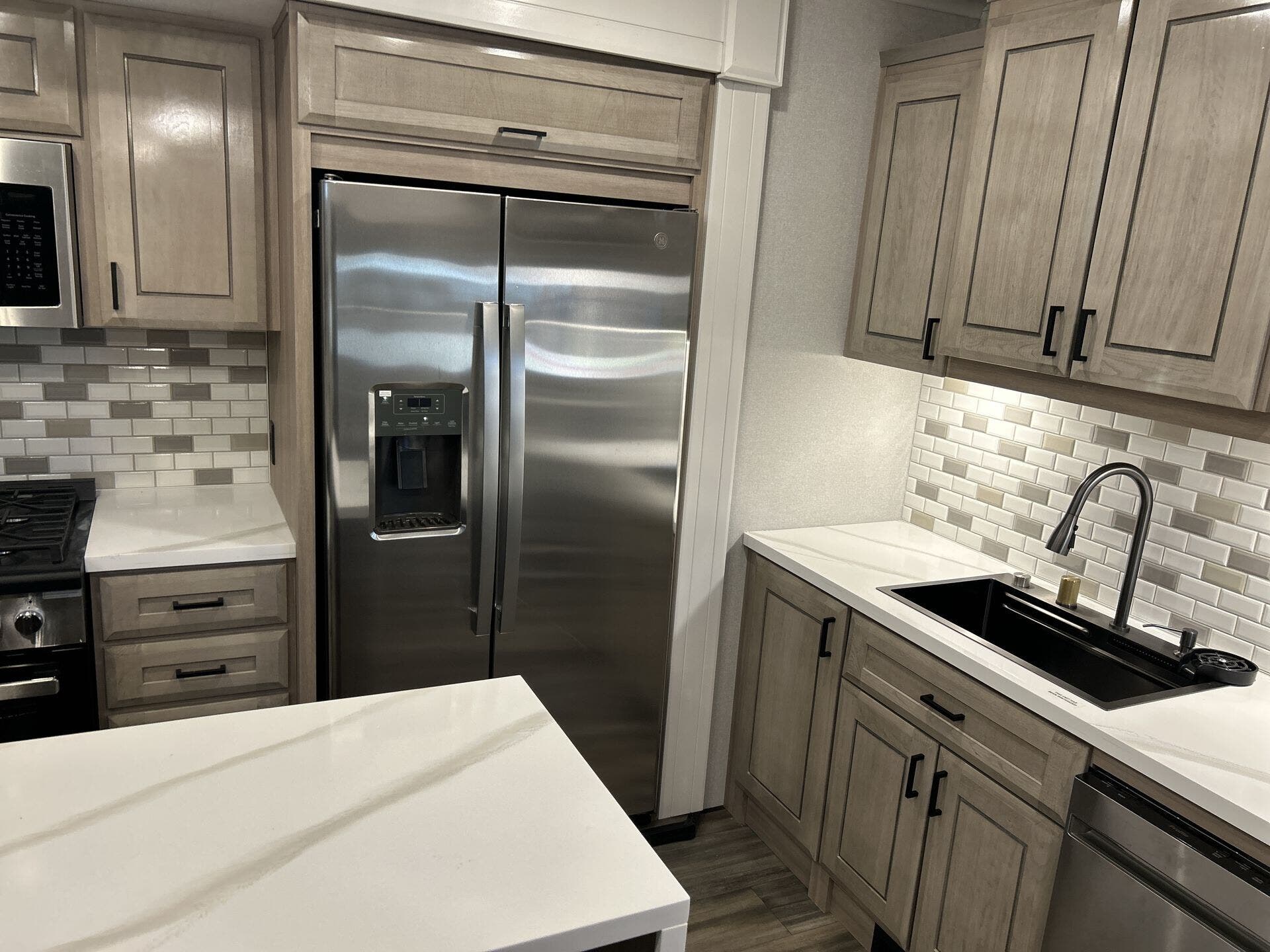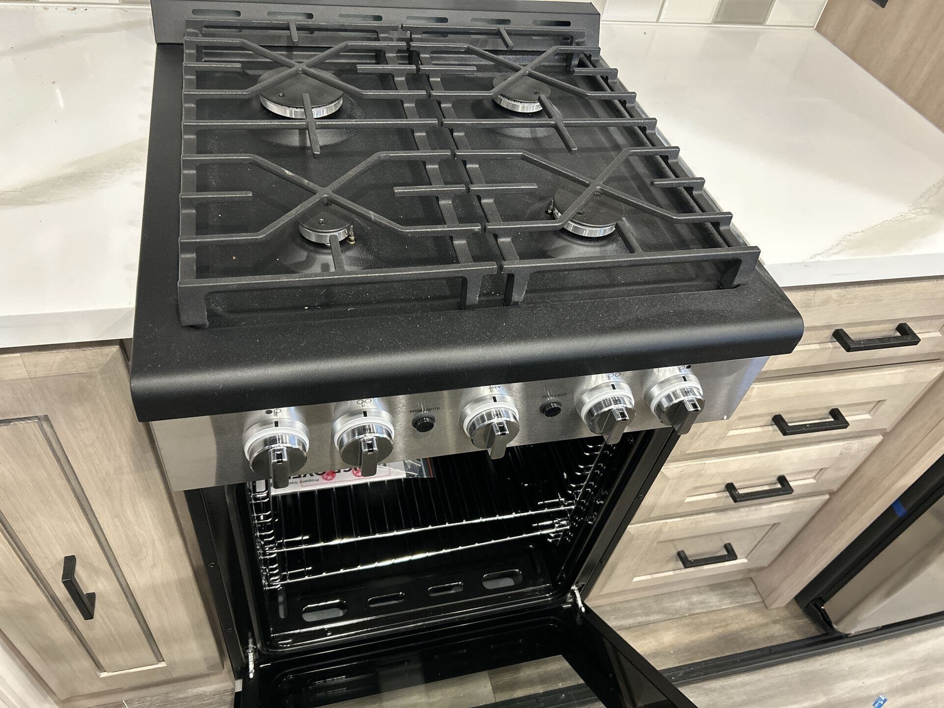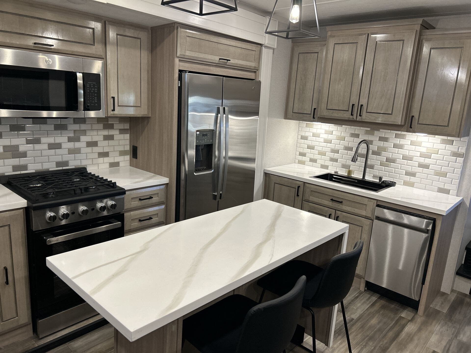 - Slideouts expand interior space to make room for the full kitchen, dining, and living areas