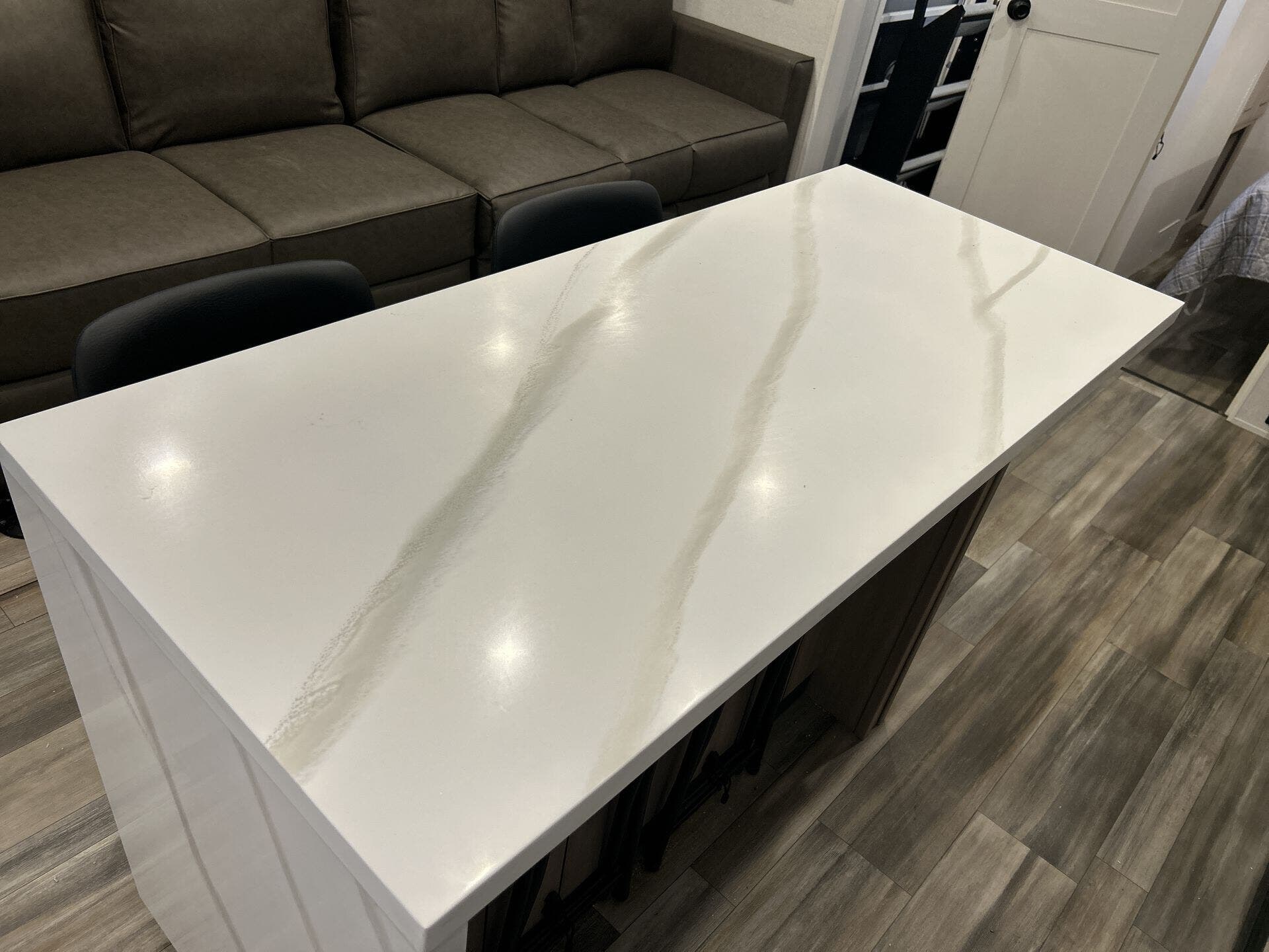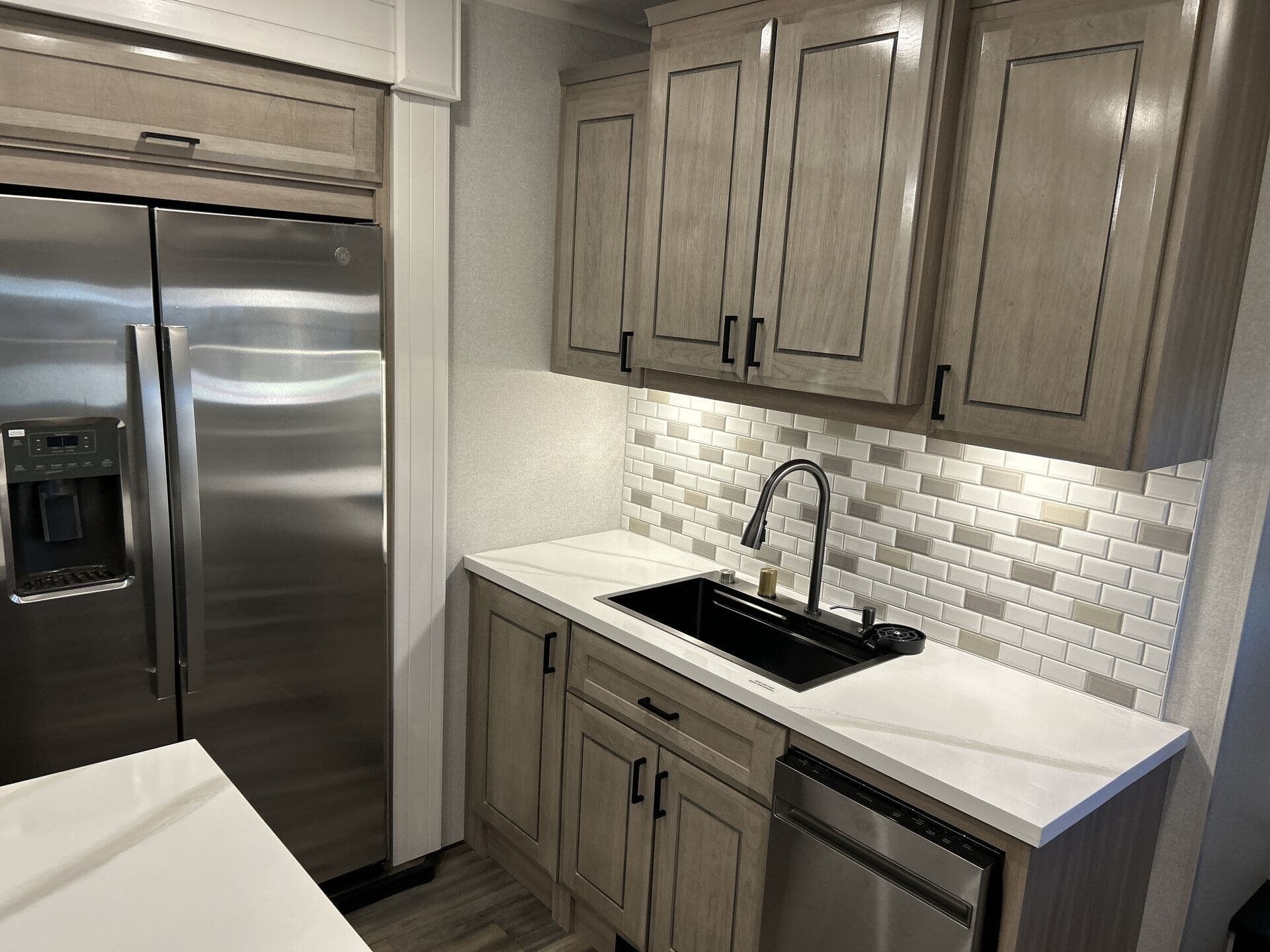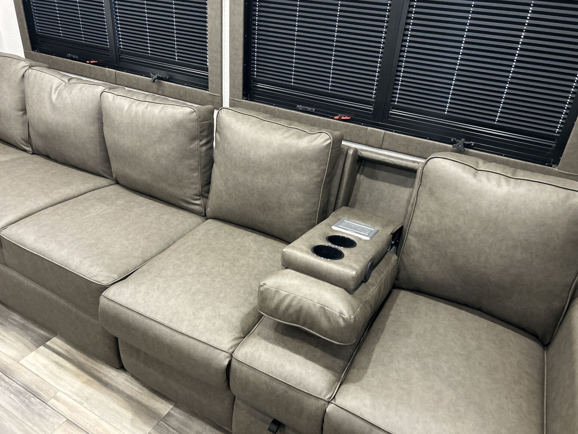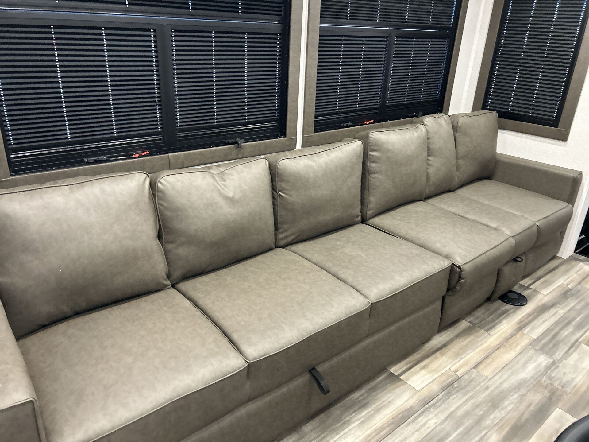 - Slideouts expand interior space to make room for the full kitchen, dining, and living areas