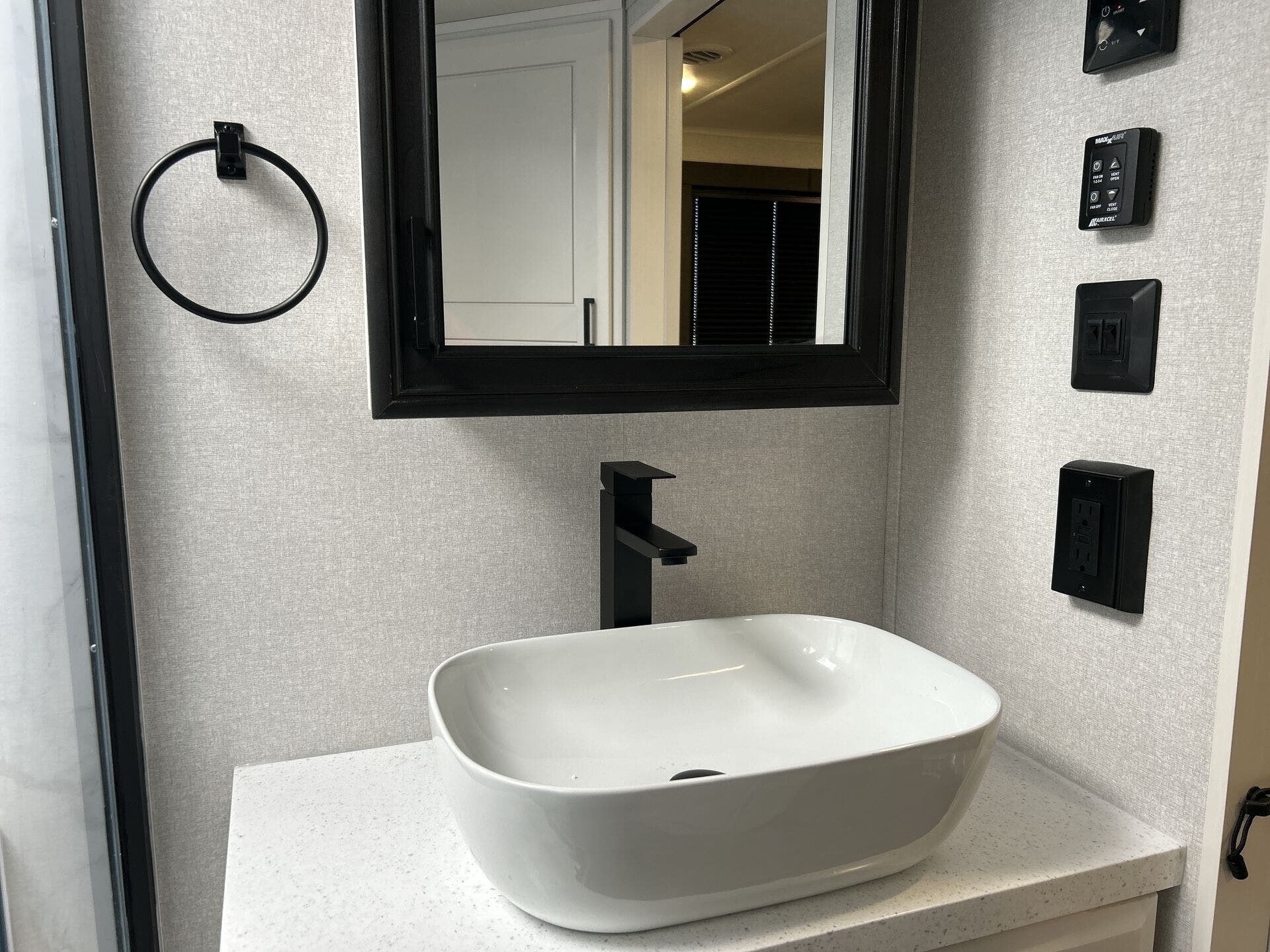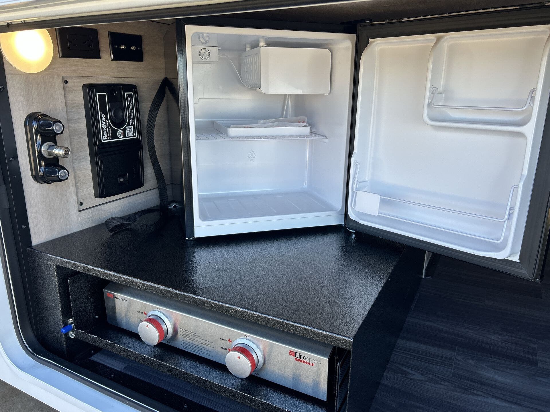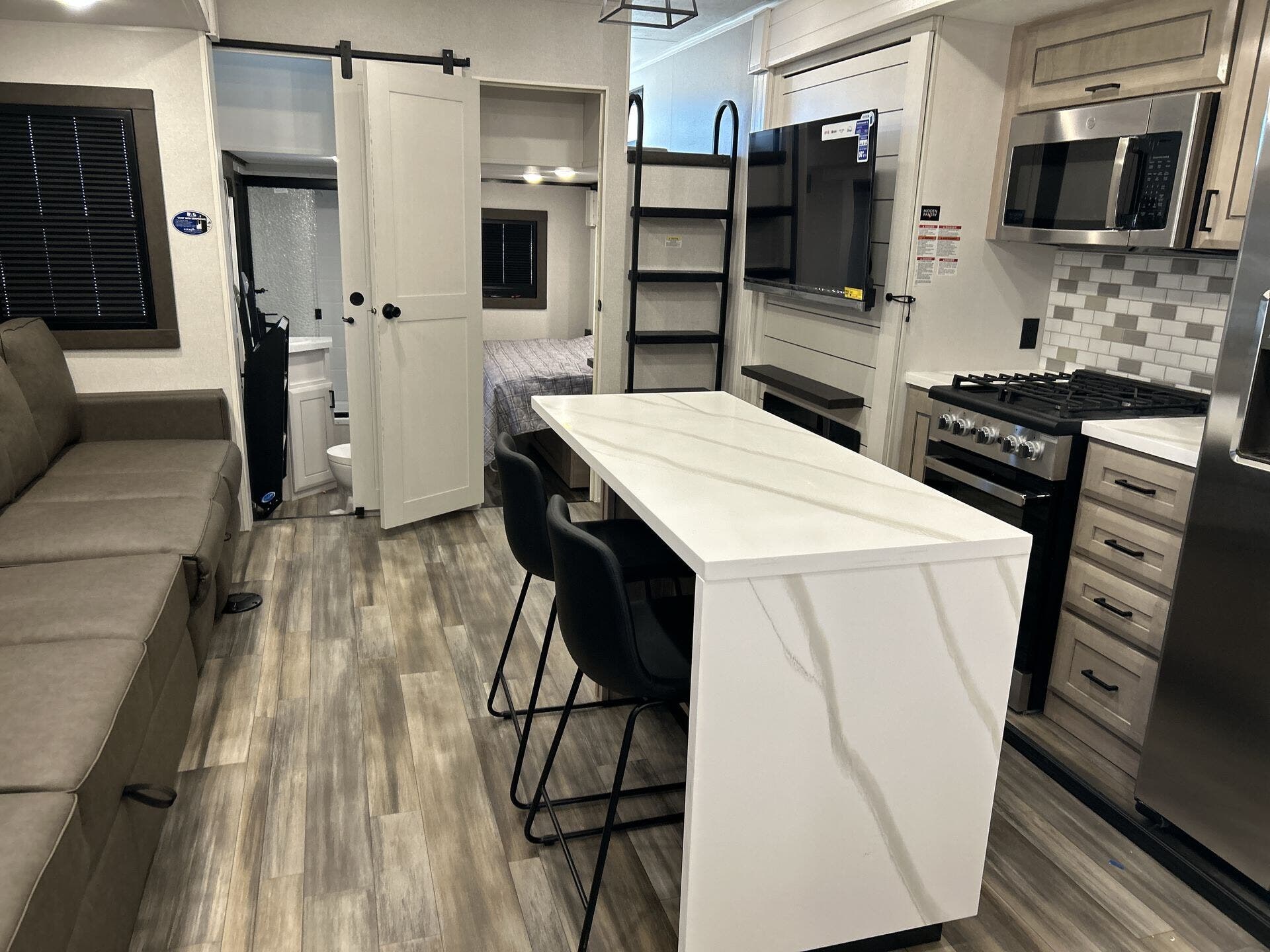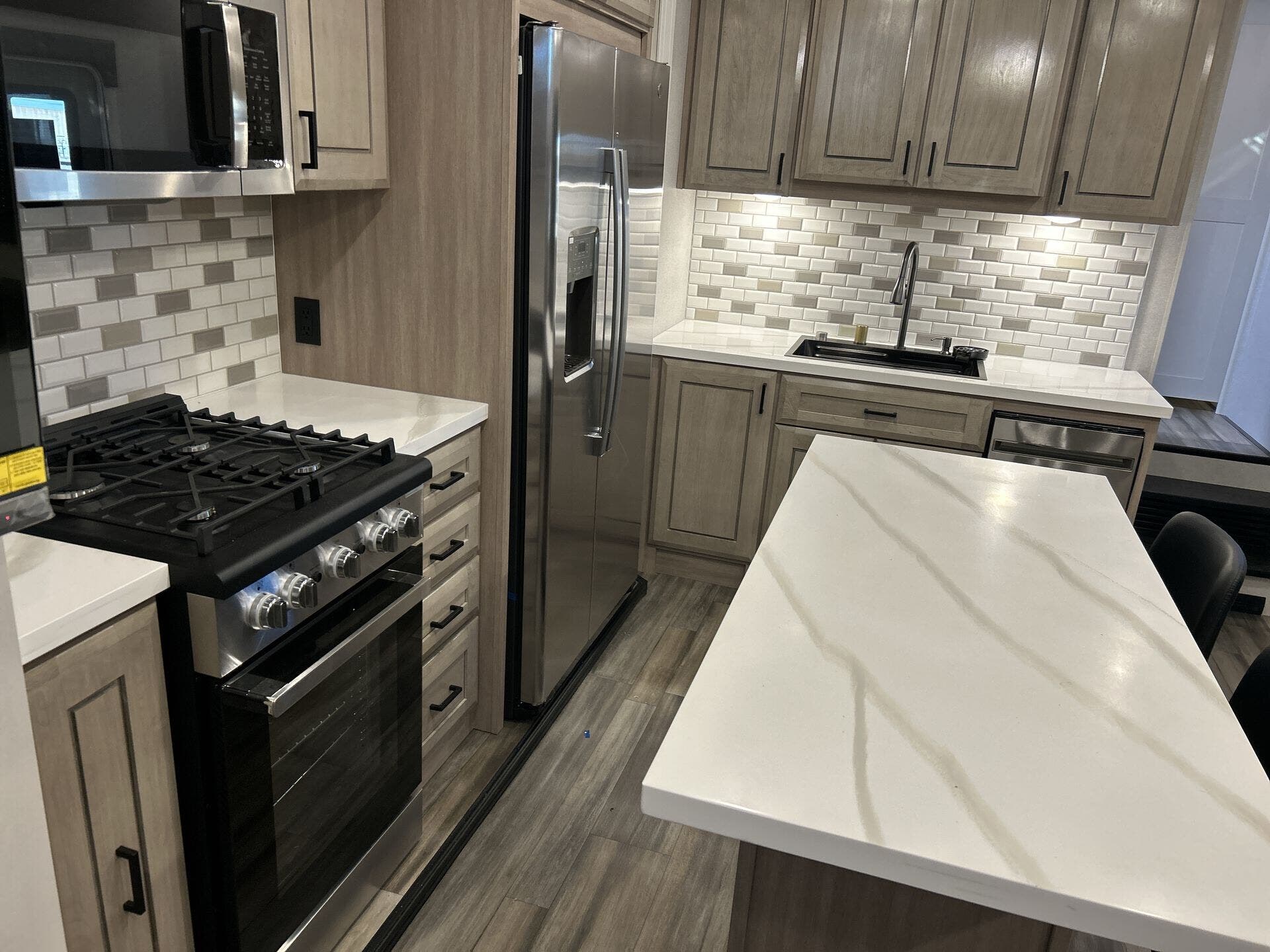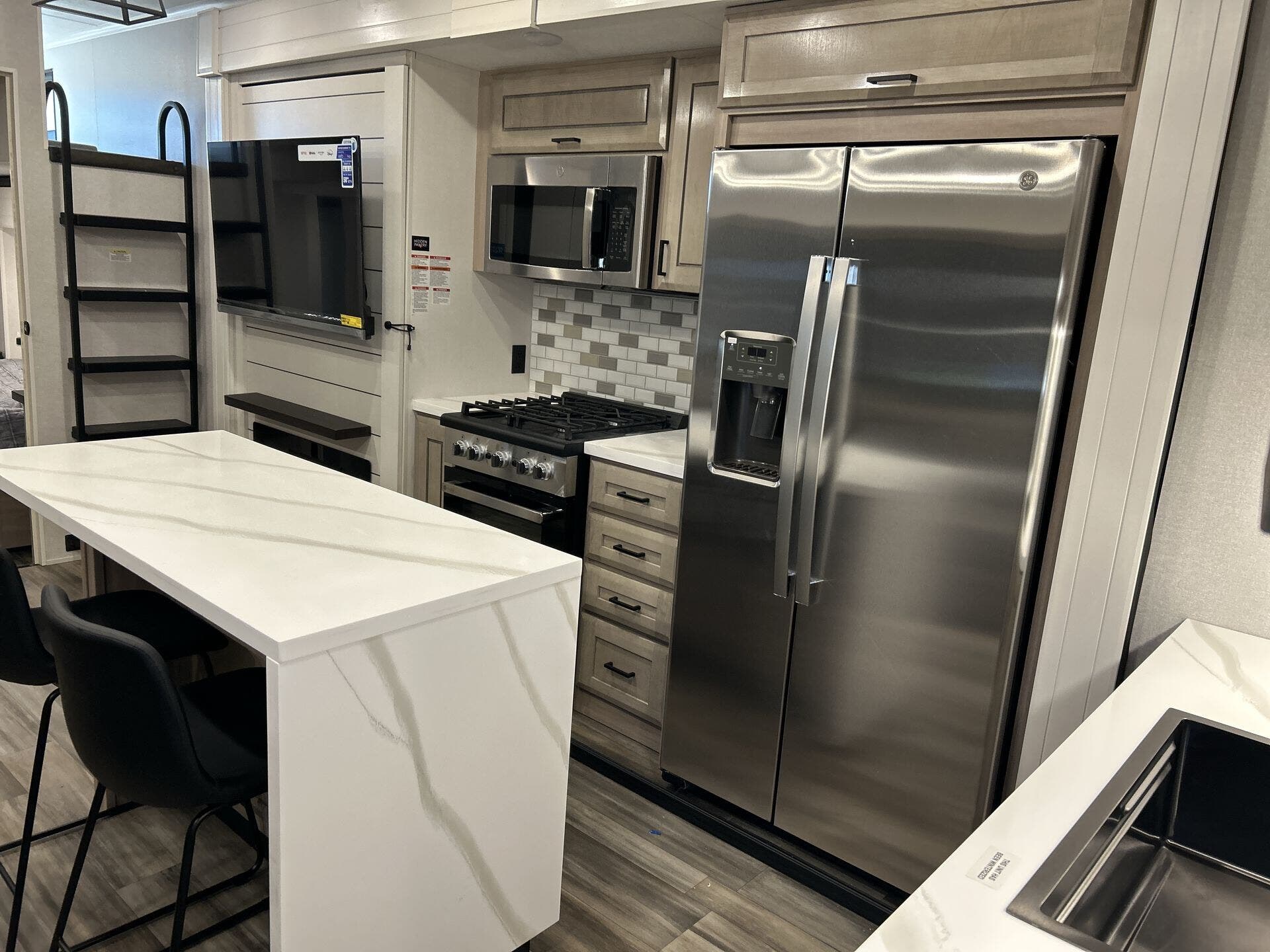The Open Range 3X focuses on home-like living. It features a kitchen island, pantry, and residential refrigerator, plus a microwave, stove top burner, and a large kitchen sink. Day and night shades provide flexible lighting and privacy, while theater seating and multiple seating arrangements create a welcoming entertainment zone. A king-size bed and a secondary queen bed, along with a removable table, ensure flexible sleeping and dining options for up to eight guests.
