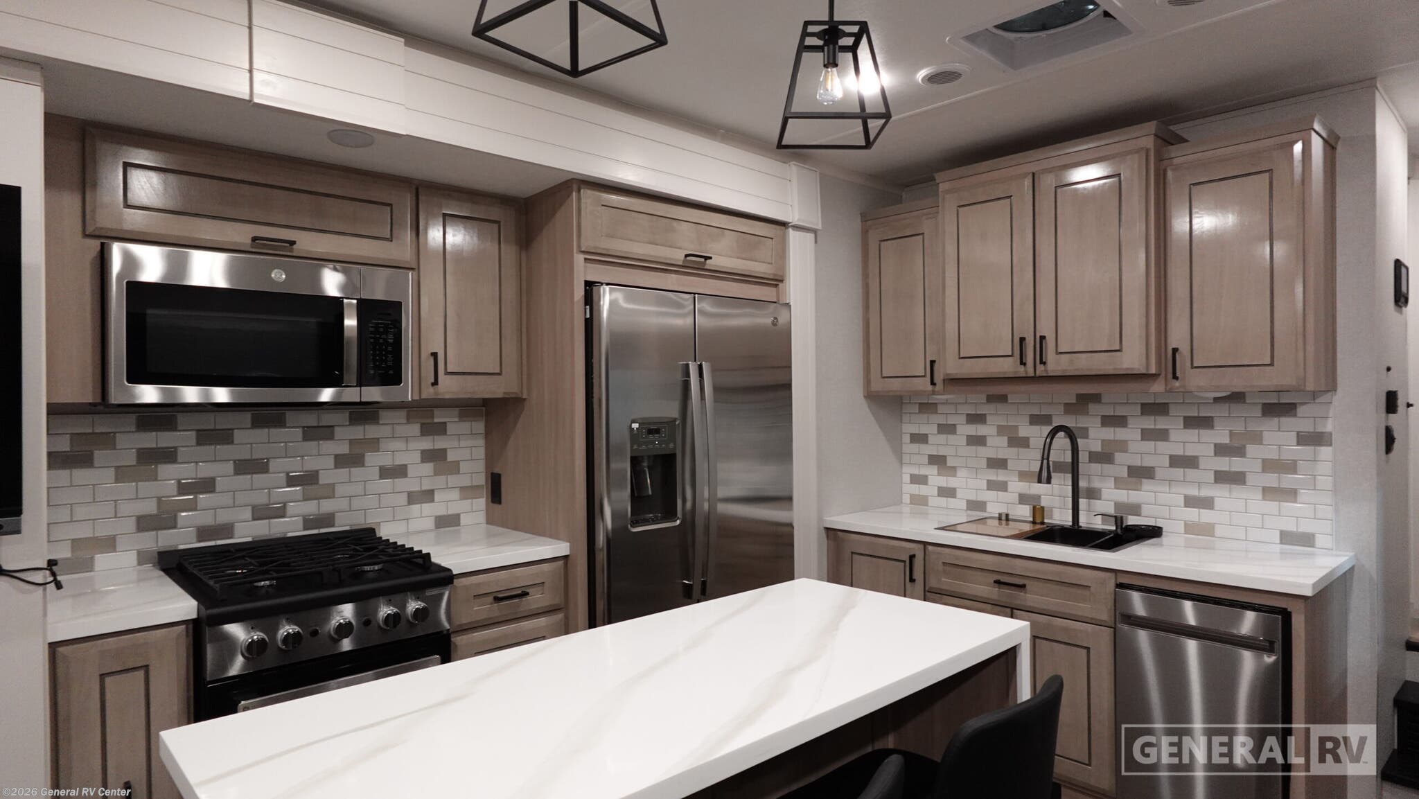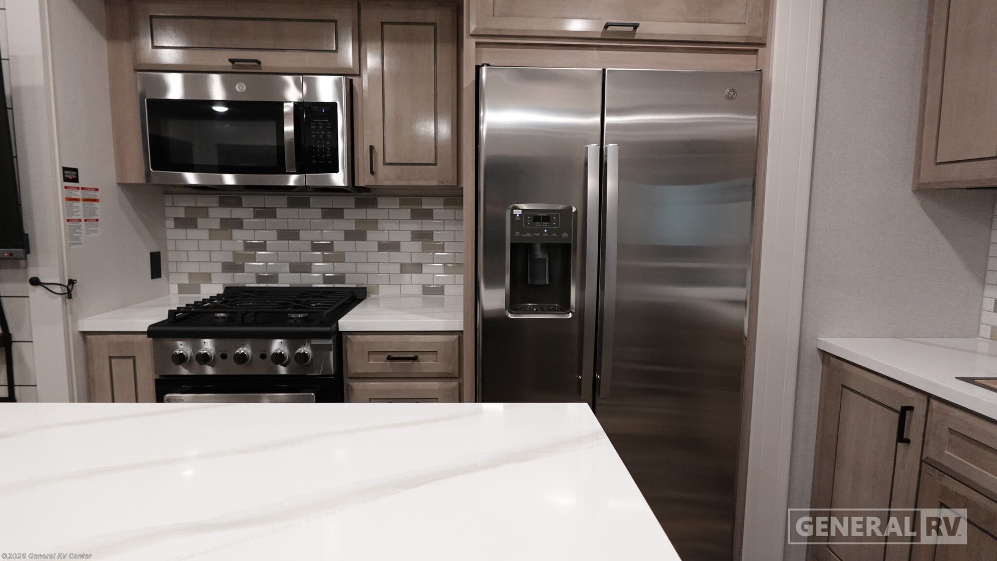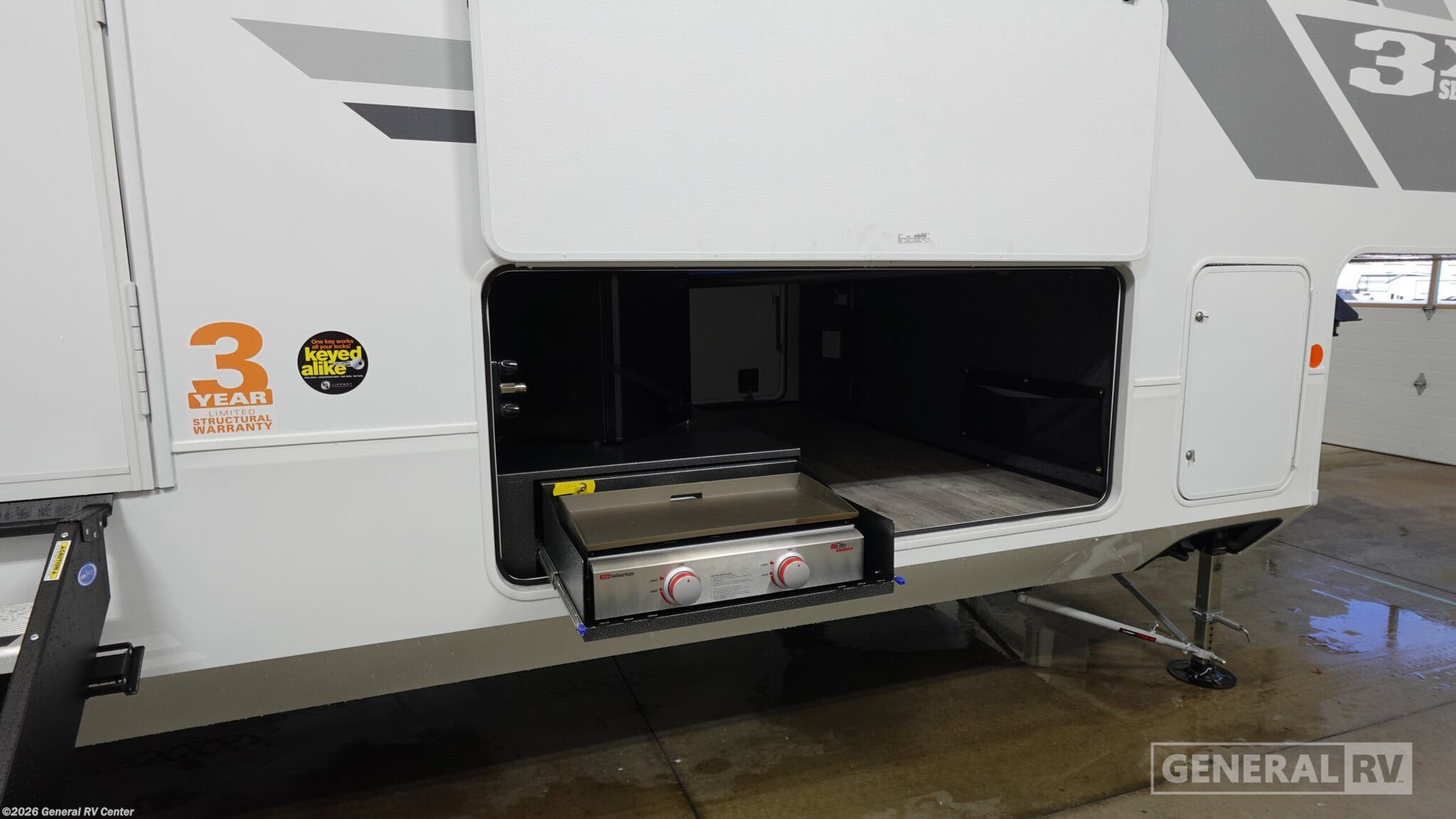 **Open Range RV Open Range 3X fifth wheel 390TBS highlights:** * Four Slide Outs * Two Master Bedrooms * Two Power Awnings * Loft * Dual Entry Doors * Outdoor Kitchen If you enjoy luxury camping or you're looking for a residential fifth wheel to go full-time in, this Open Range 3X is the one! The middle kitchen and living room is made open by the dual opposing slides, and your crew can get comfortable on the mega lounge with two tables. The chef of your group will love cooking on GE free-standing four burner range, or they can use the GE residential microwave to heat up leftovers. The standard dishwasher and central vacuum make cleanup a breeze. A waterfall island with four chairs will provide a place to dine and the hidden pantry behind the swing-out entertainment center can hold snacks galore. There is also a fireplace and smart HDTV to make movie nights cozy. The front master bedroom includes a slide out king bed with a power tilt, two dressers, a large front closet, and a 32" TV to watch shows in bed. You even have your own entrance into the full bath, plus washer and dryer prep. The rear master bedroom is just as accommodating with a queen bed slide out, a wardrobe and a dresser, plus a second full bath with its own exterior entry door. And the loft above the rear bedroom provides even more sleeping space. With any Open Range 3X fifth wheel by Open Range RV, you will enjoy residential luxuries and an exceptional build. The TuffShell construction includes vacuum bonded laminated fiberglass and welded aluminum frames for added strength, and the PVC roofing membrane is ultra durable. You can plan to camp year around or go full-time since there is a mandatory Four Season Package that includes a heated and enclosed underbelly, a 40K BTU high-performance furnace, double insulated baggage doors, and more. The residential features continue on with the mandatory Executive Package with the TravelLINK Smart RV system, Keyed-Alike entry and baggage doors, painted fiberglass front cap with LED lighting, and three 15,000 BTU A/C units with quiet residential return air. Inside, you'll enjoy GE kitchen appliances, sleek square windows with integrated blinds, ceramic subway tile backsplash, a glass shower door, and the list of amenities goes on!